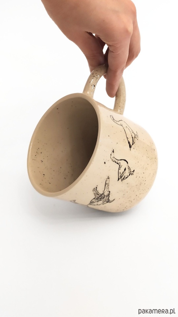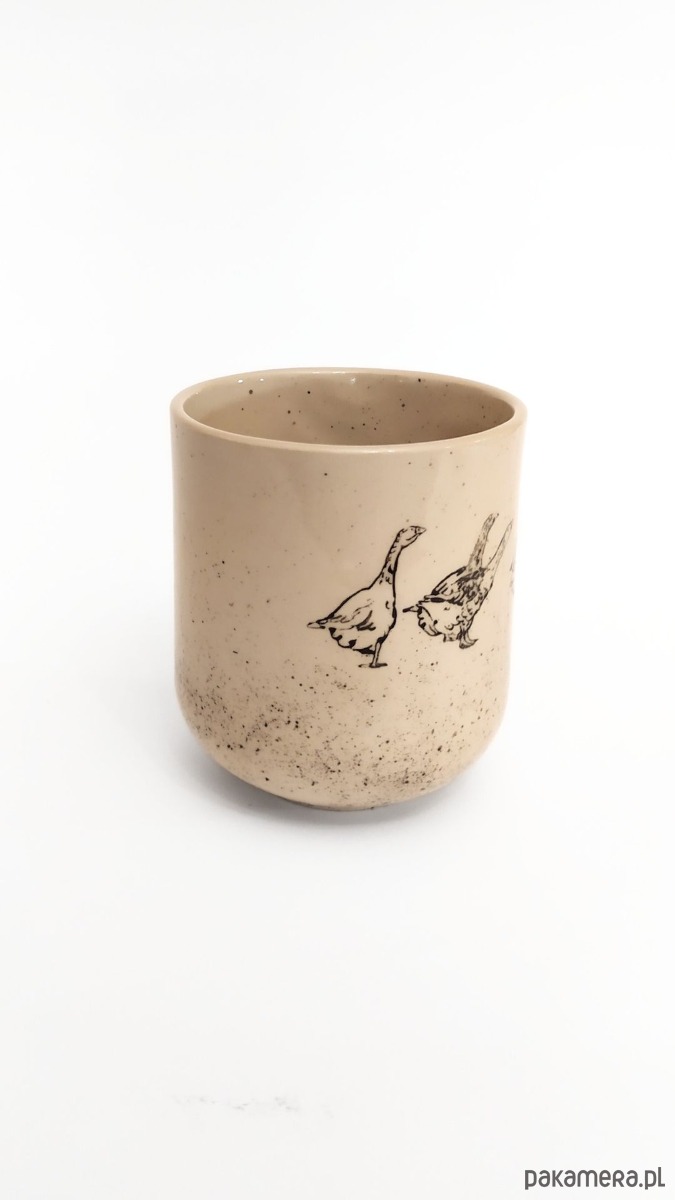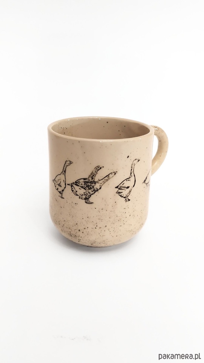 Kubek z motywem gąsek. Malowany farbami podszkliwnymi, wykonany z wysokiej jakości kremowej gliny, 100% handmade. Wypalany dwukrotnie, sygnowany.