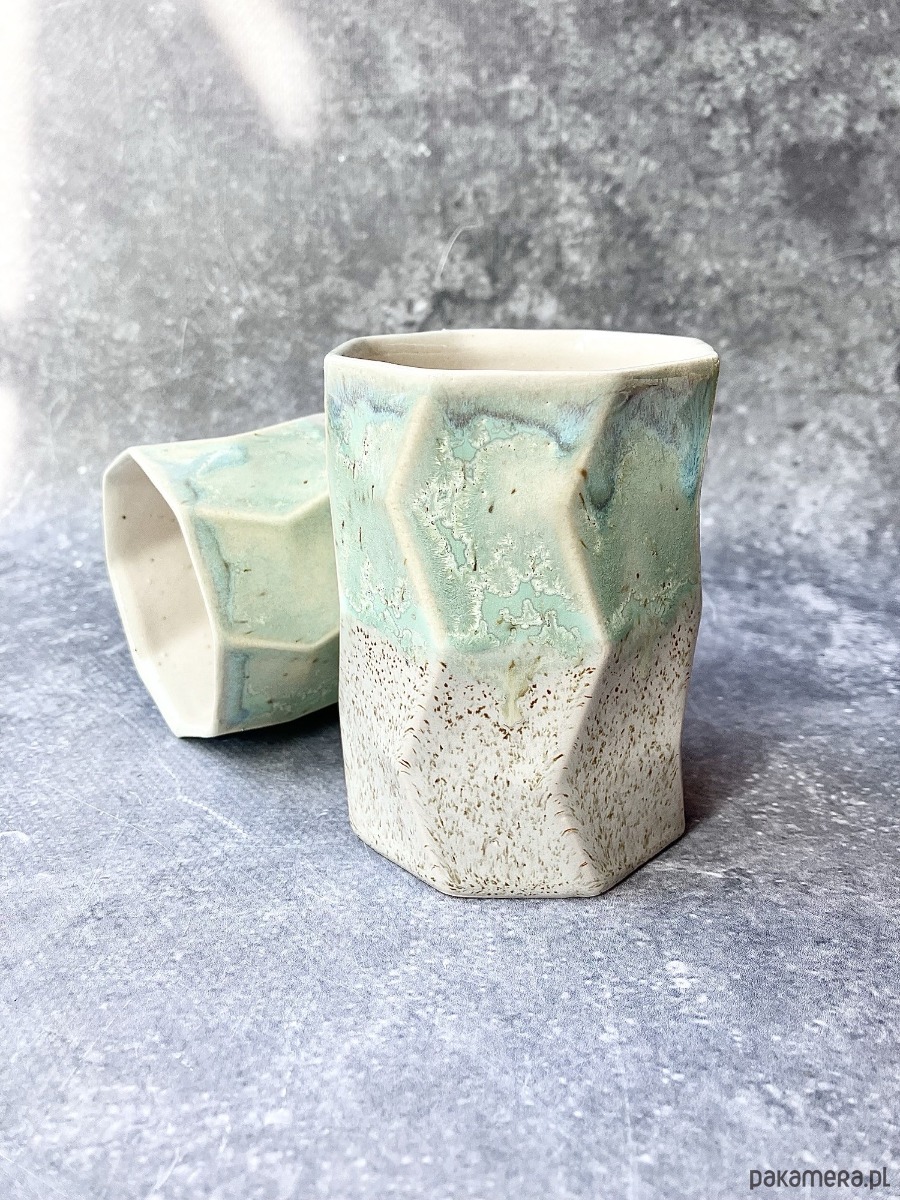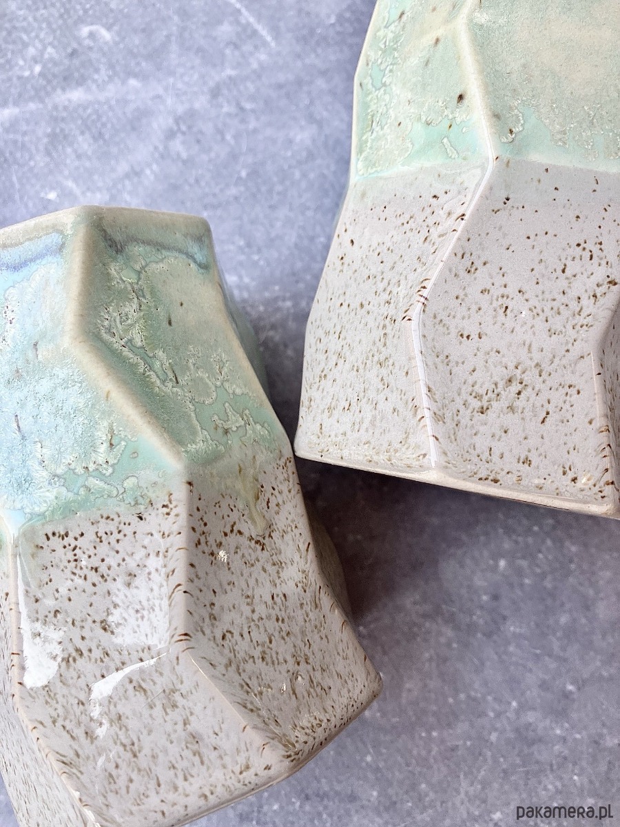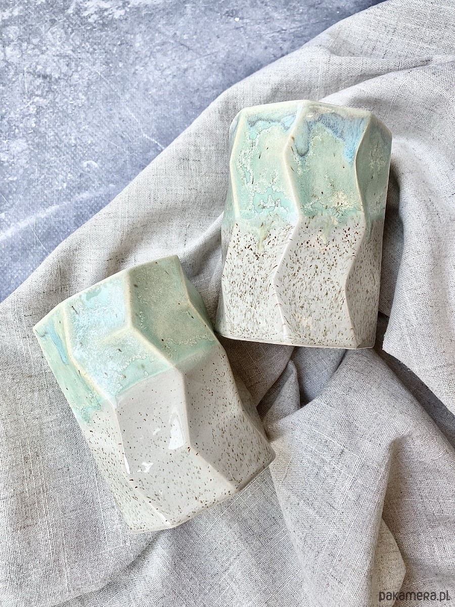 Górną część zdobi szkliwo w odcieniach pistacji, mięty i delikatnego turkusu, z malowniczymi przejściami i krystalicznymi efektami. Dolna sfera pozostaje w piaskowo-kremowym, lekko nakrapianym tonie. To zestawienie sprawia, że każdy kubek jest jedyny w swoim rodzaju.