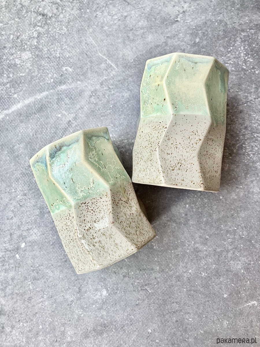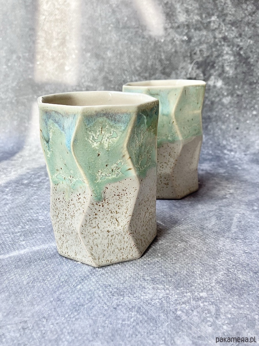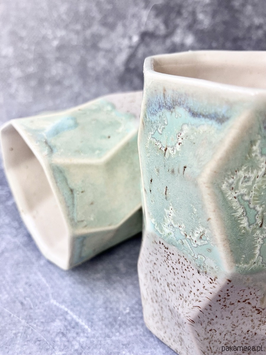 Górną część zdobi szkliwo w odcieniach pistacji, mięty i delikatnego turkusu, z malowniczymi przejściami i krystalicznymi efektami. Dolna sfera pozostaje w piaskowo-kremowym, lekko nakrapianym tonie. To zestawienie sprawia, że każdy kubek jest jedyny w swoim rodzaju.