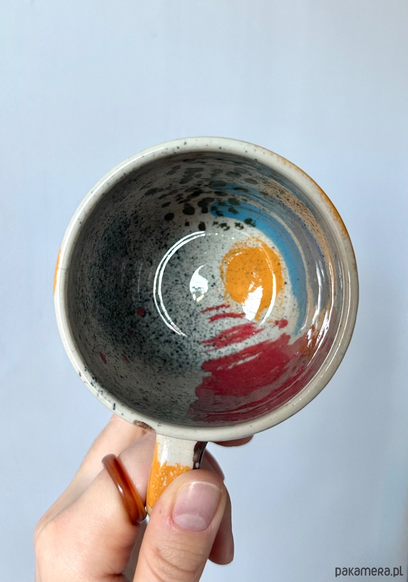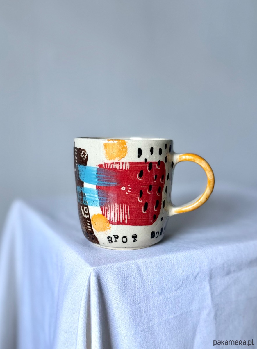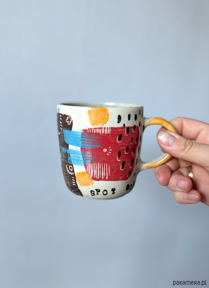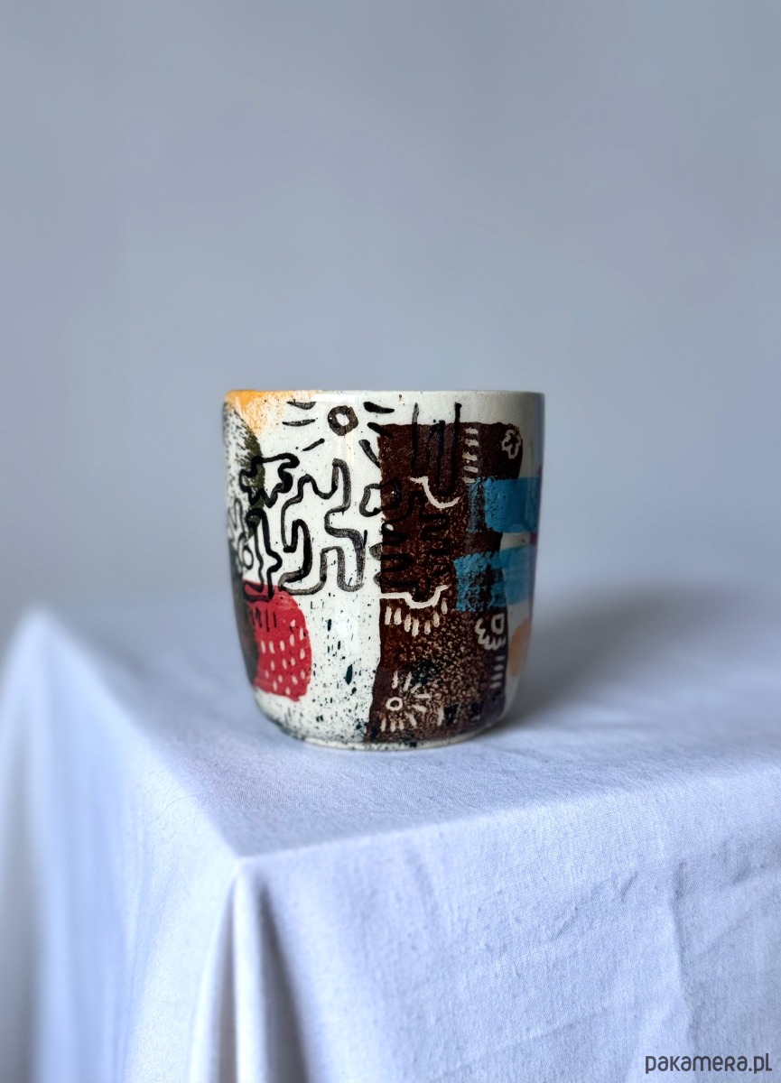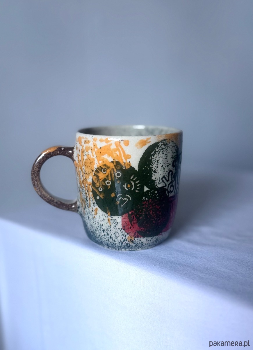 Kamionkowe, graficzne kubki zdobione angobami różnymi metodami oraz techniką sgraffito. Kubki zostały wytoczone na kole garncarskim z jasnej, szamotowej gliny. Abstrakcyjne plamy w odcieniach brązu, czerwieni, ciemnej zieleni, błękitu i pomarańczowego oraz malowane i żłobione detale przedstawiające uproszczone ludzkie sylwetki, symbole słońca i litery, nadają kubkowi graficzny charakter. Wygodne, spłaszczone ucho sprawia, że kubek idealnie leży w dłoni.