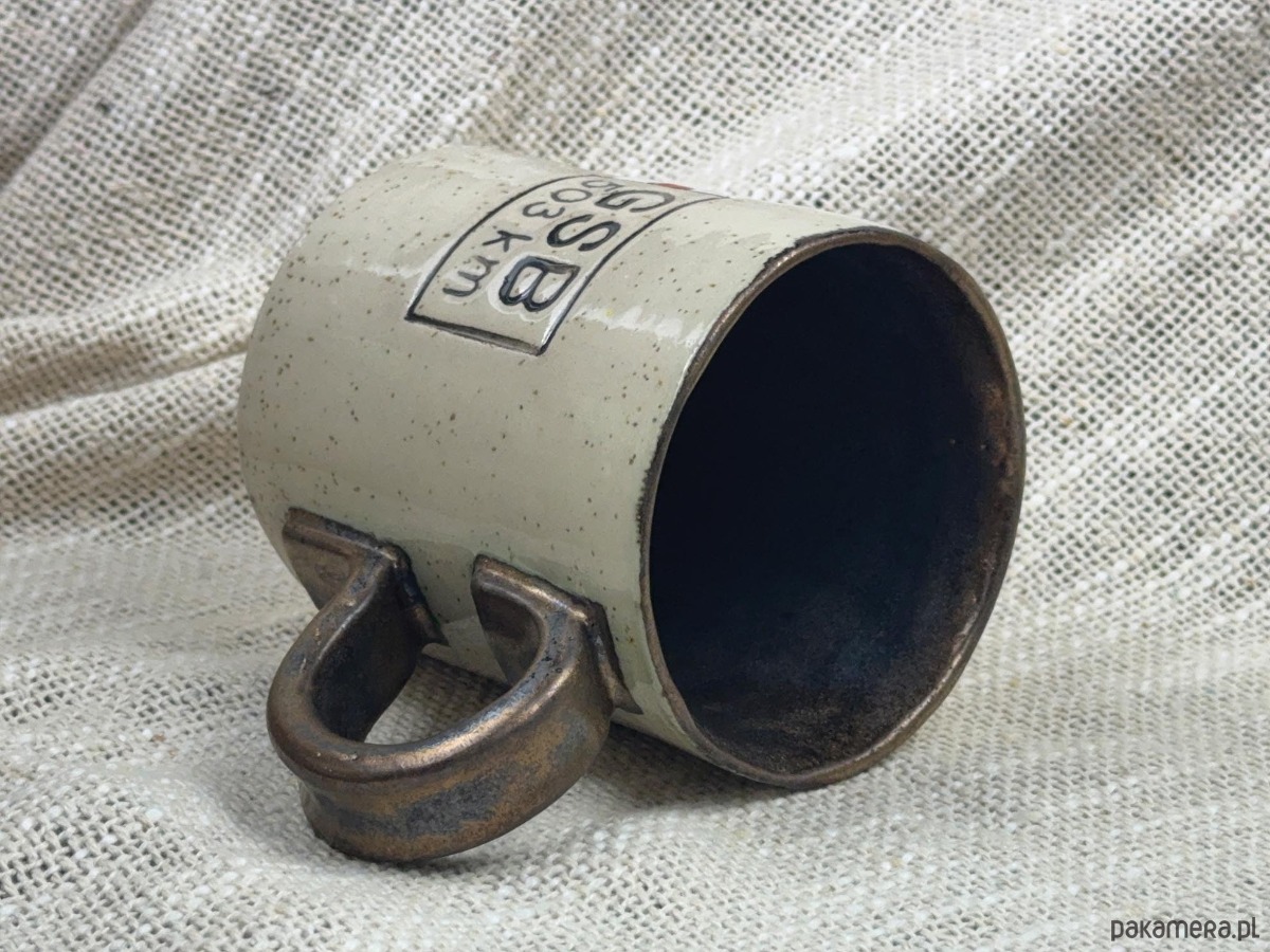 Zewnętrzna powierzchnia pokryta błyszczącym transparentnym szkliwem, wnętrze i ucho – miedziano-złotym.