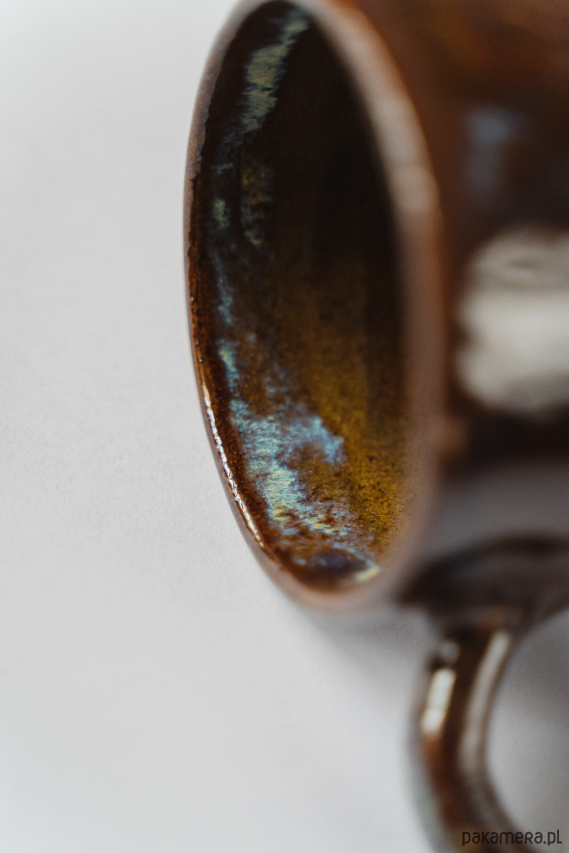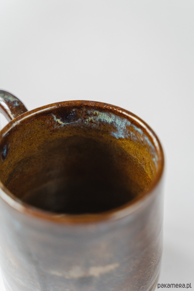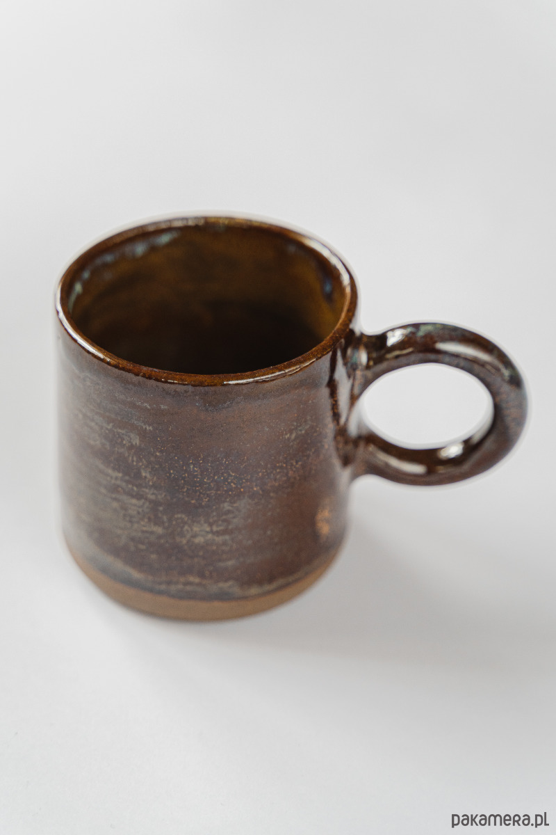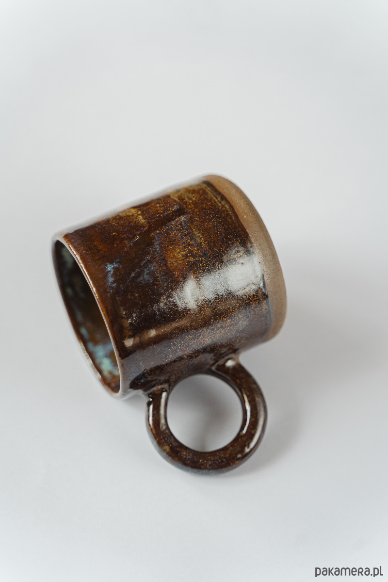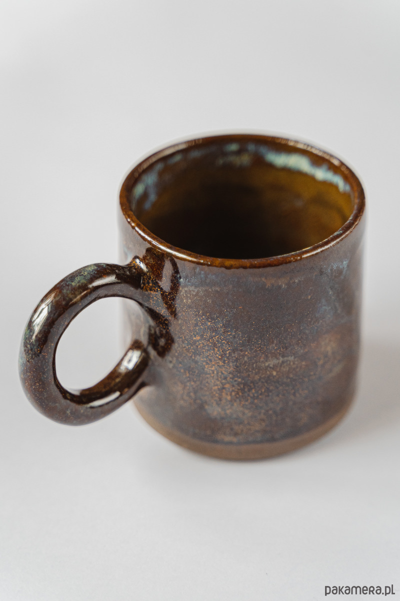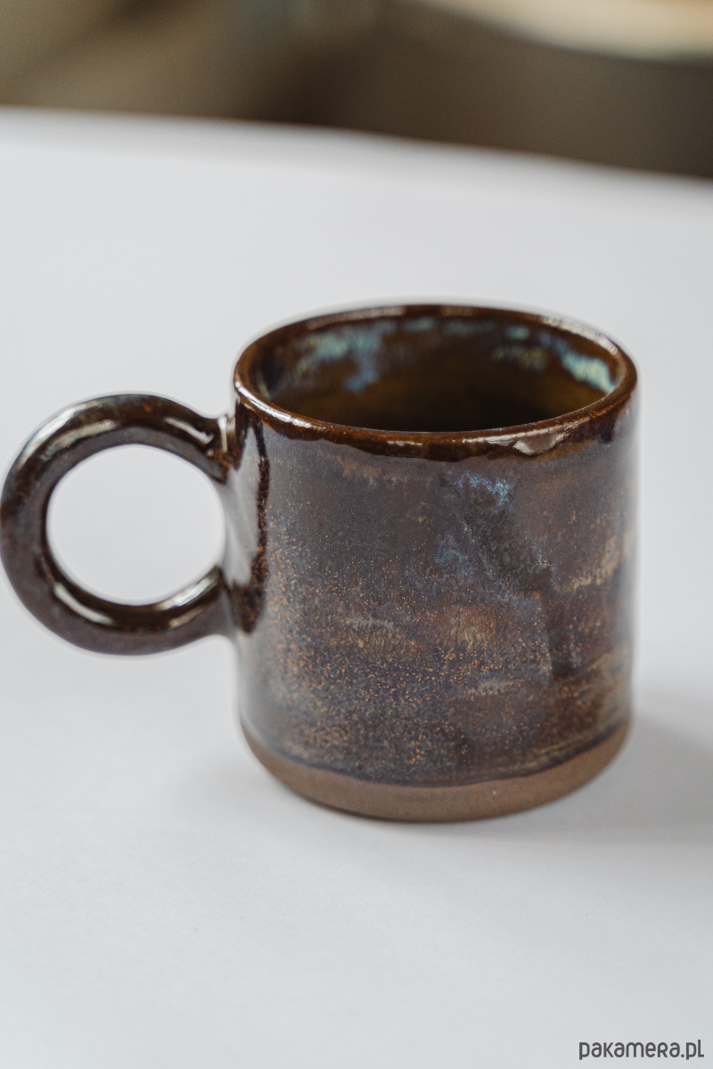 Ceramiczny kubek z uchem, wykonany ręcznie z ciemnej gliny, pokryty kilkoma rodzajami szkliwa.