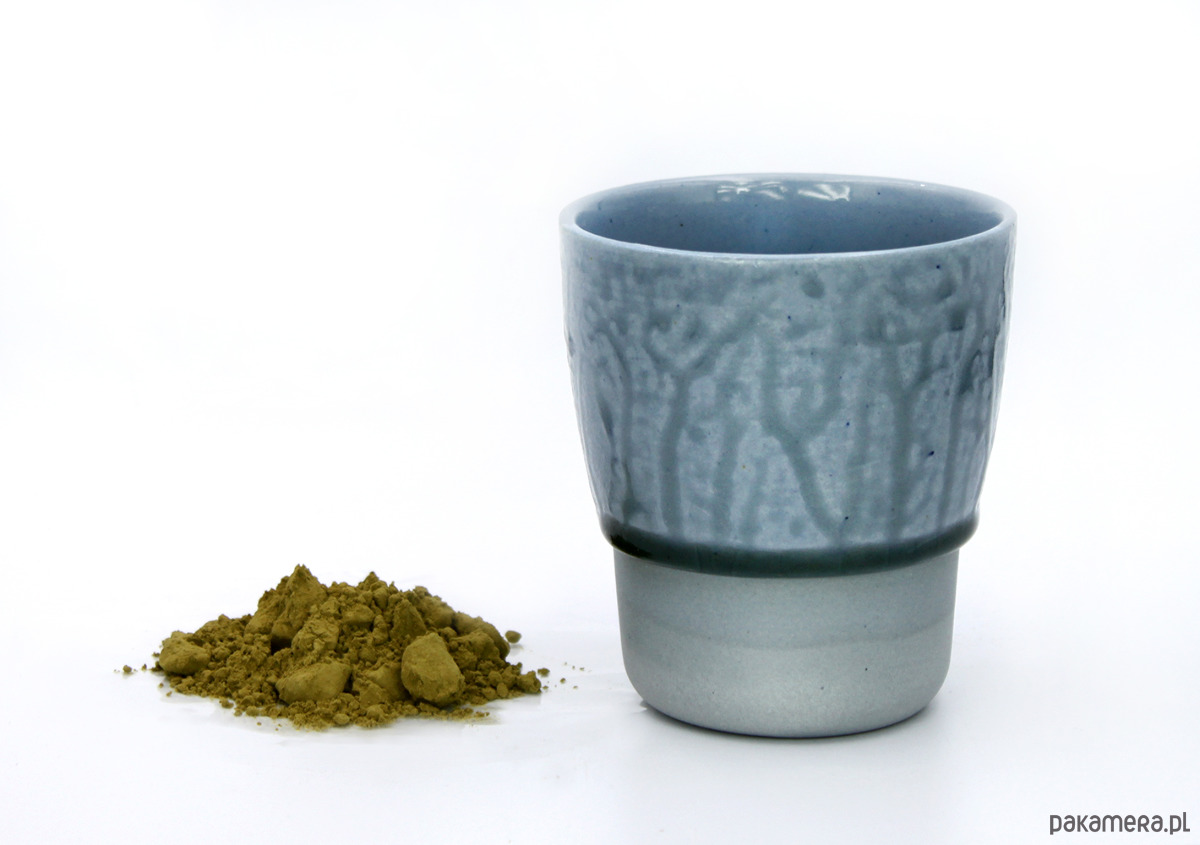 Unikatowy kubek ceramiczny (1szt), pokryty szkliwem z popiołu z rośliny Indigofera (indygo), wewnątrz transparentne błyszczące szkliwo, przeznaczone do kontaktu z żywnością