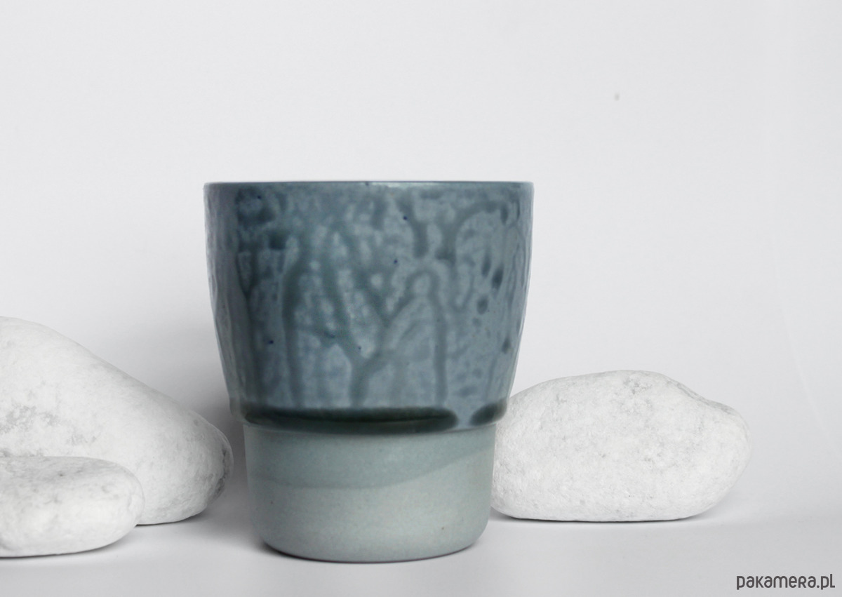 Barwiona kamionka w kolorze niebieskim + szkliwo. Kubek powstał w jednym egzemplarzu, niepowtarzalny