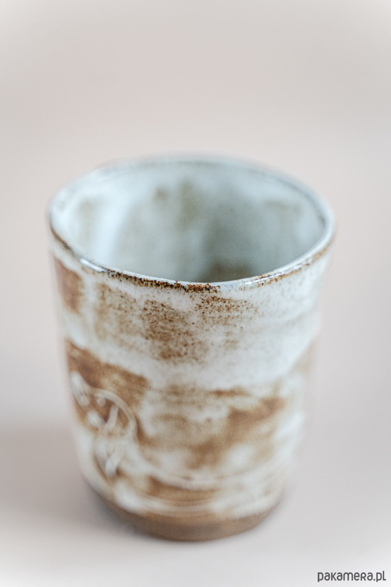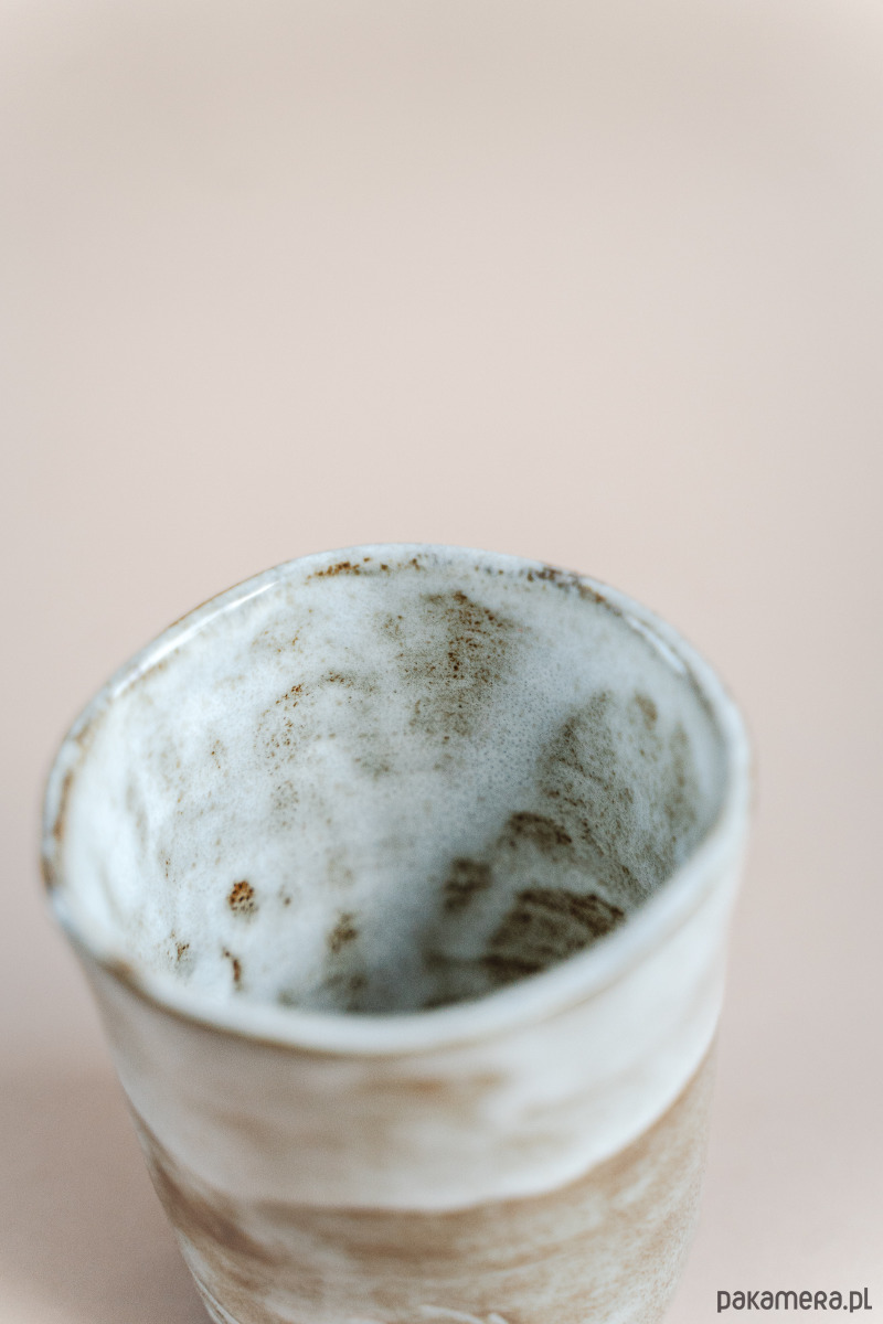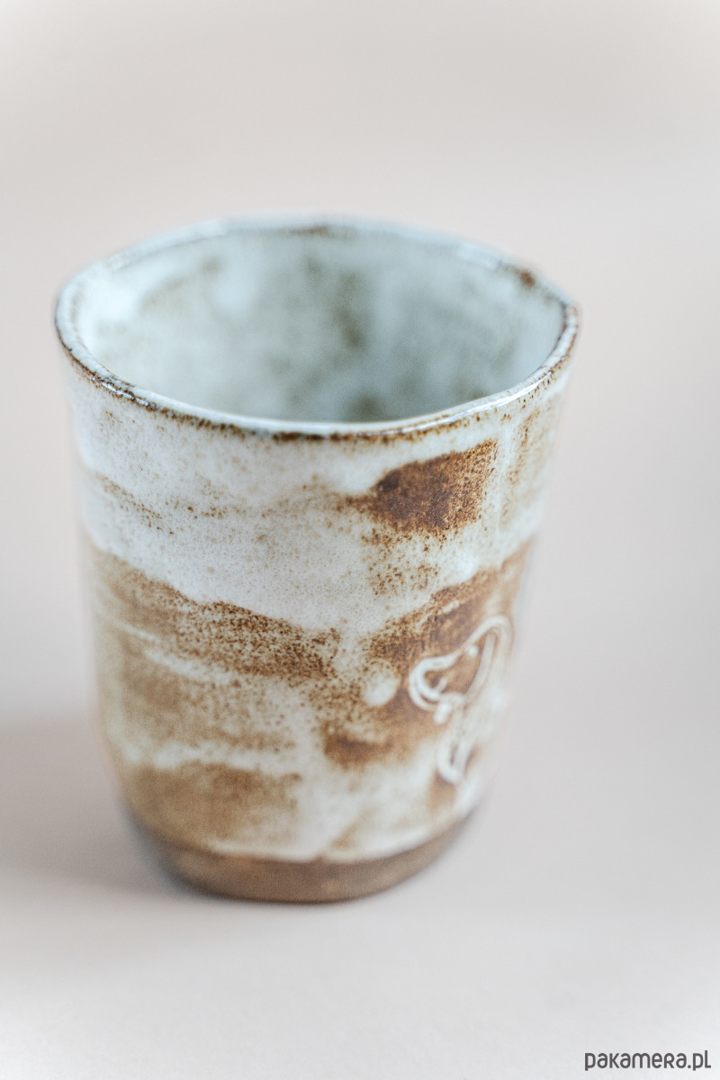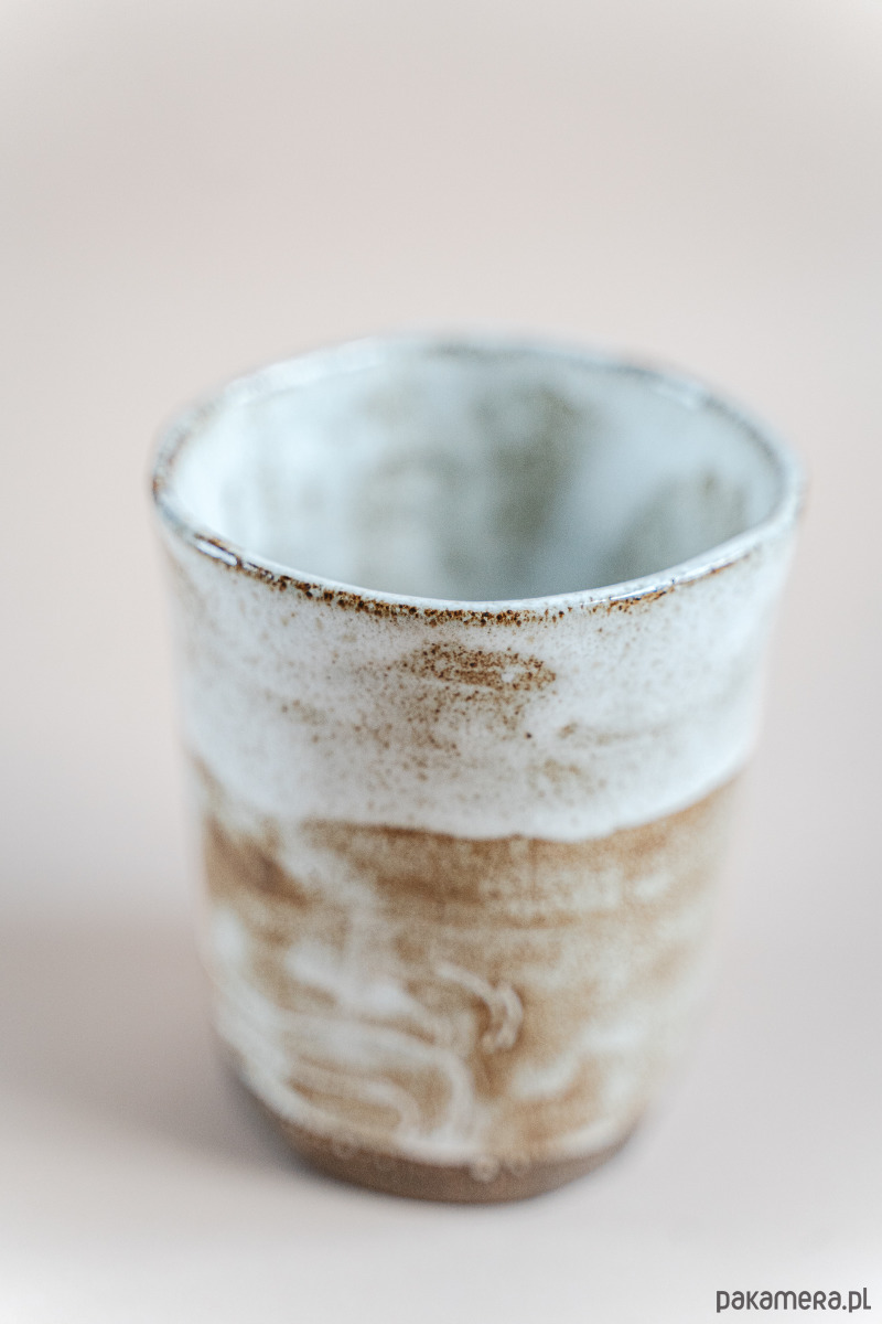 Ceramiczny kubek wykonany ręcznie z ciemnej gliny, pokryty białym szkliwem.
