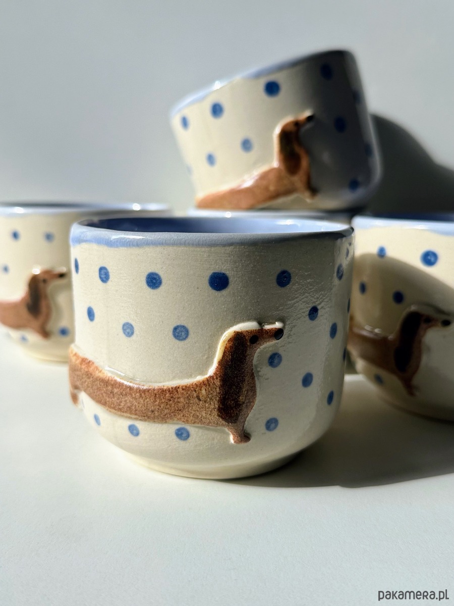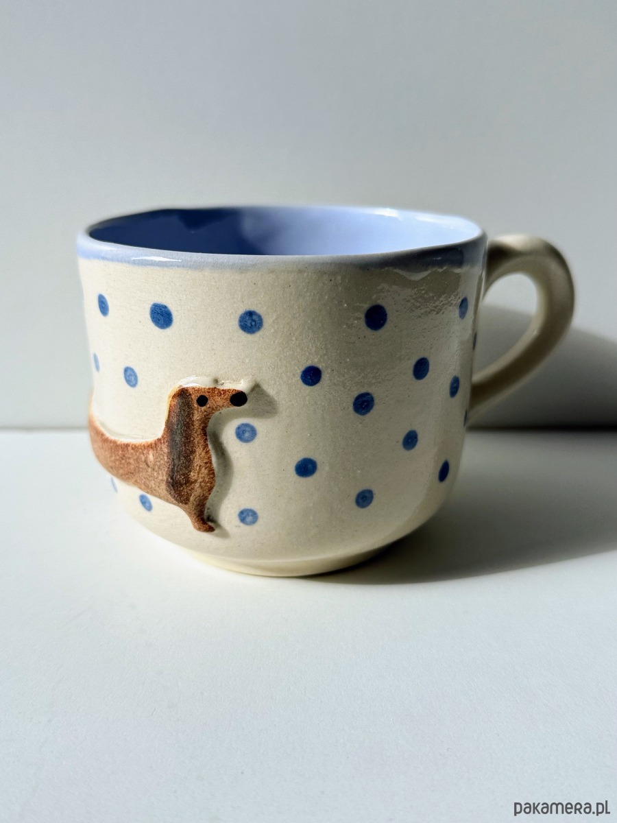 Zabawny, ręcznie wykonany kubek z długim jamnikiem dla wielbicieli piesków i nie tylko. Pokryty wewnątrz szkliwem w kolorze niebieskim, na zewnątrz granatowe kropki oraz długi jamnik.