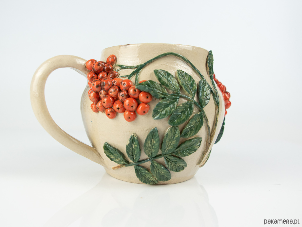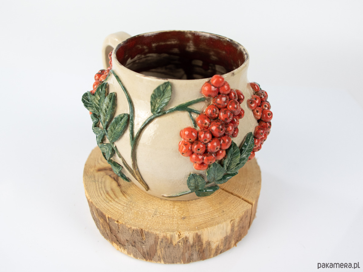 Kubek ceramiczny „Jarzębina” został wykonany w całości ręcznie – baza wytoczona na kole garncarskim, a następnie ozdobiona gałązkami jarzębiny. Wnętrze kubka pokryte jest wyrazistym szkliwem w odcieniach pomarańczowo-czerwonych z subtelnymi białymi przebarwieniami. Zewnętrzna powierzchnia zabezpieczona została przezroczystym szkliwem, które podkreśla naturalną barwę gliny i detale dekoracji. To unikatowy, użytkowy przedmiot inspirowany naturą, idealny na prezent lub do codziennego użytku.