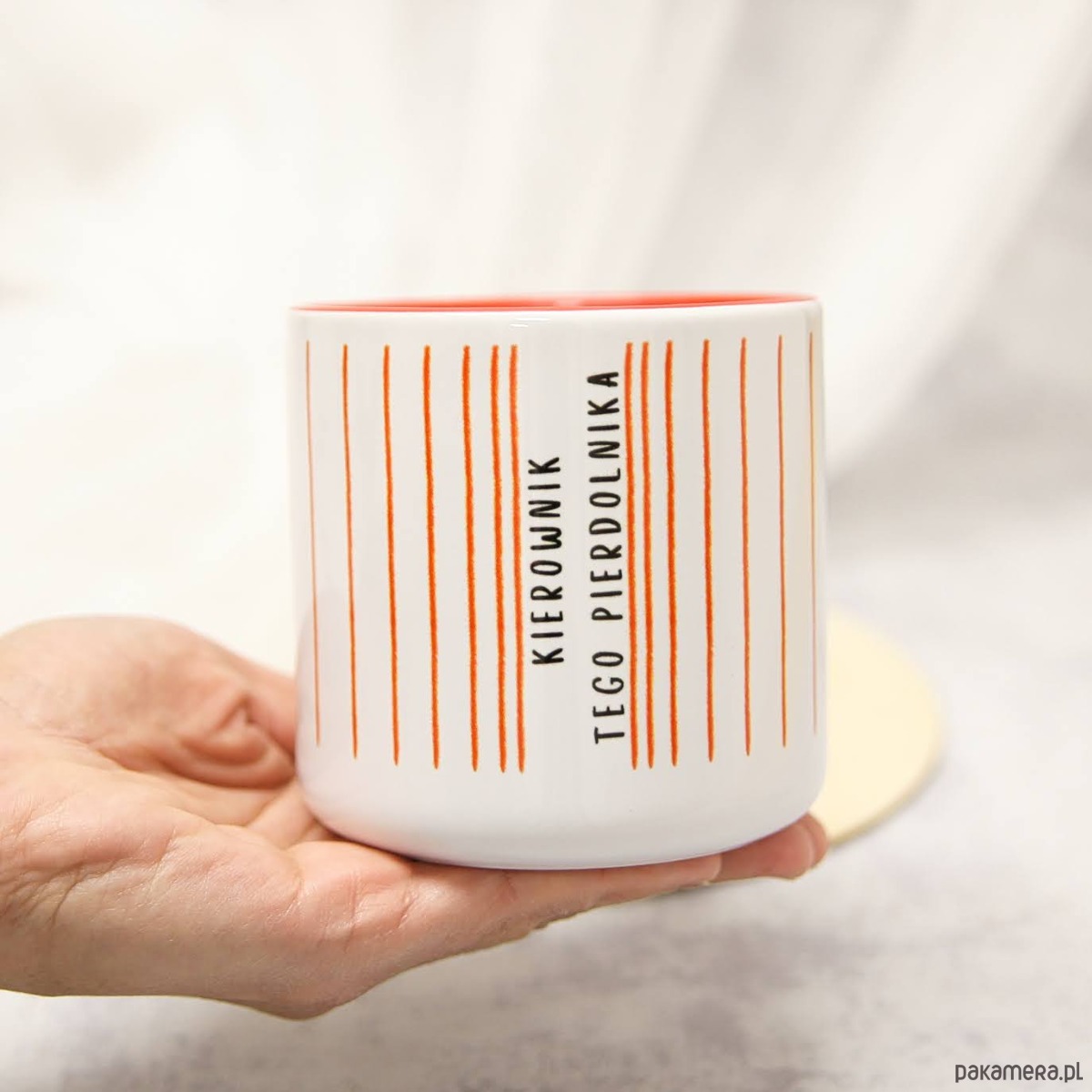 Kubek o pojemności 400 ml z wyrazistym, humorystycznym napisem „Kierowniczka tego pierdolniczka”, który w zabawny sposób podkreśla dystans do codziennego chaosu i poczucie kontroli nad nawet najbardziej zakręconymi sytuacjami. Idealny dla osób z poczuciem humoru, które lubią żartobliwie zaakcentować swoją „zarządczą” rolę w pracy lub w życiu.