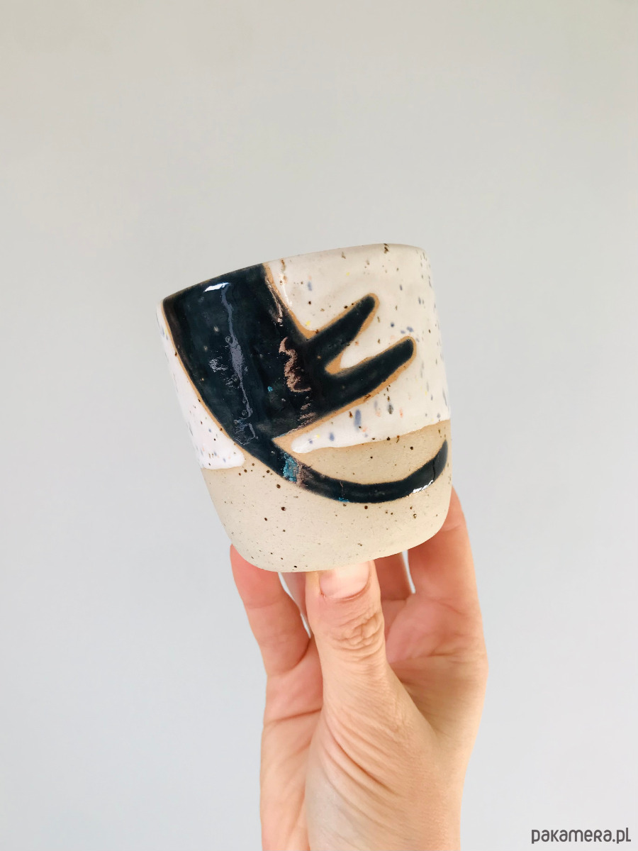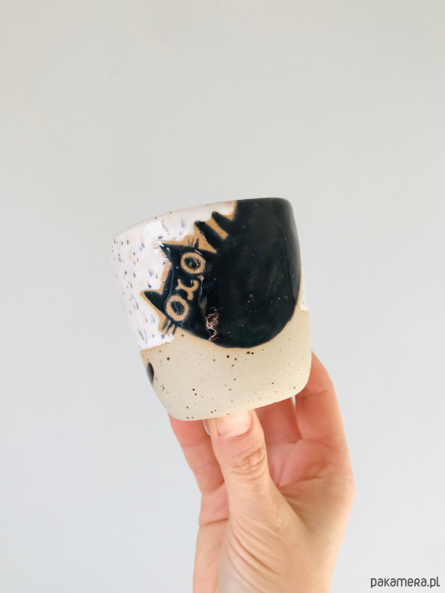 Kubek ceramiczny z ręcznie malowanym motywem kota.