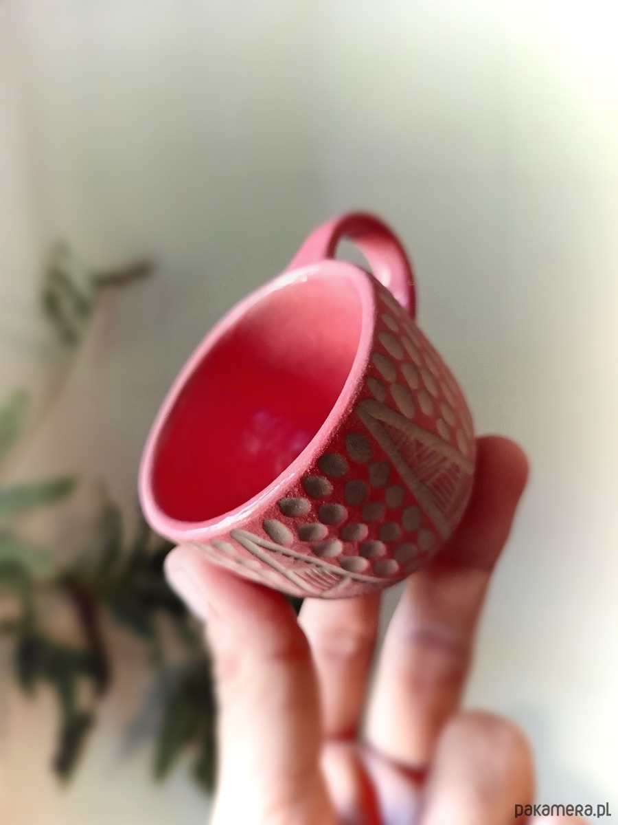 Kubeczki wykonane ręcznie w technice sgraffito z barwionego porcelitu, pojemność 60 ml.