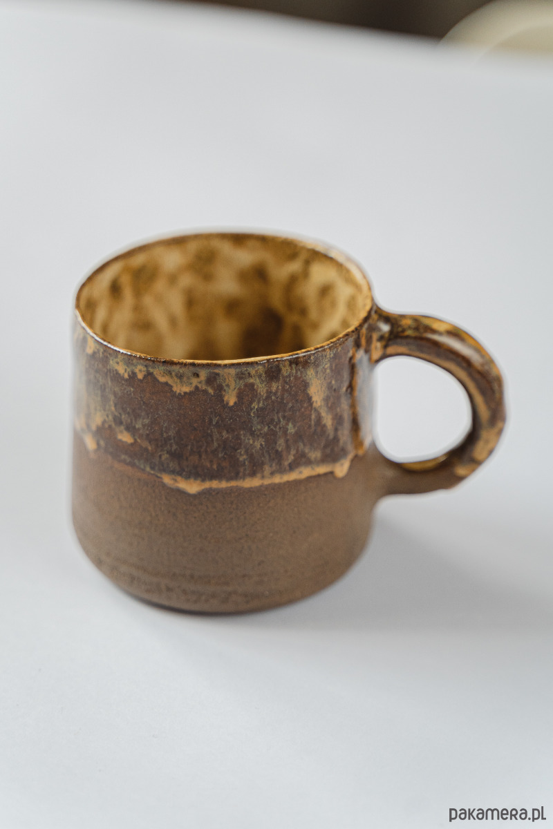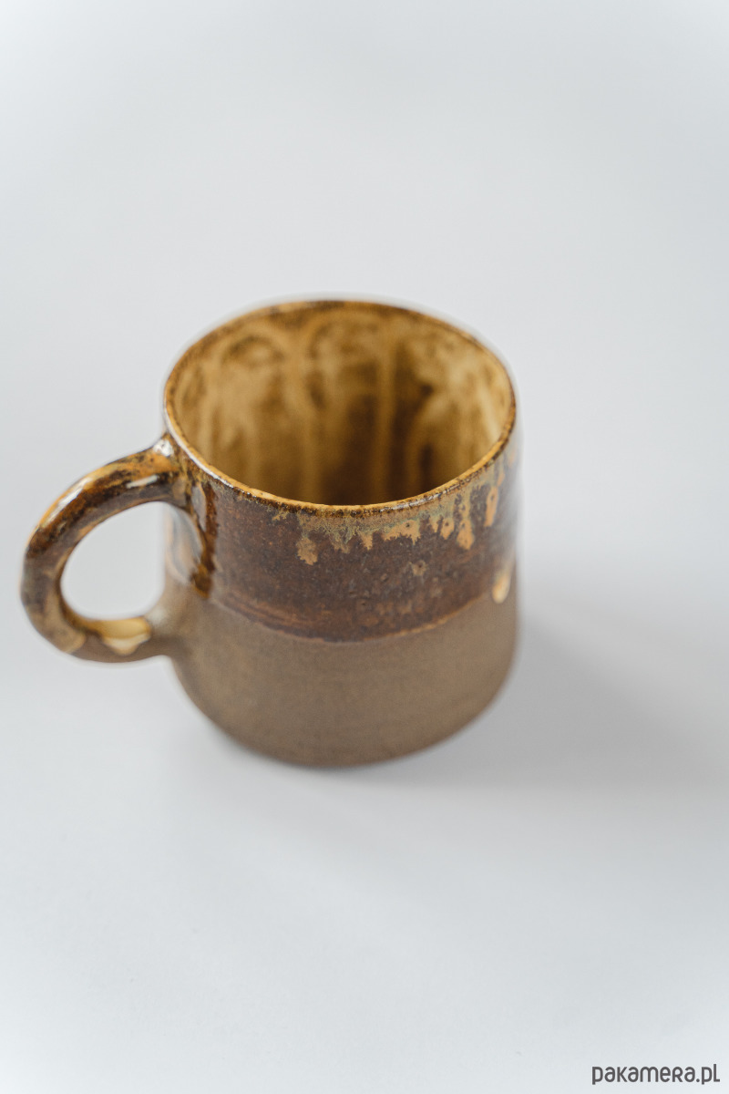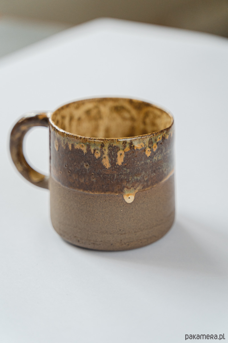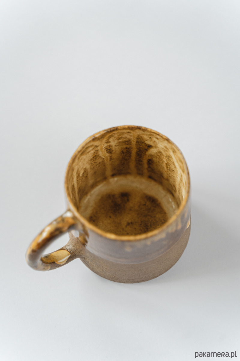 Ceramiczny kubek z uchem, wykonany ręcznie z ciemnej gliny, pokryty kilkoma rodzajami szkliwa.
