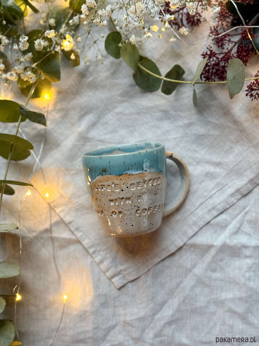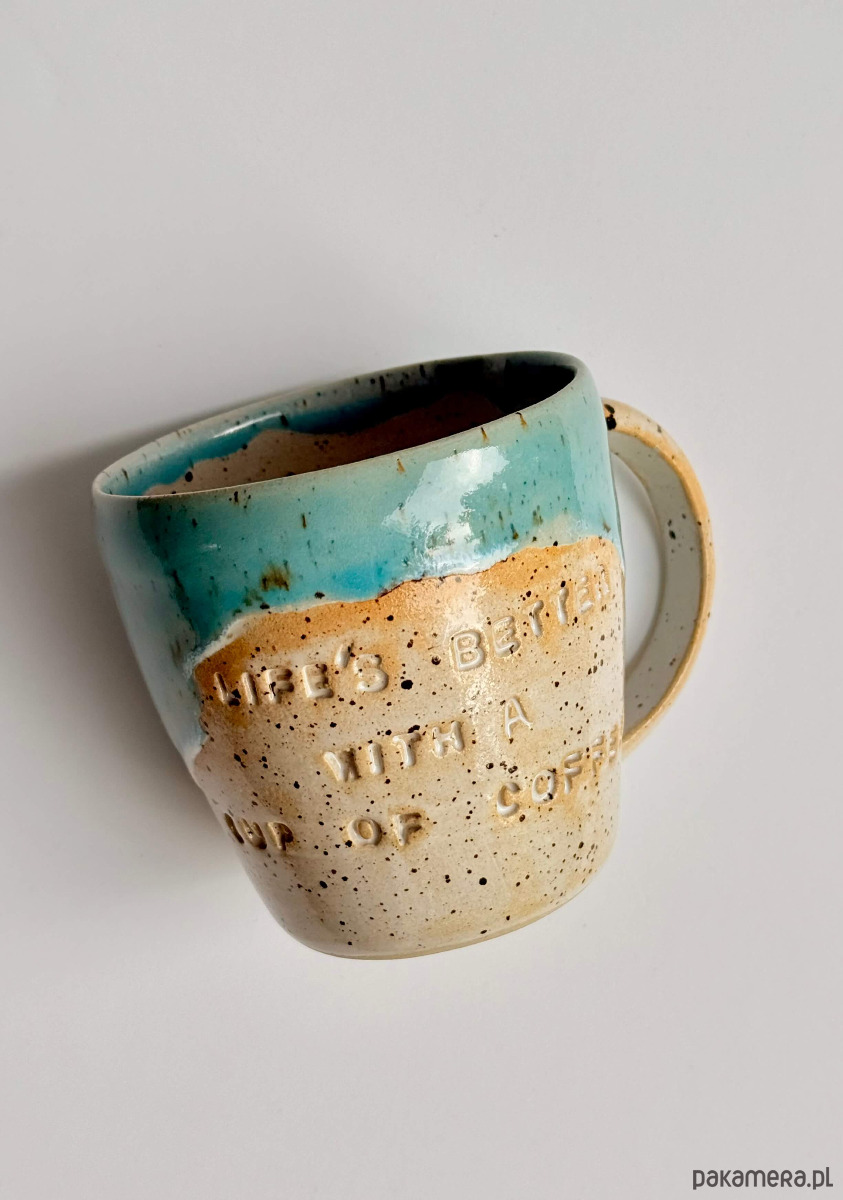 Kubek został wytoczony na kole garncarskim z miłością i lekką obsesją na punkcie dobrej kawy i herbaty.