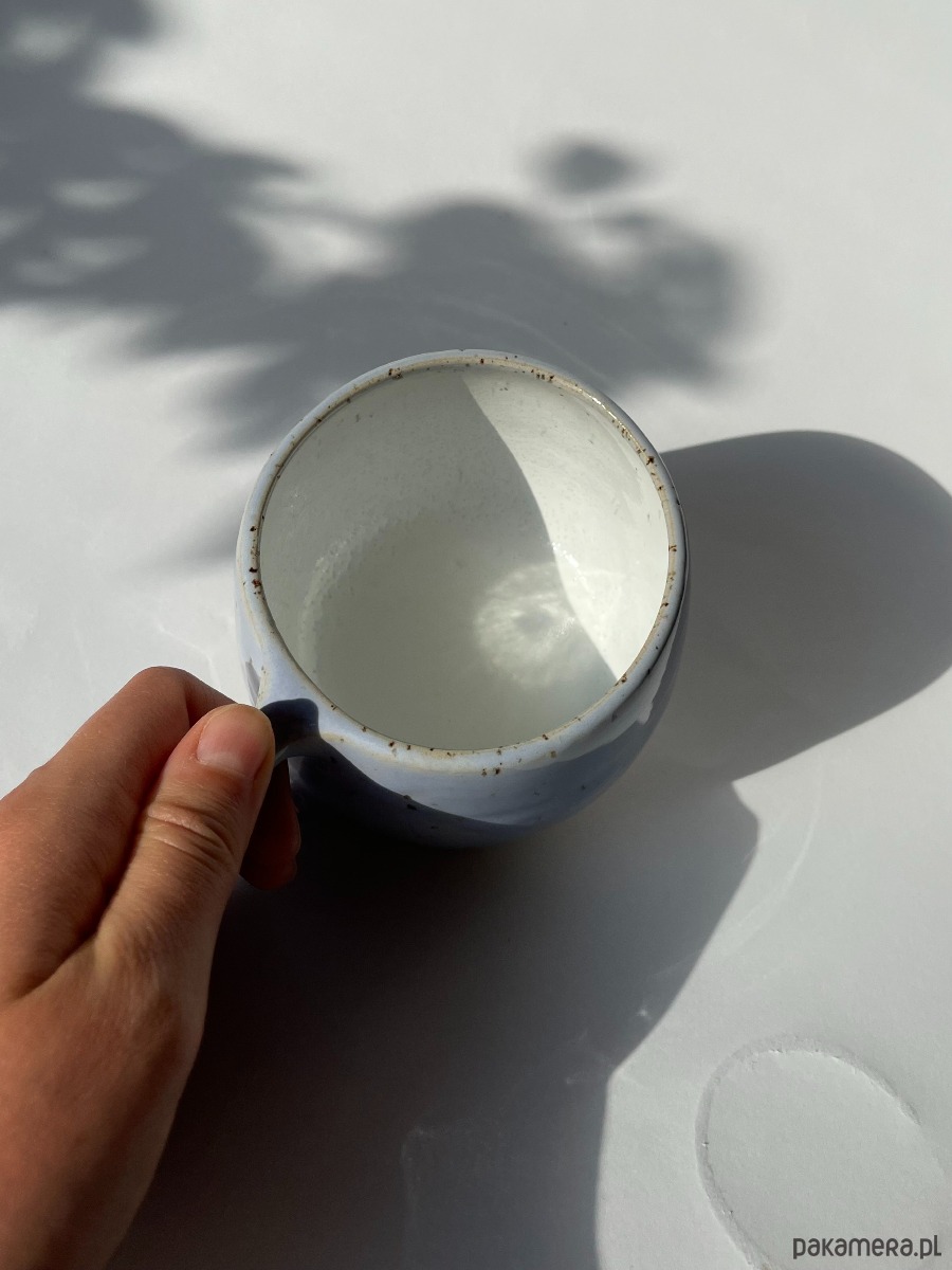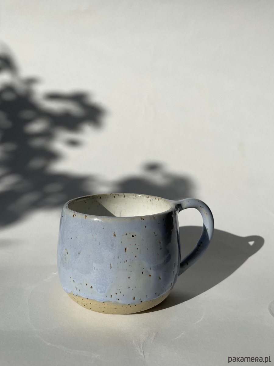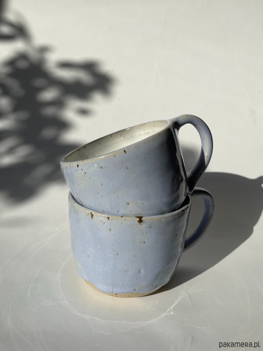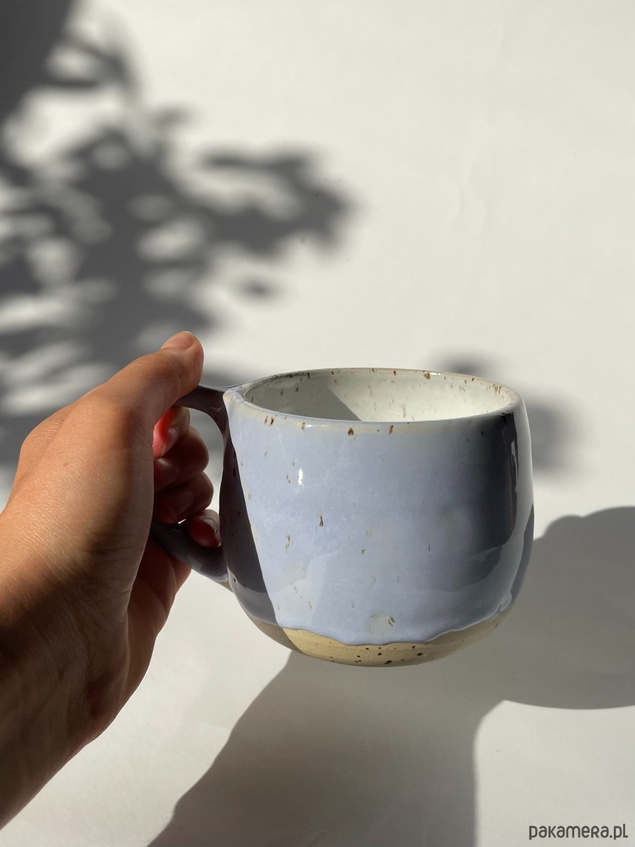 Kubek w soczystym kolorze fioletu, o średniej wielkości. Wykonany z jasnej, kropkowanej gliny.