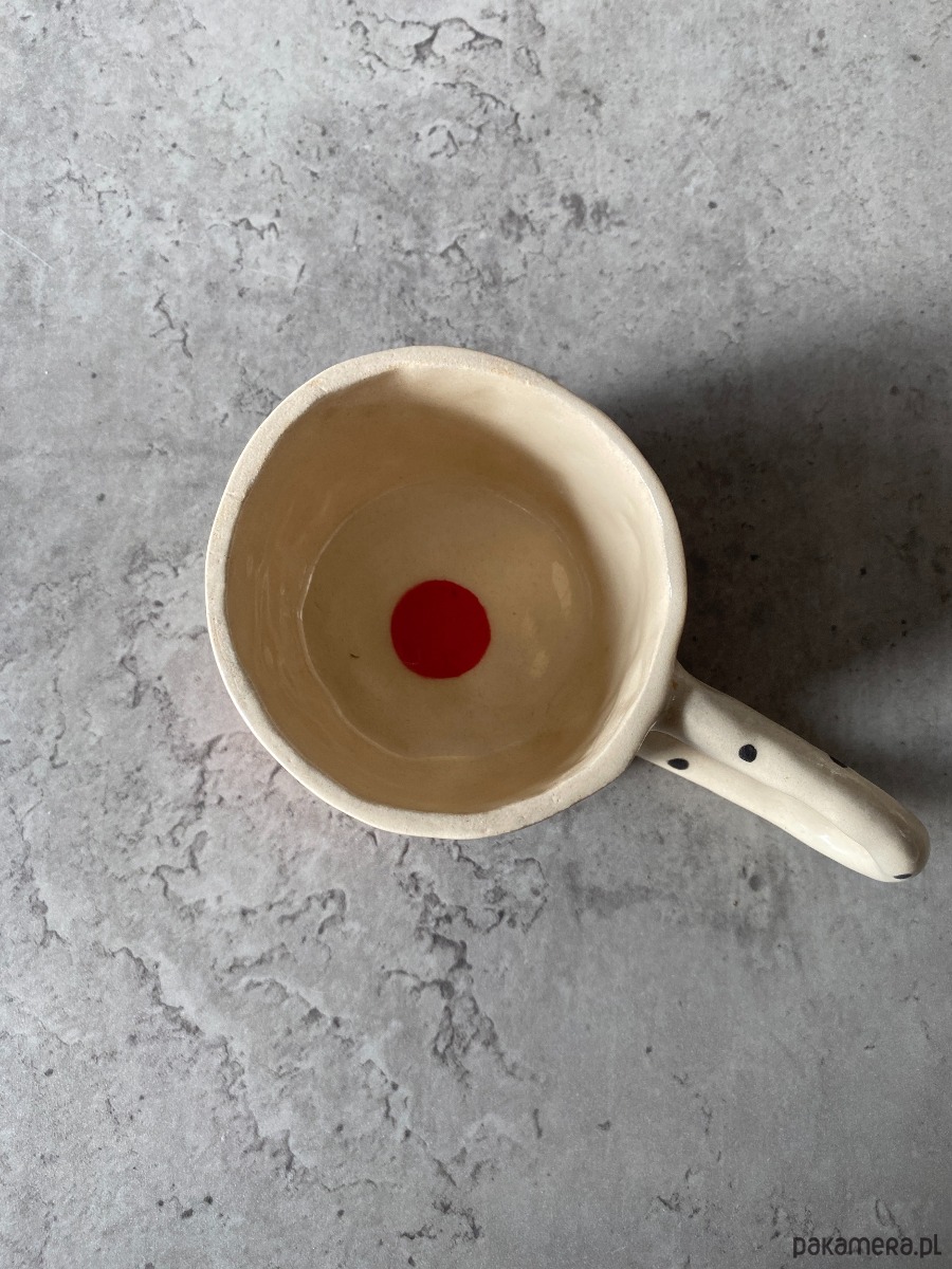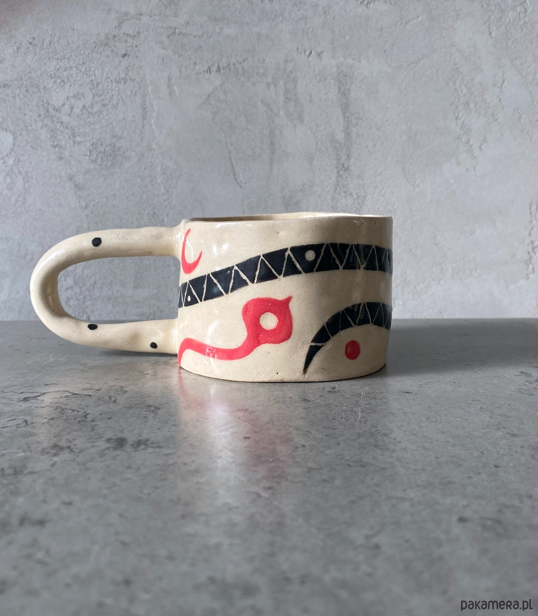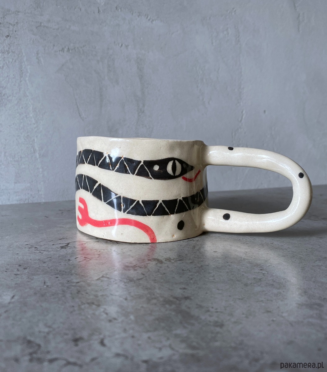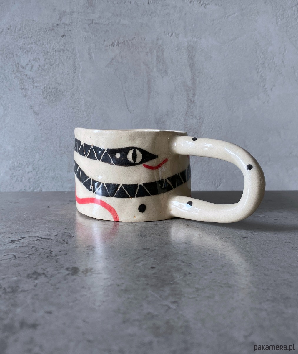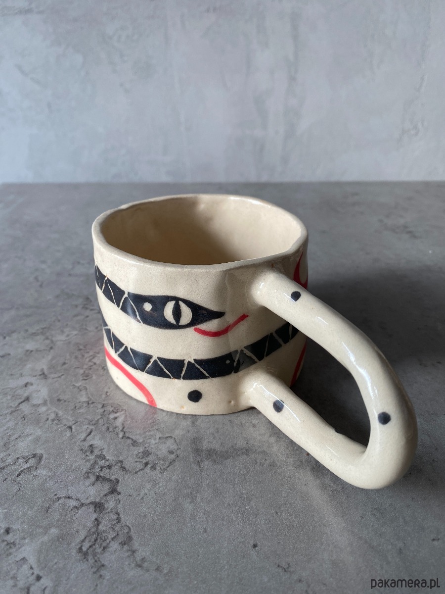Kubek z uchem z gliny, ręcznie robiony i malowany w motyw węża, który oplata go, wraz z korespondującymi z nim elementami roslinnymi. Kubek, poprzez swoją formę oraz grafikę - ma bardzo organiczny charakter. Po wypiciu z niego ulubionego napoju - ukazuje nam się słońce, które ma rozświetlić resztę naszego dnia :) Inspirowany podróżą do Azji.