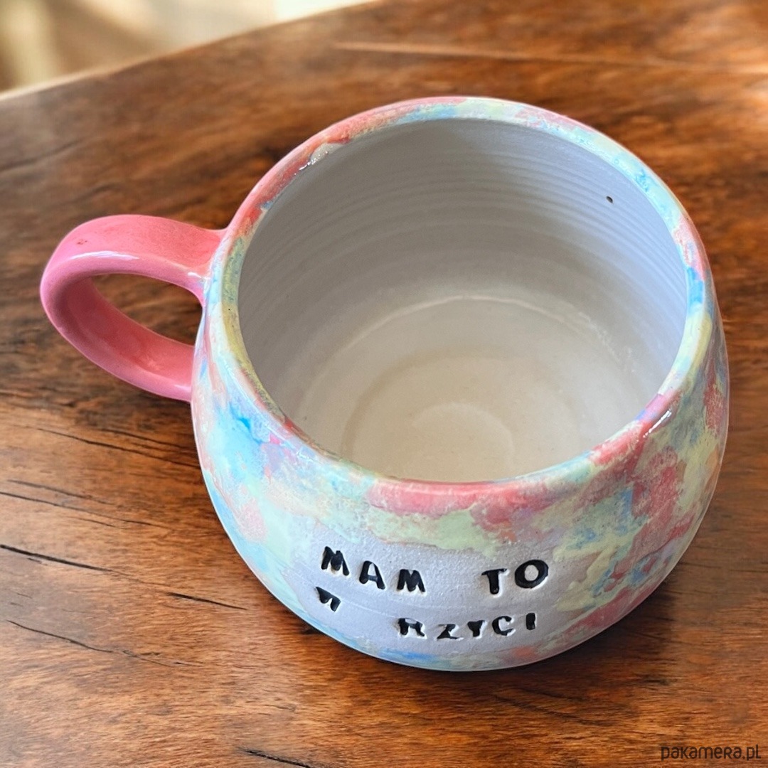 Ten wyjątkowy kubek to idealna dawka luzu na co dzień! Ręcznie wykonana ceramika, pomalowana w pastelowe, akwarelowe barwy i ozdobiona dosadnym napisem „Mam to w rzyci” (czyli po prostu – mam to w d.....! 😄).