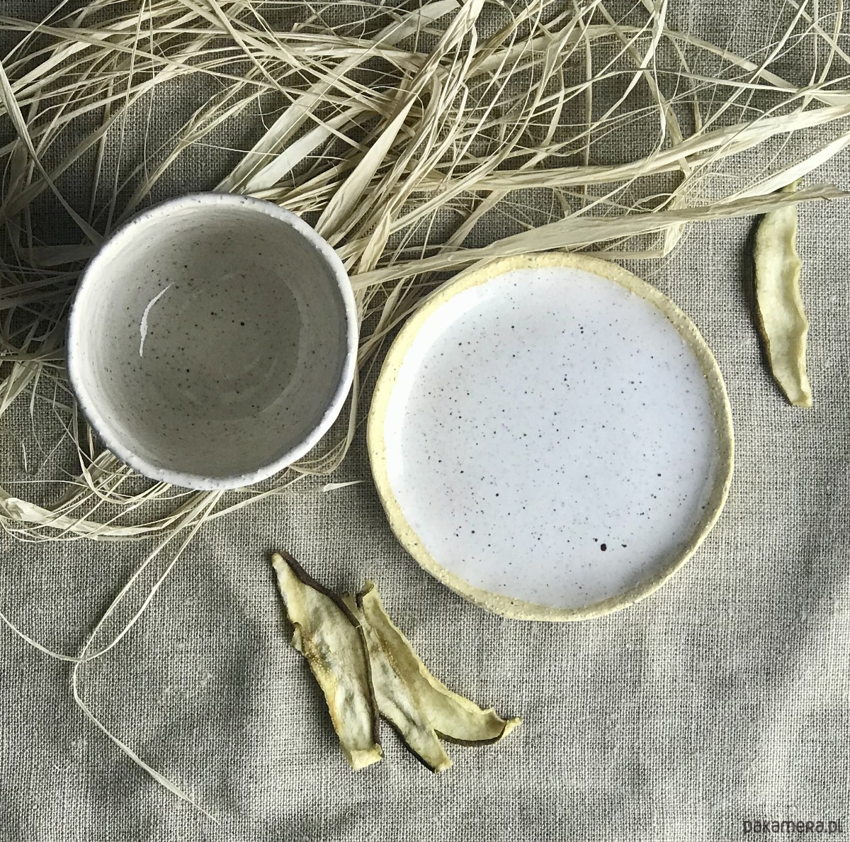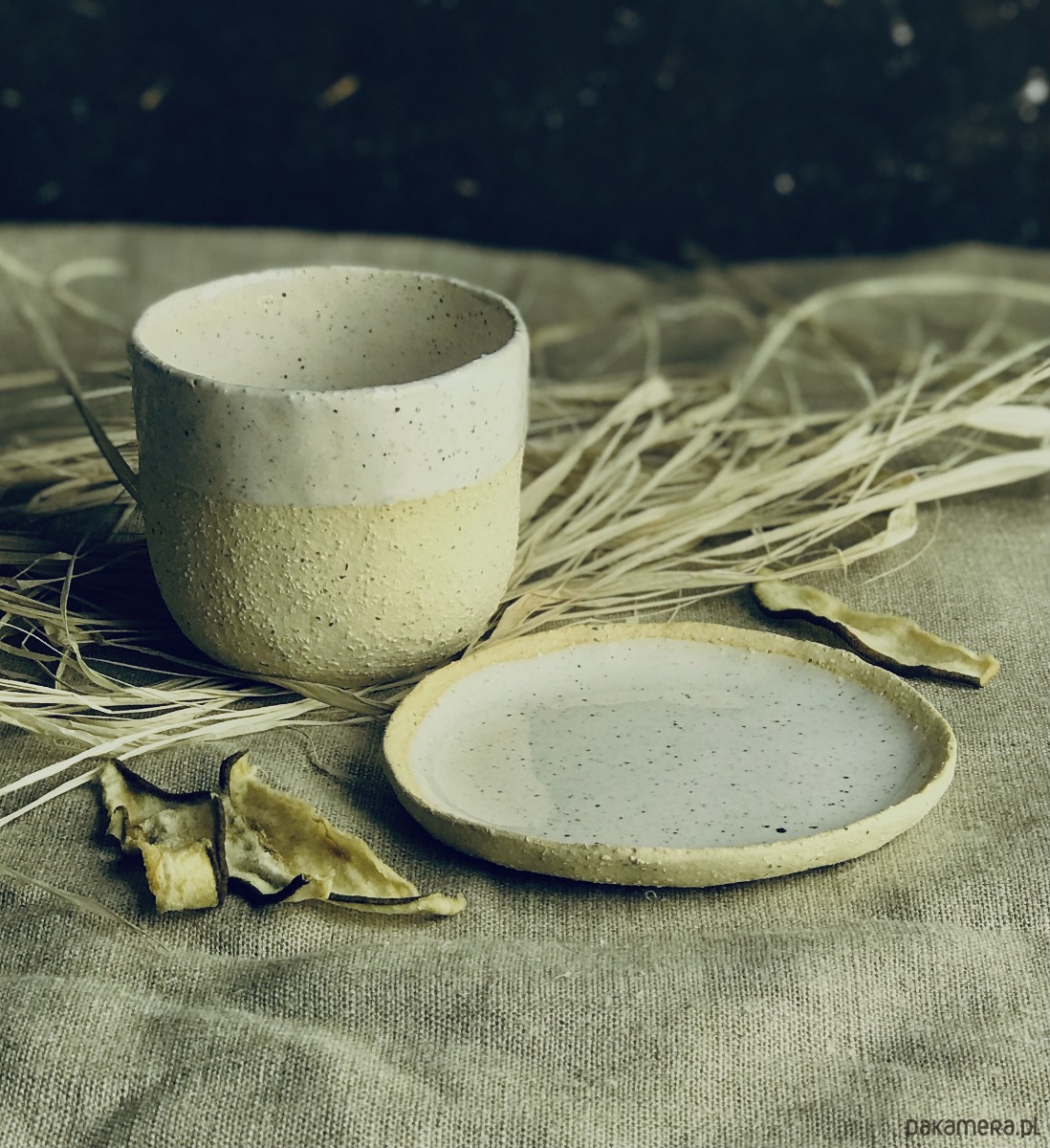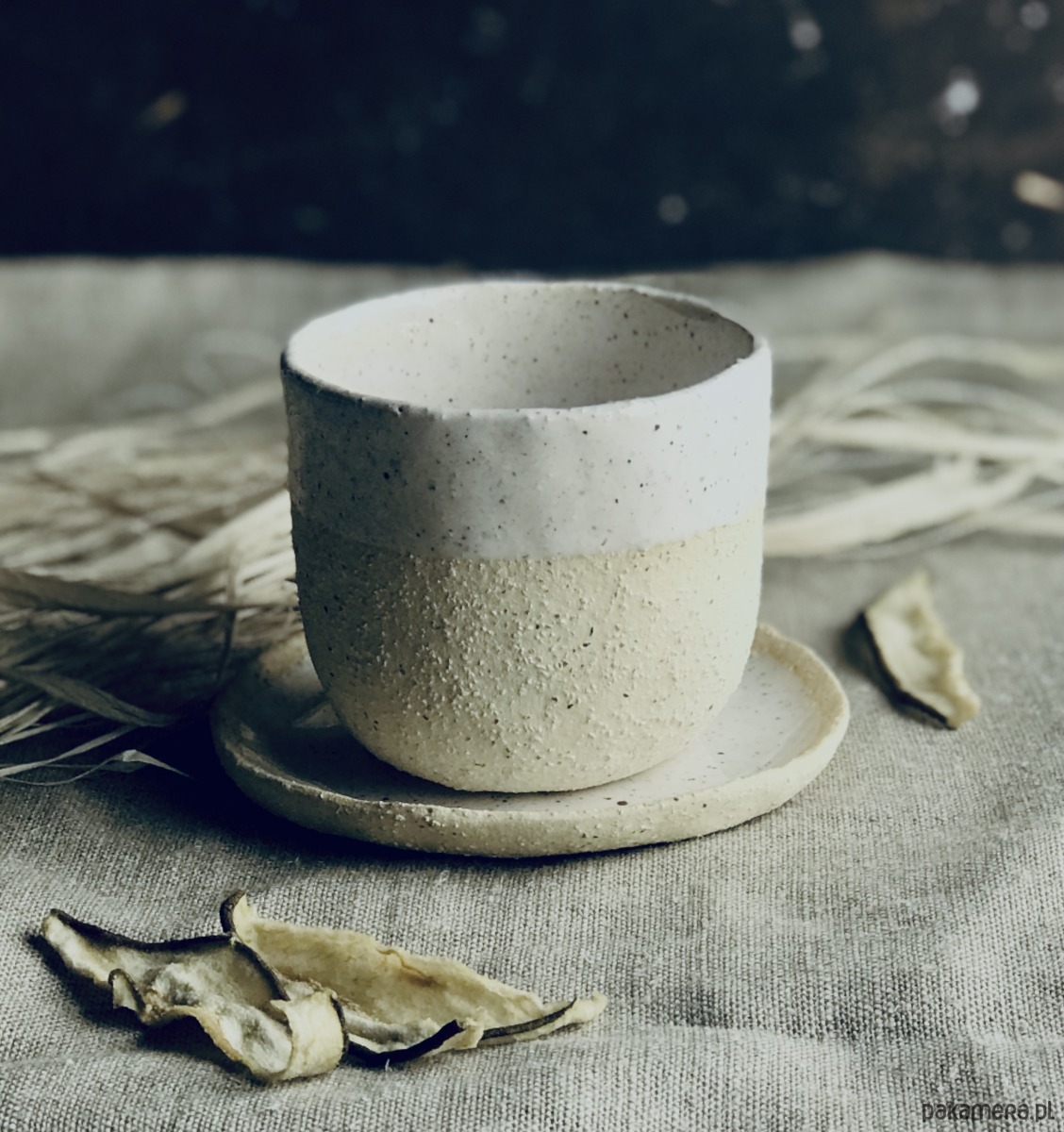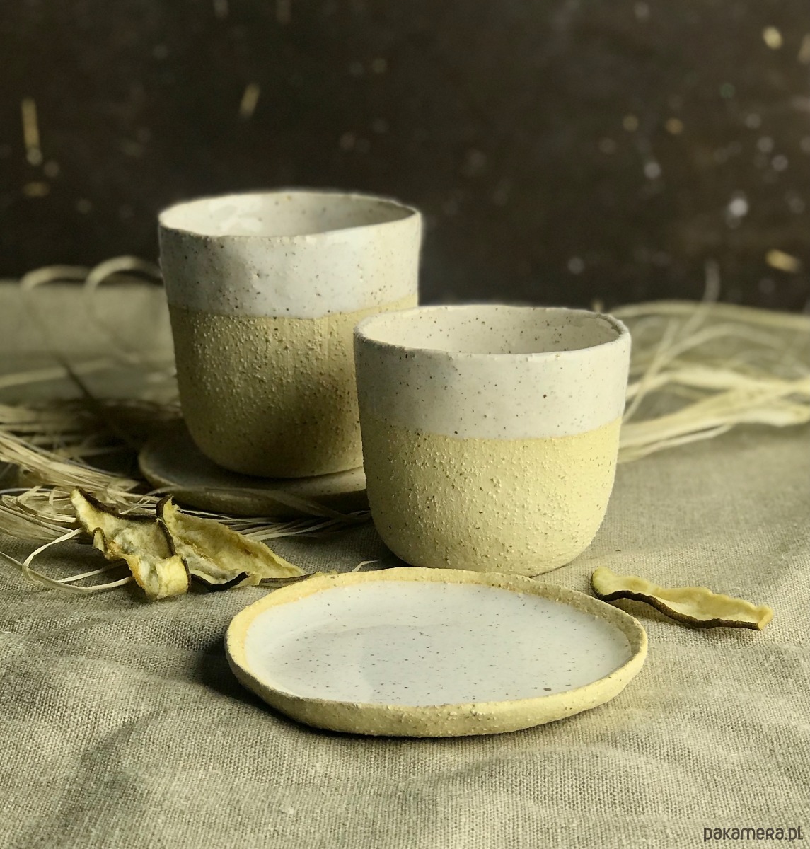 Naczynia (kubek + talerzyk) zostały wykonane z jasnej, szamotowej gliny i częściowo pokryte szkliwem. Uwydatniona faktura gliny nadaje zestawowi oryginalny, rustykalny charakter.