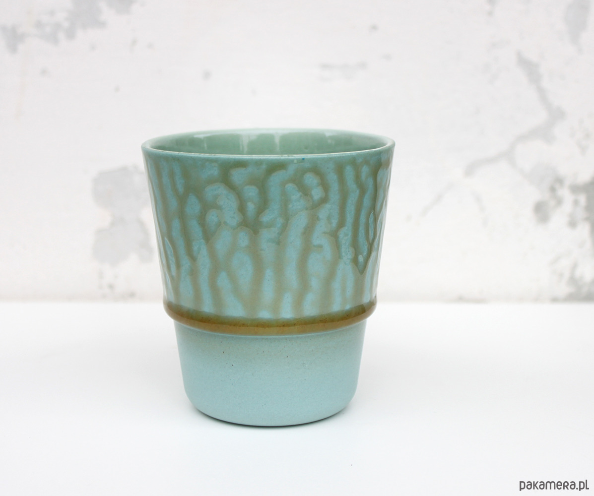 Barwiona kamionka w kolorze turkusowym+ szkliwo. Kubek powstał w jednym egzemplarzu, niepowtarzalny