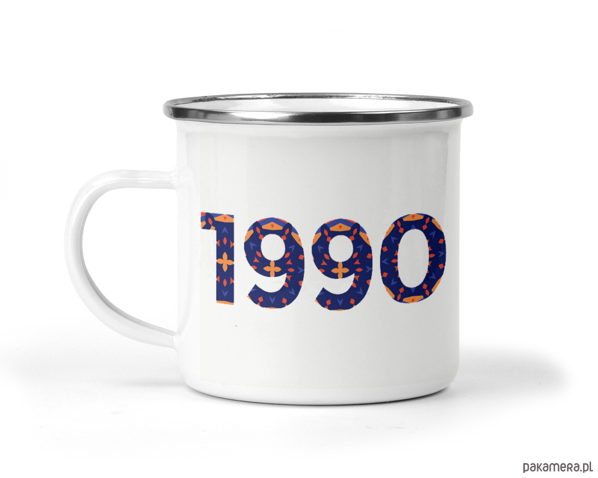 Emaliowany kubek z motywem świątecznym widocznym na zdjęciu.