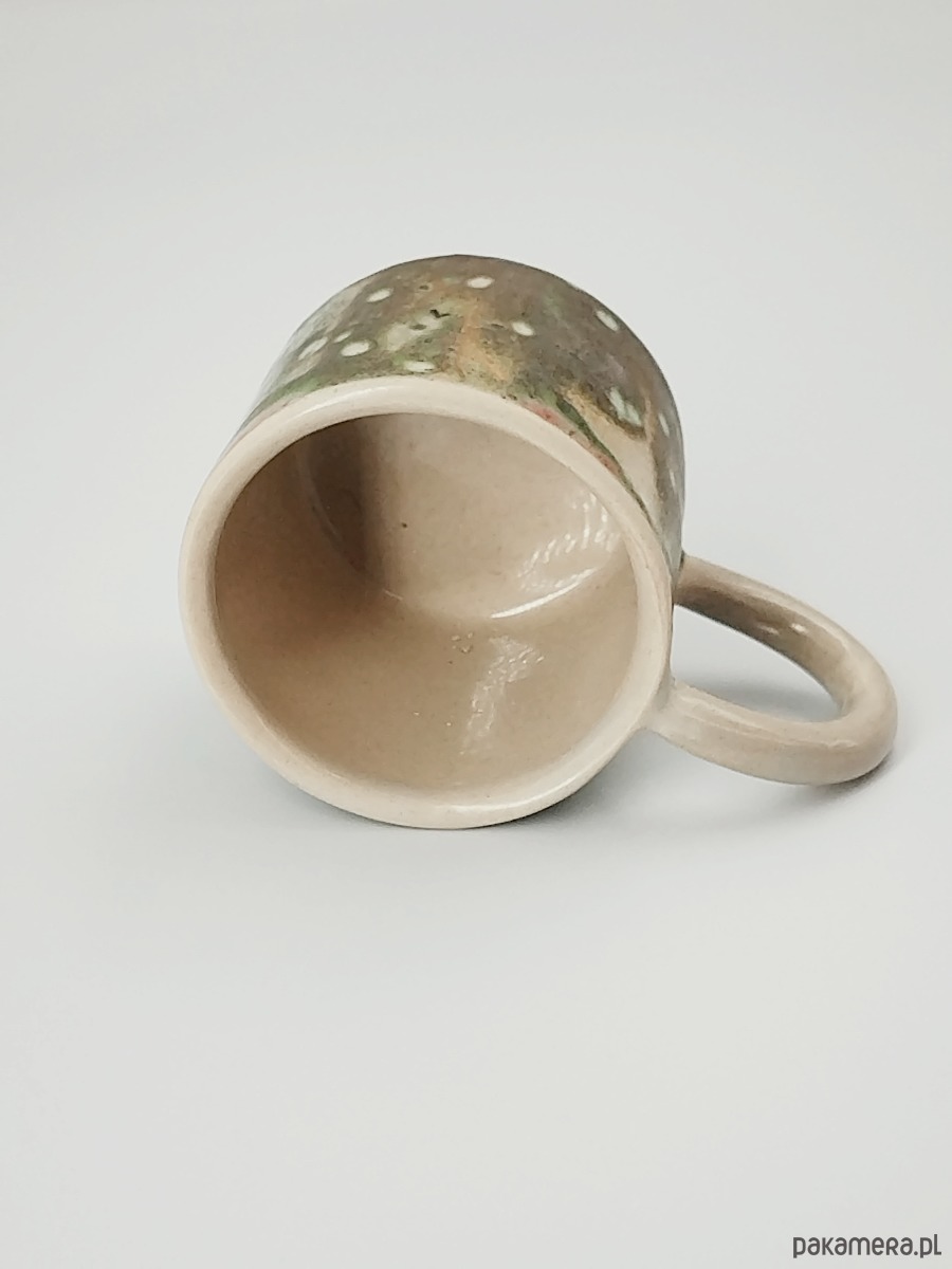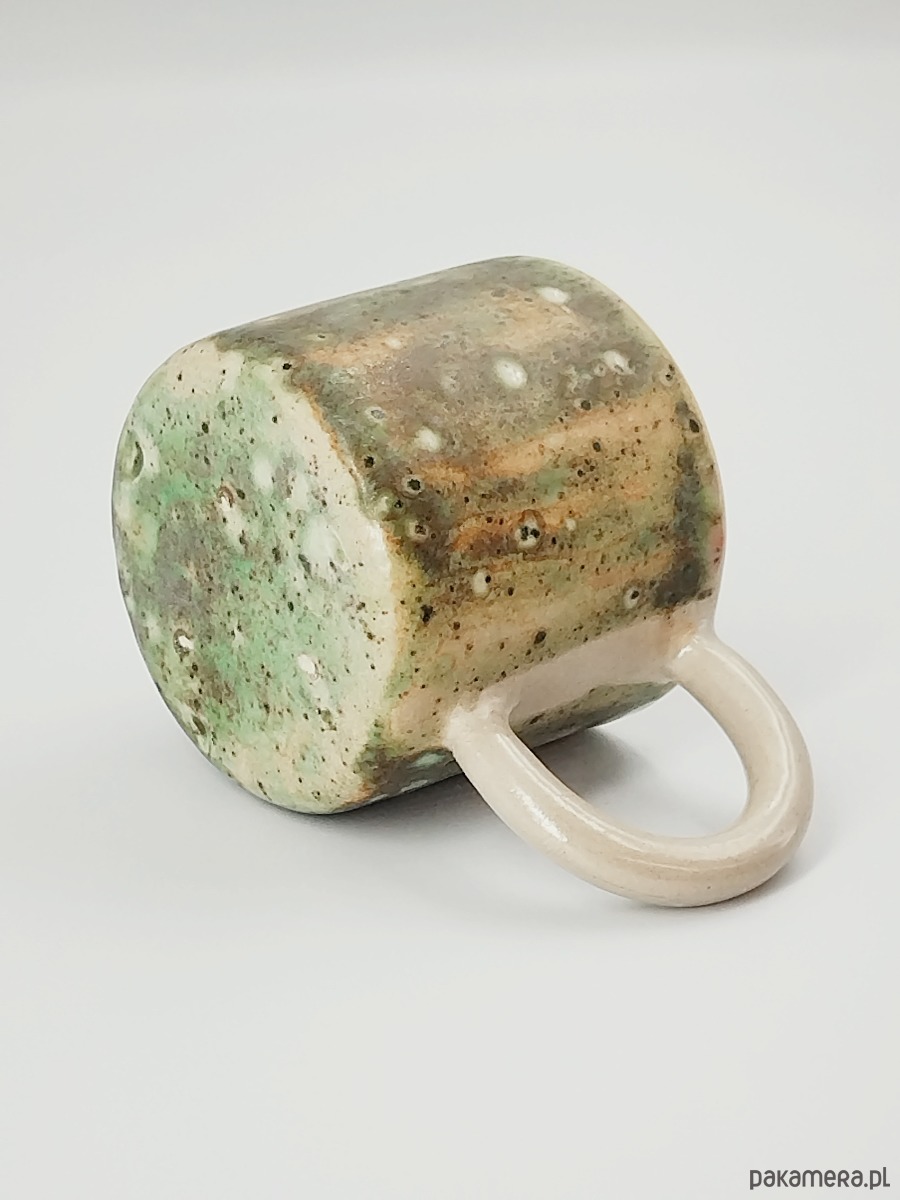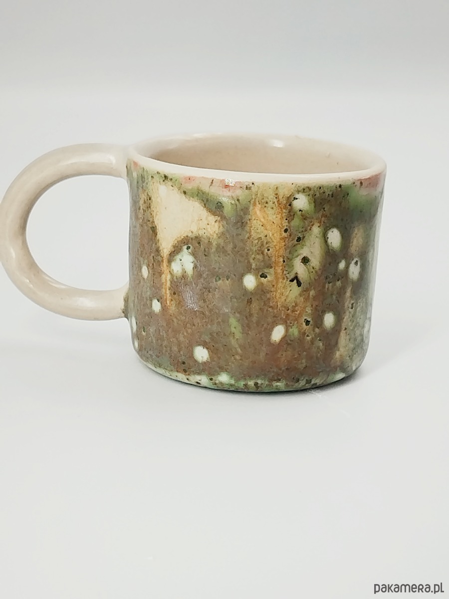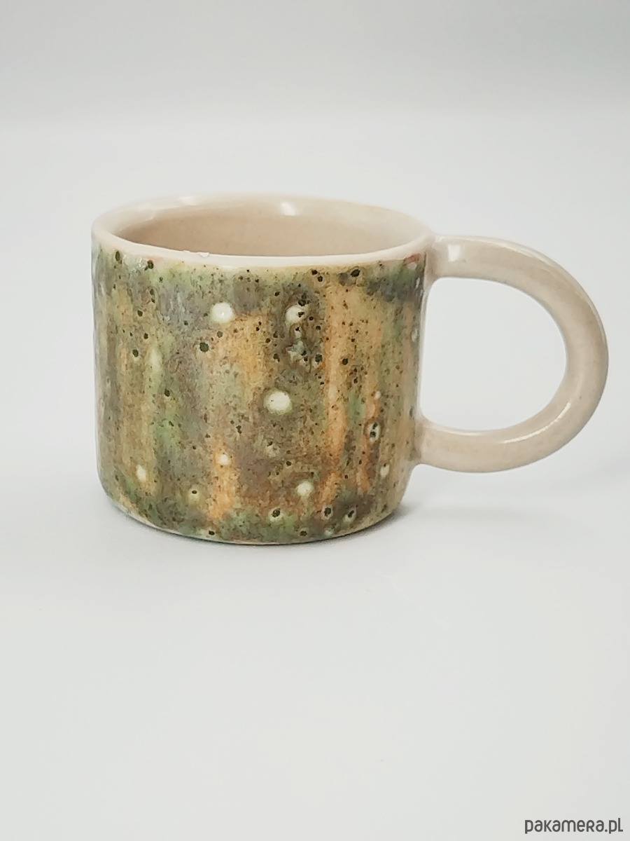 Odkryj harmonię w każdym łyku z ręcznie robionym kubkiem na espresso. Jego zielona, matowa glazura przypomina omszały las i nadaje naturalnej elegancji. Pomimo swojej skromnej wielkości - 5,5 cm wysokości i 6 cm średnicy, pomieści 100 ml kawowego naparu. Ma wygodne ucho i można go myć w zmywarce. Ten kubeczek działa uspokajająco niczym oaza, więc ciesz się chwilą aromatycznej kawy.