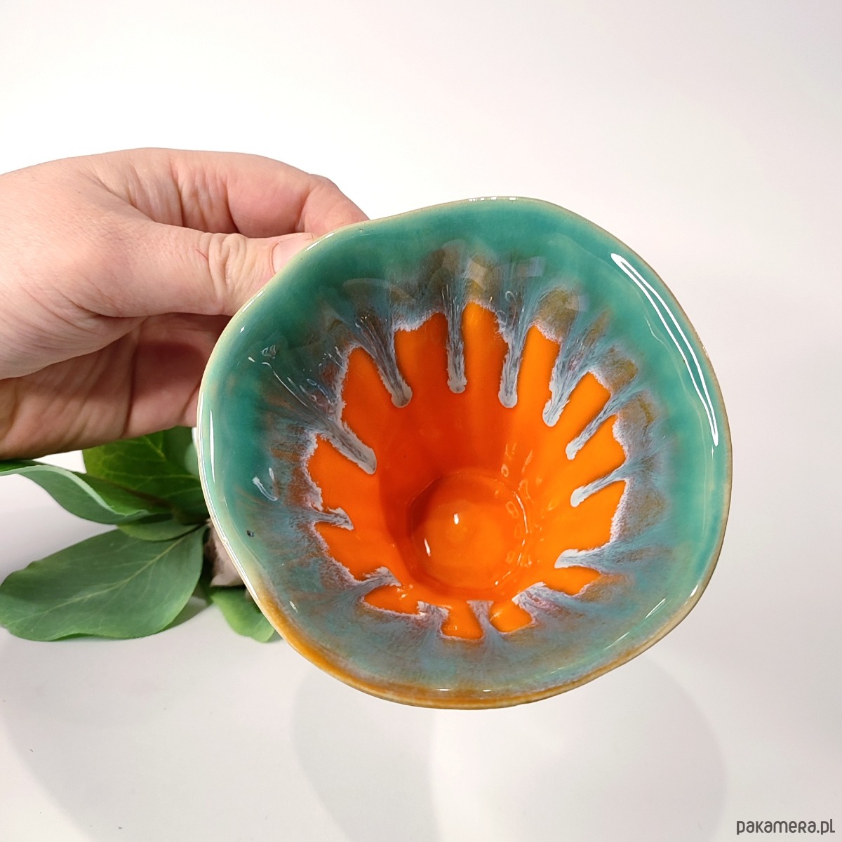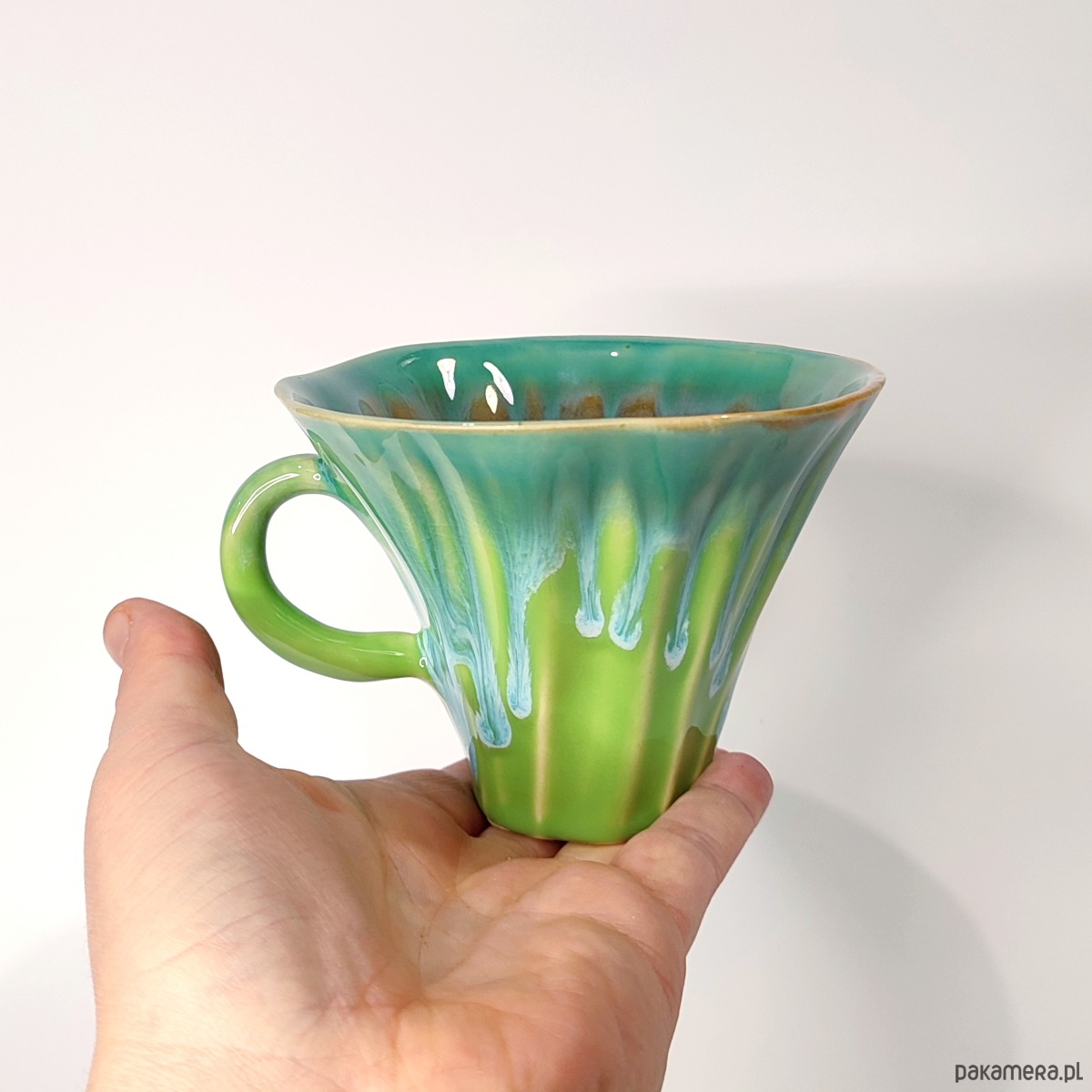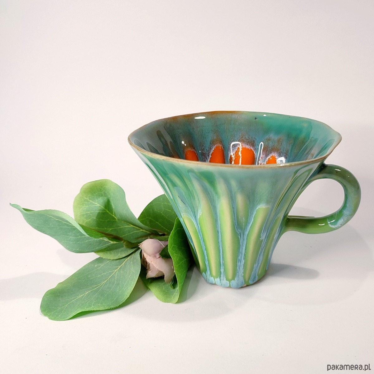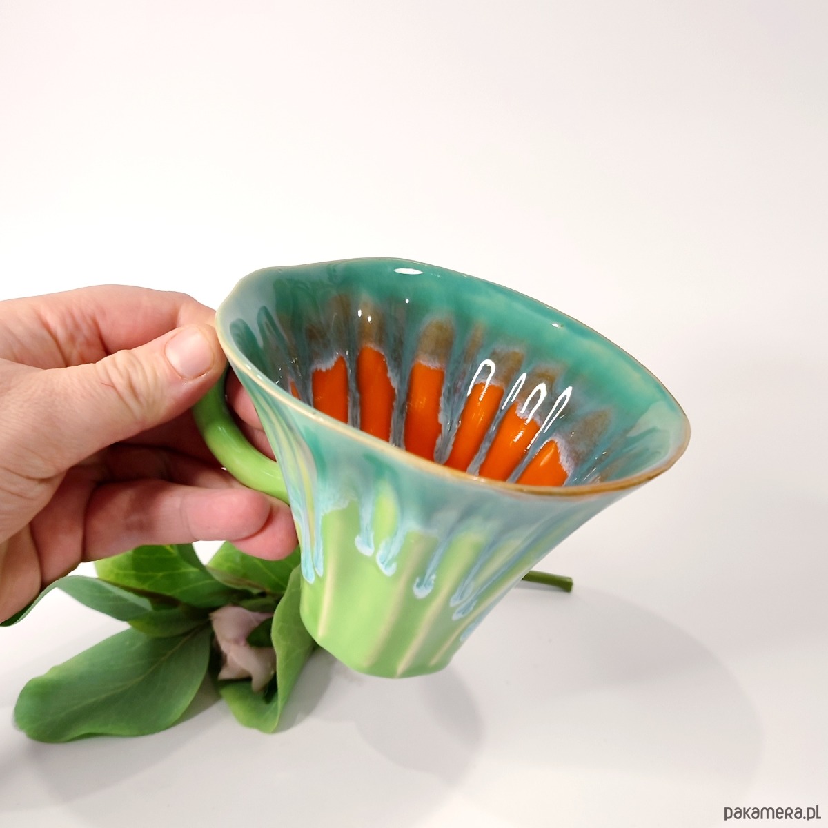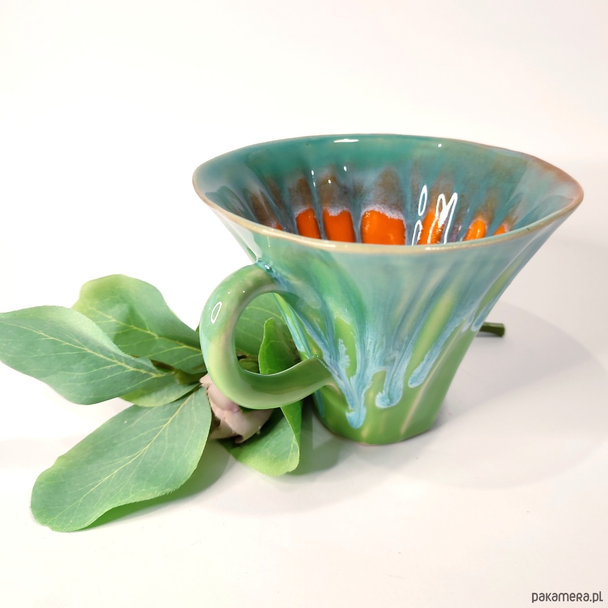 Kolorystyka: środek kubka pomarańczowy, z zewnątrz zielony jasny, krawędzie turkusowe.