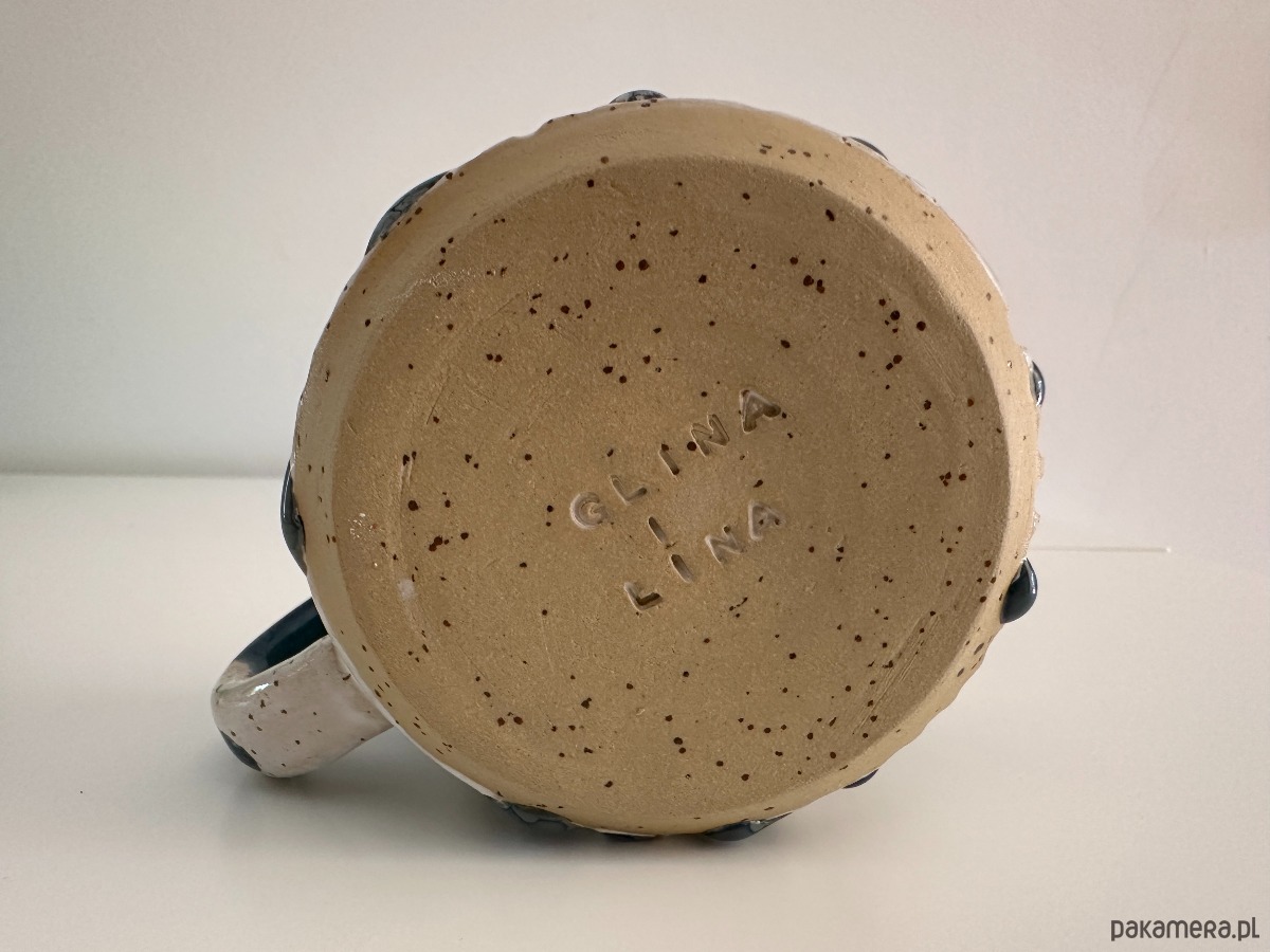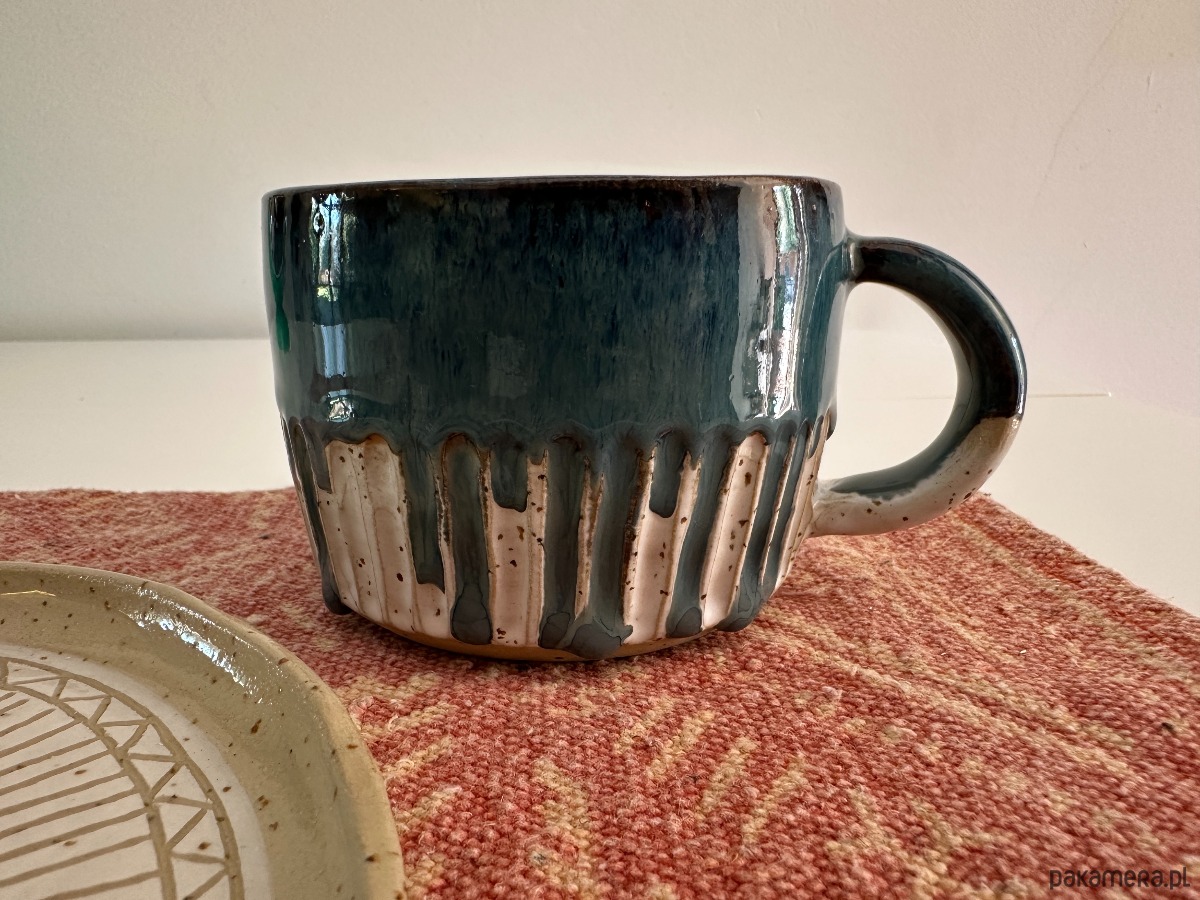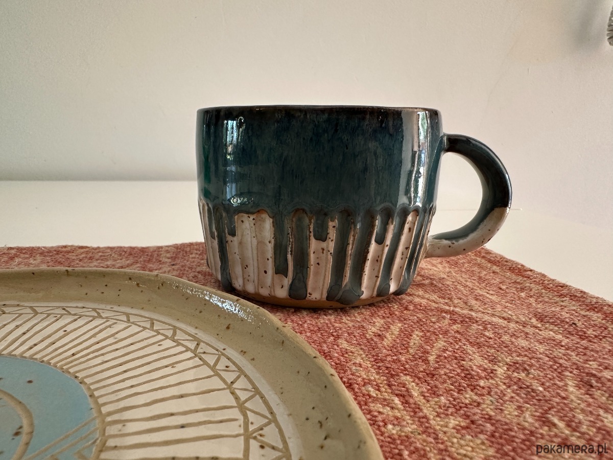 Oto wyjątkowy kubek stworzony na kole garncarskim, w którym połączyliśmy surowość kropkowanej gliny z magią szkliwionych powierzchni. Wnętrze oraz górna część kubka zostały pokryte efektownym niebieskim szkliwem, które przypomina spokojne fale oceanu. Dolna część zewnętrzna zachwyca bielą podkreślającą naturalną fakturę gliny, a całość dopełnia delikatny tłoczony szlaczek, dodający mu subtelnej elegancji.