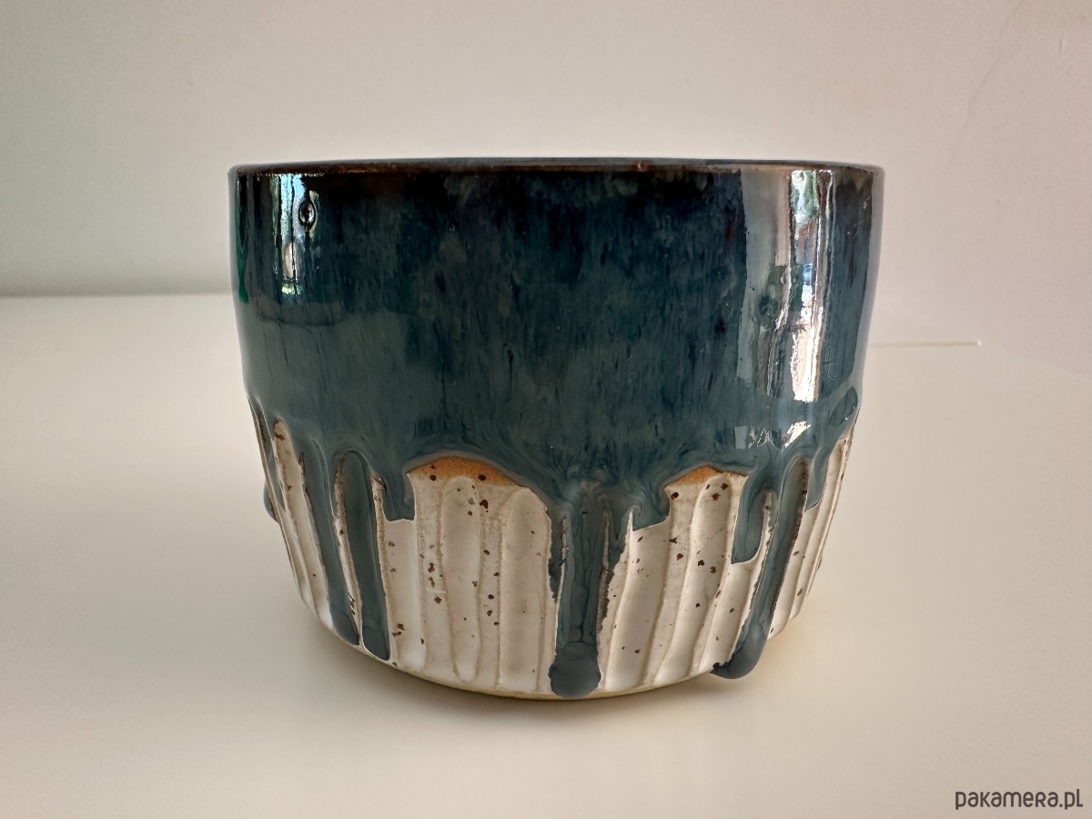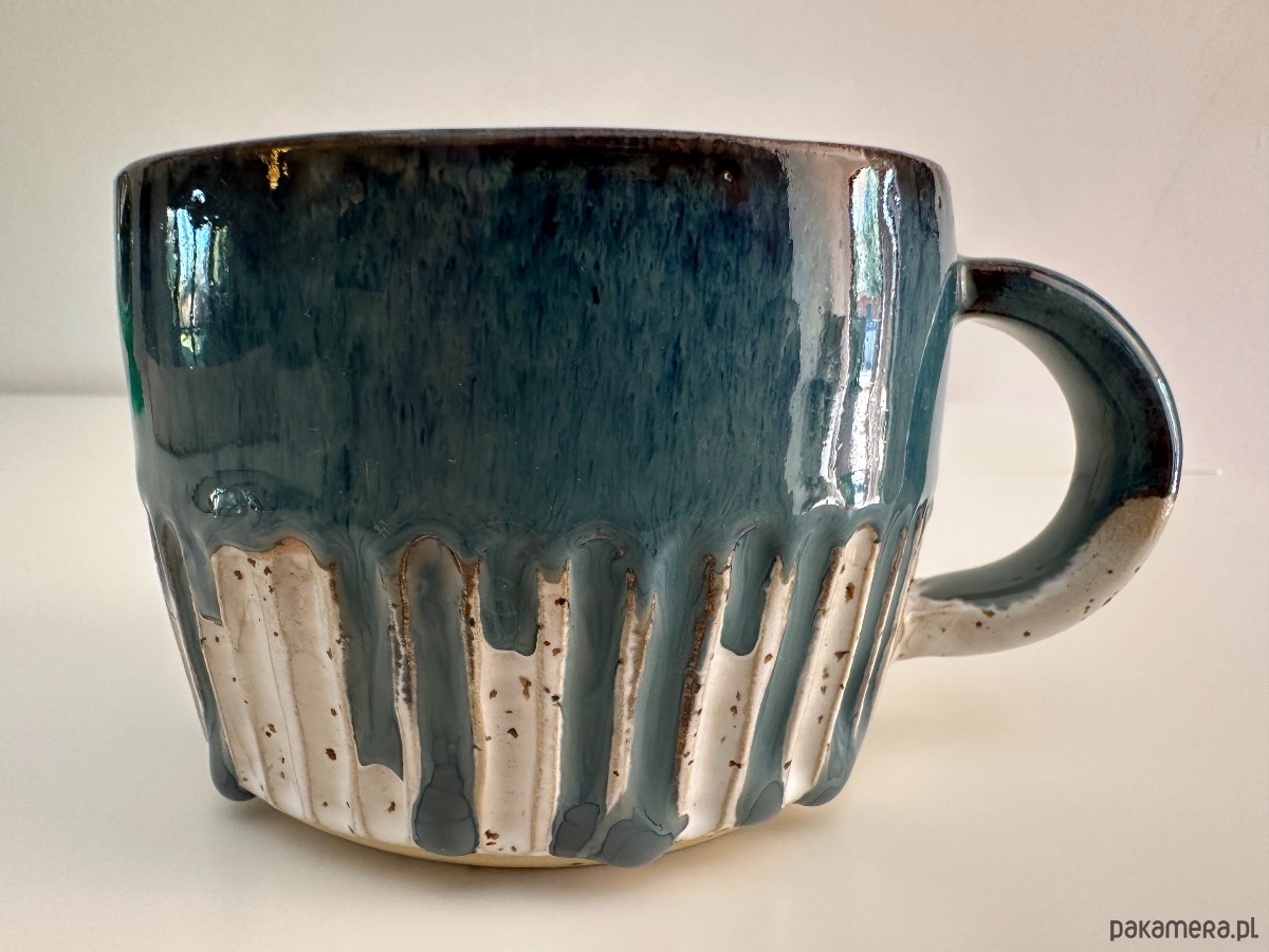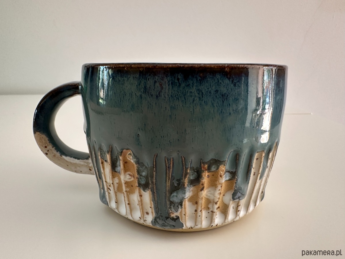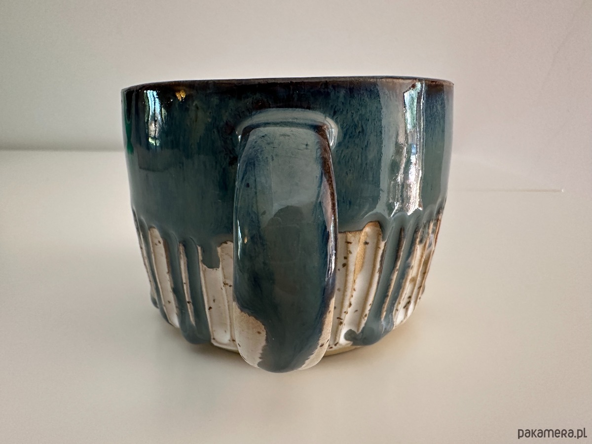 Oto wyjątkowy kubek stworzony na kole garncarskim, w którym połączyliśmy surowość kropkowanej gliny z magią szkliwionych powierzchni. Wnętrze oraz górna część kubka zostały pokryte efektownym niebieskim szkliwem, które przypomina spokojne fale oceanu. Dolna część zewnętrzna zachwyca bielą podkreślającą naturalną fakturę gliny, a całość dopełnia delikatny tłoczony szlaczek, dodający mu subtelnej elegancji.