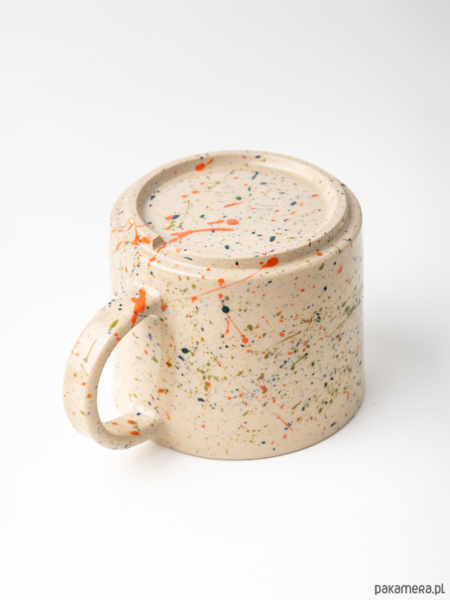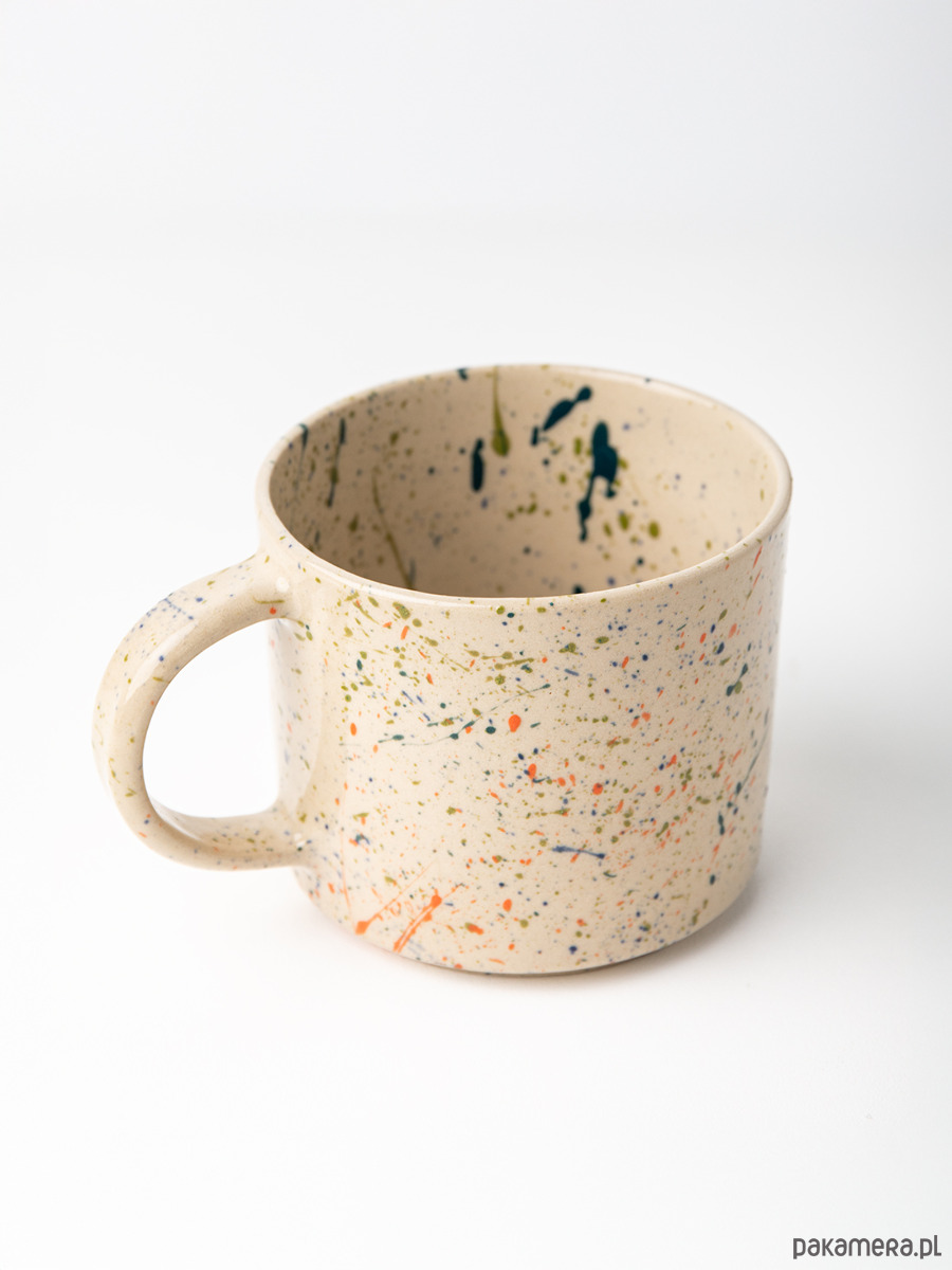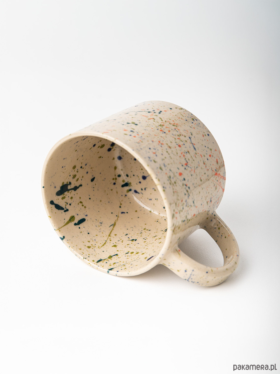 Ręcznie robiony ceramiczny kubek o spokojnej, minimalistycznej formie i solidnym, wygodnym uchu. Jasna glina ozdobiona kolorowym nakrapianym wzorem, dzięki któremu każdy egzemplarz wygląda nieco inaczej. Doskonały do codziennej kawy lub herbaty.