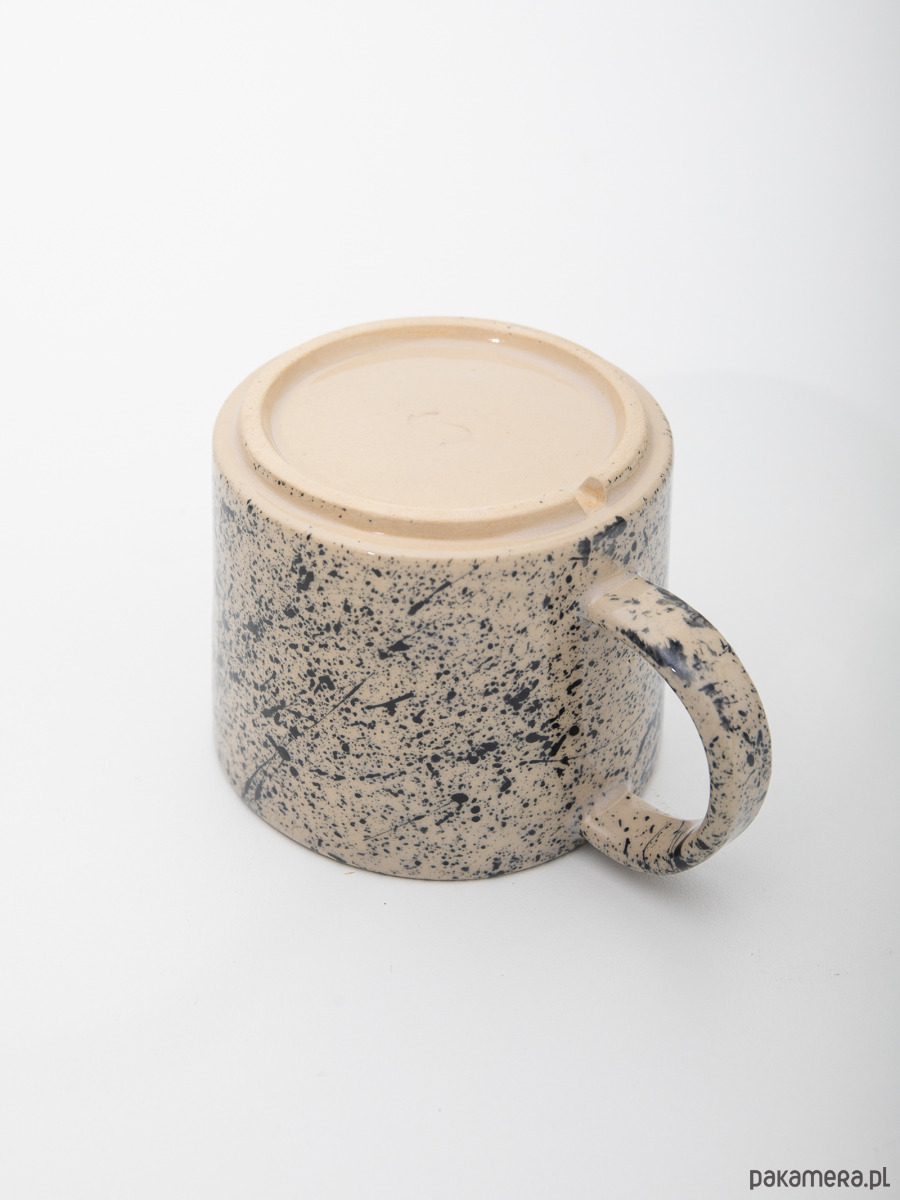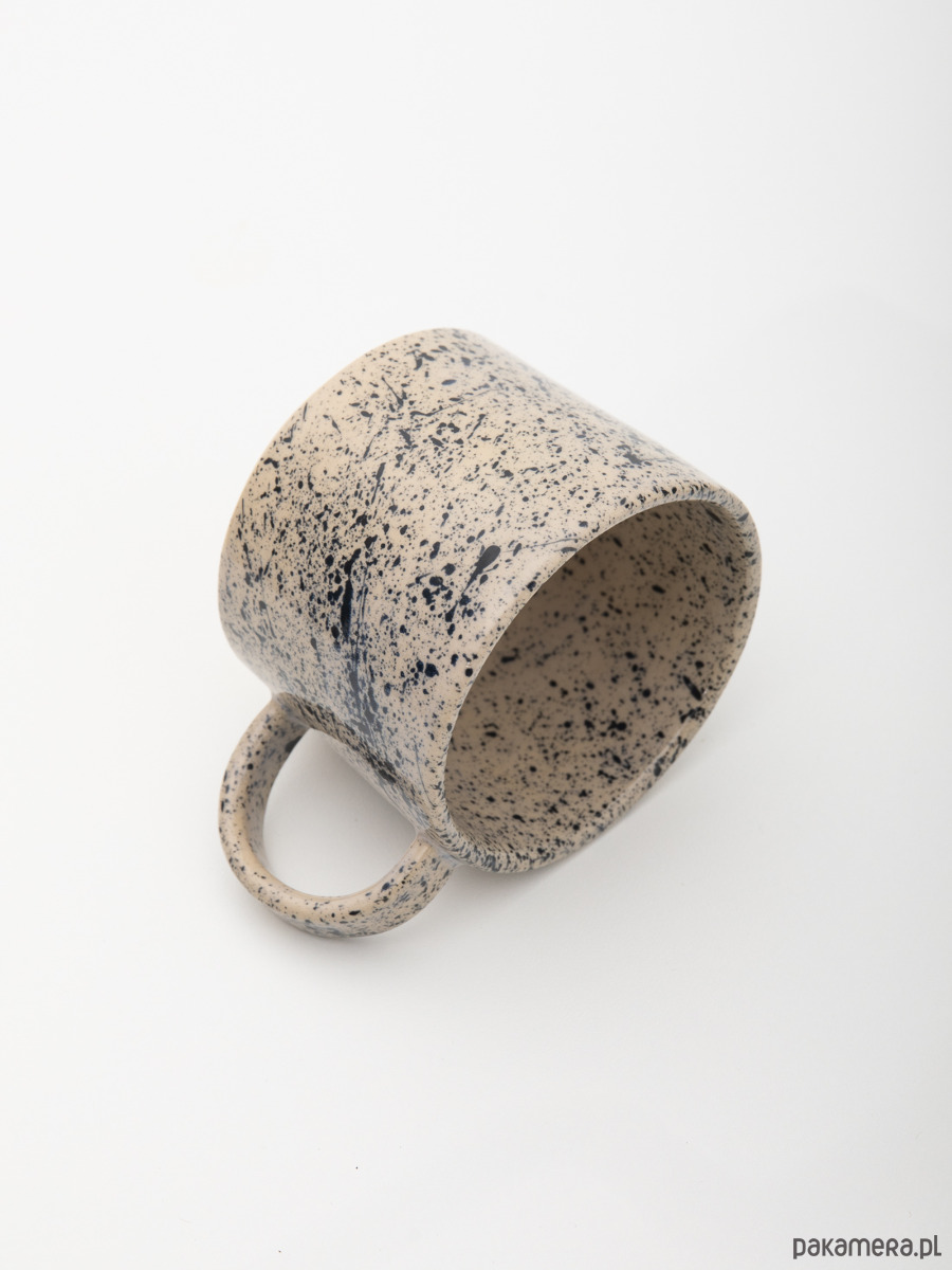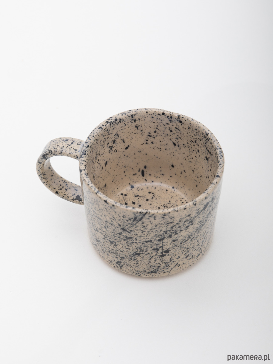 Ręcznie robiony ceramiczny kubek o spokojnej, minimalistycznej formie i solidnym, wygodnym uchu. Jasna glina ozdobiona kontrastującym nakrapianym wzorem, dzięki któremu każdy egzemplarz wygląda nieco inaczej. Doskonały do codziennej kawy lub herbaty.