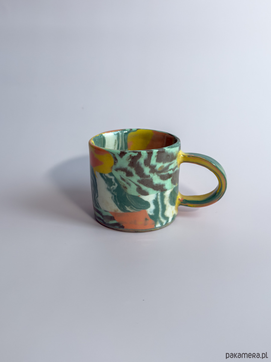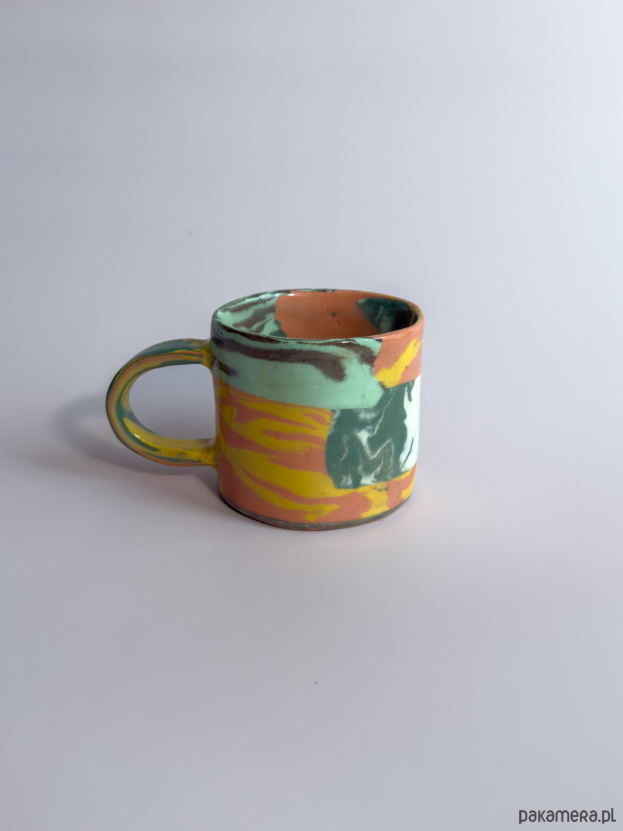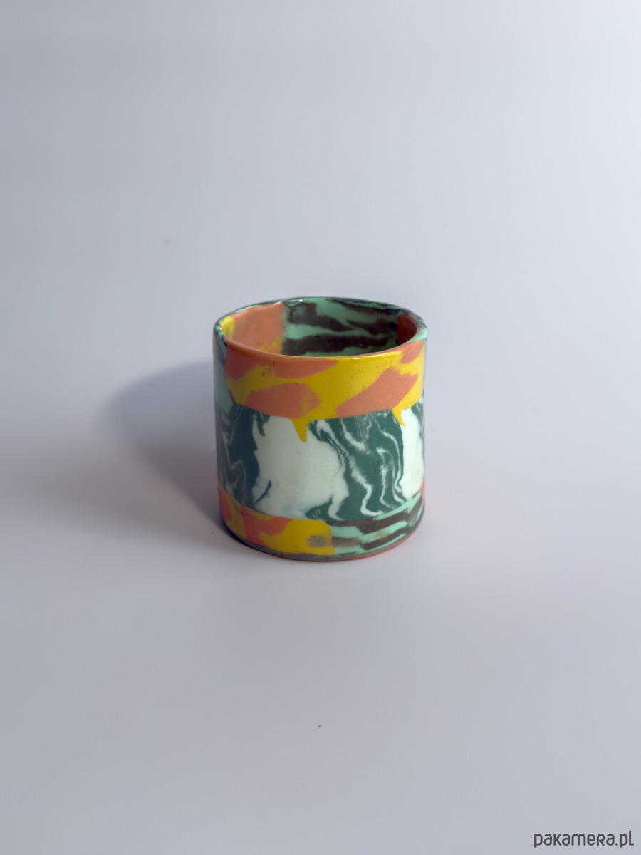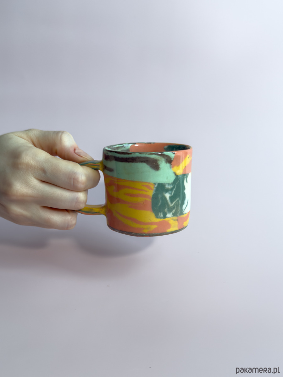 Kubek, wykonany ręcznie w technice nerikomi, w której wzór powstaje z połączenia barwionych mas gliny i jest częścią samego materiału.