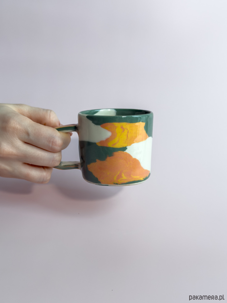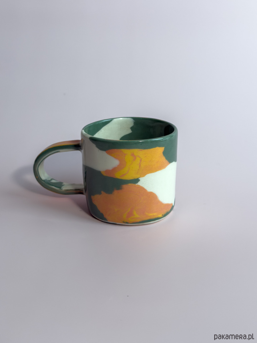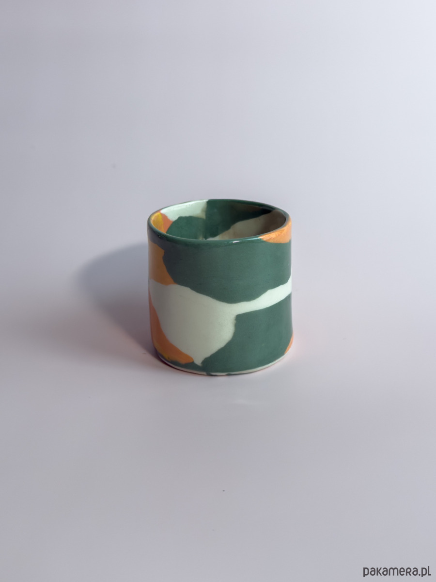 Kubek, wykonany ręcznie w technice nerikomi, w której wzór powstaje z połączenia barwionych mas gliny i jest częścią samego materiału.