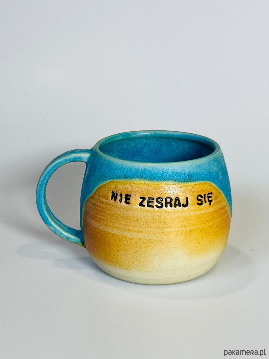Duży ceramiczny kubek 420 ml w turkusowo-miodowej kolorystyce z napisem „NIE ZESRAJ SIĘ” — idealny na kawę z dystansem i prezent z humorem.