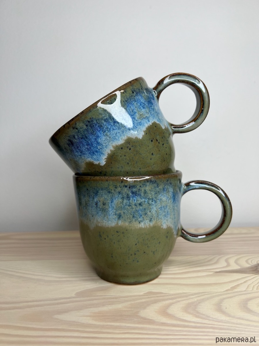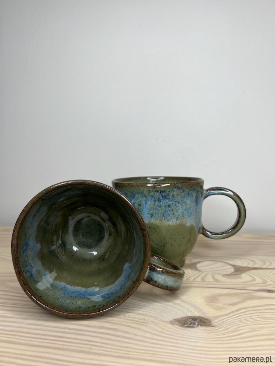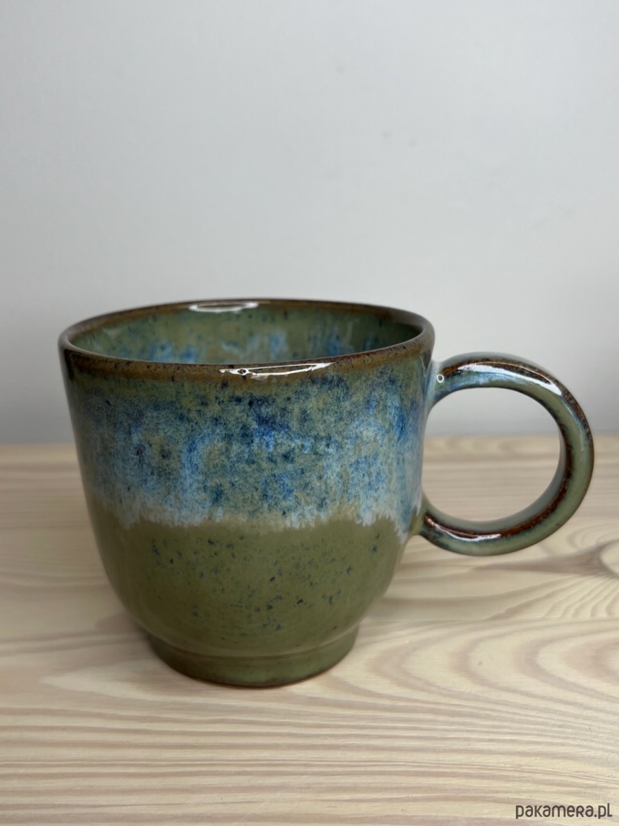 Kubek wykonany z gliny kamionkowej, pokryty wewnątrz i na zewnątrz szkliwem dopuszczonym do kontaktu z żywnością.