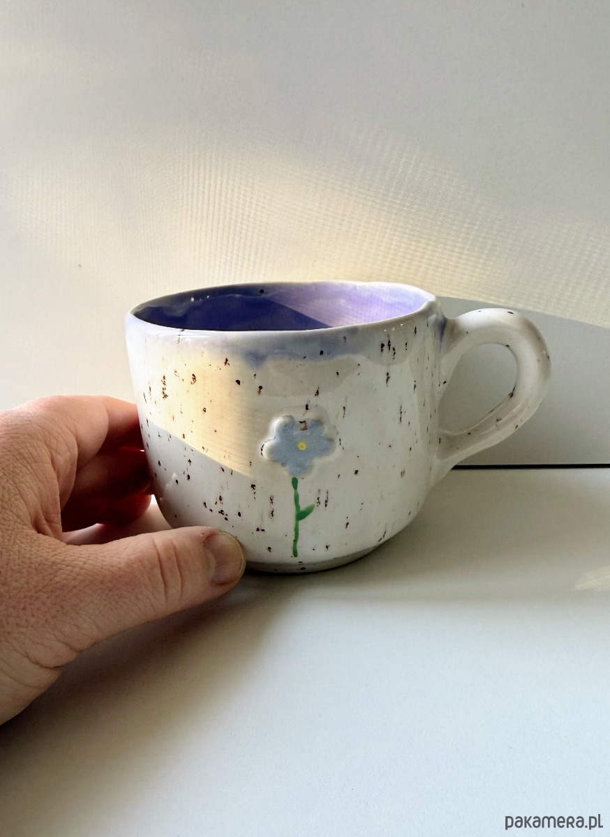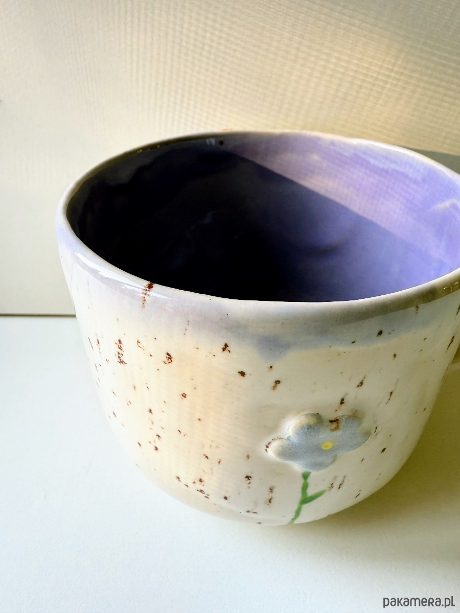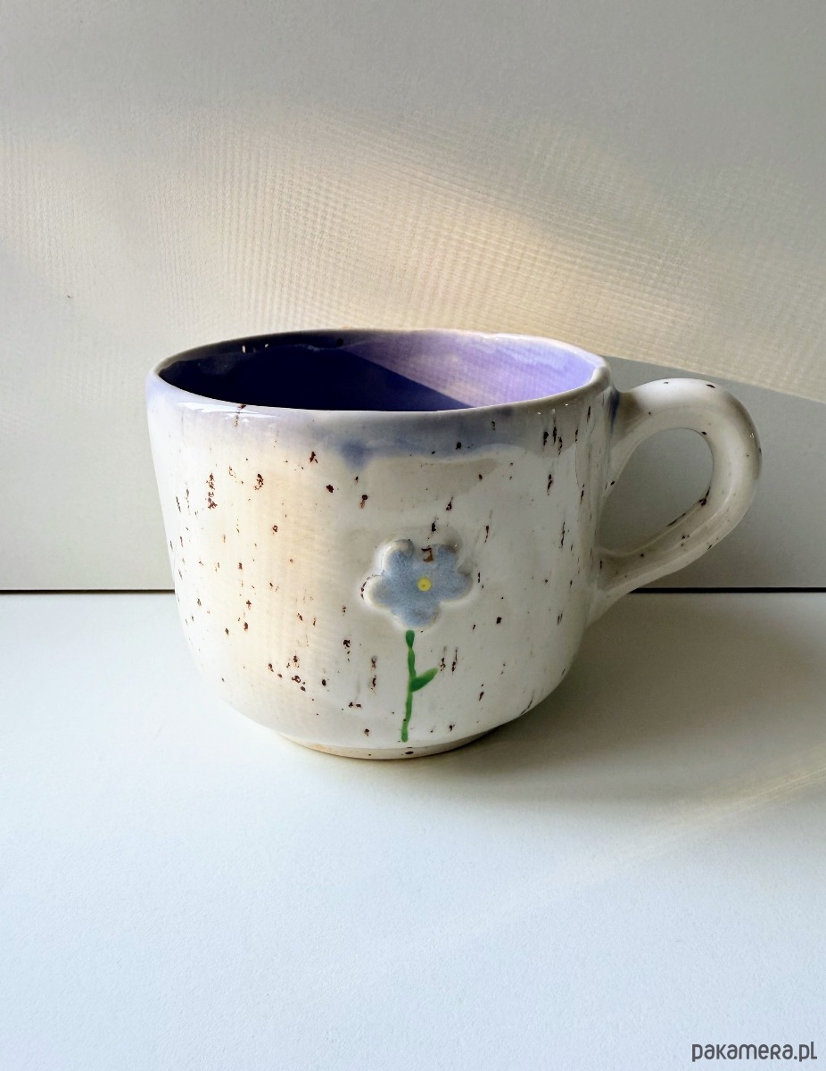 Kubek z błękitnym kwiatkiem - niezapominajką, pokryty białym szkliwem z piegami, wewnątrz pastelowy fiolet. Idealny na większą herbatę, zioła, kawę bądź czekoladę. Każda sztuka jest unikatowa, wykonana z jasnej gliny. Wszystkie nasze naczynia można myć w zmywarce. Pojemność ok 350 ml.