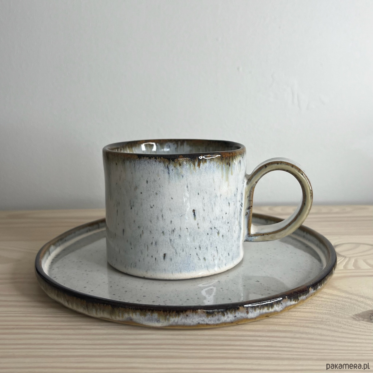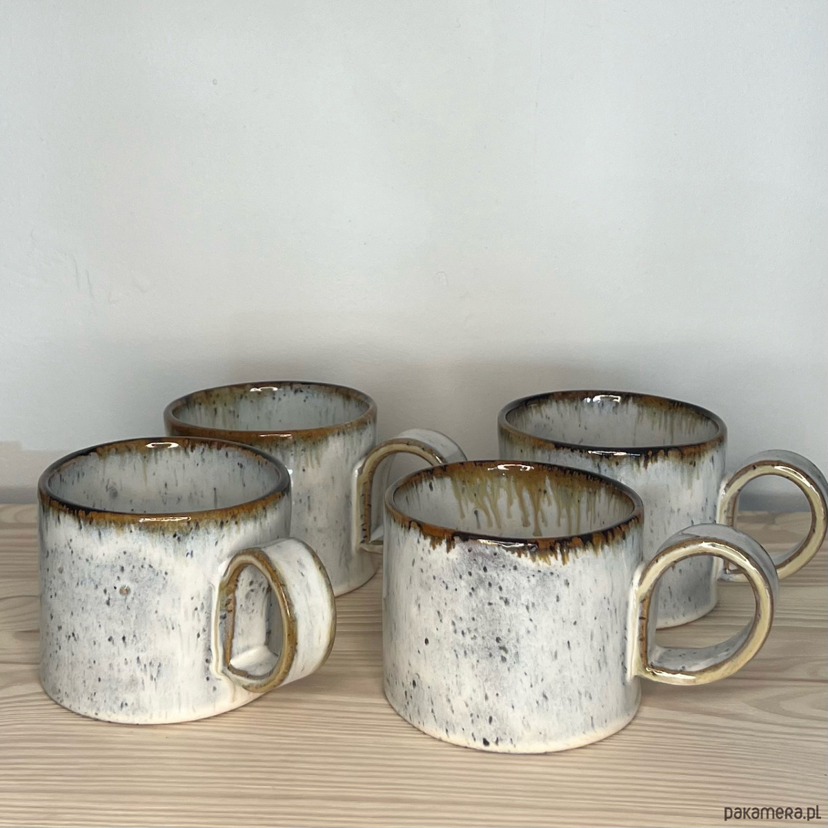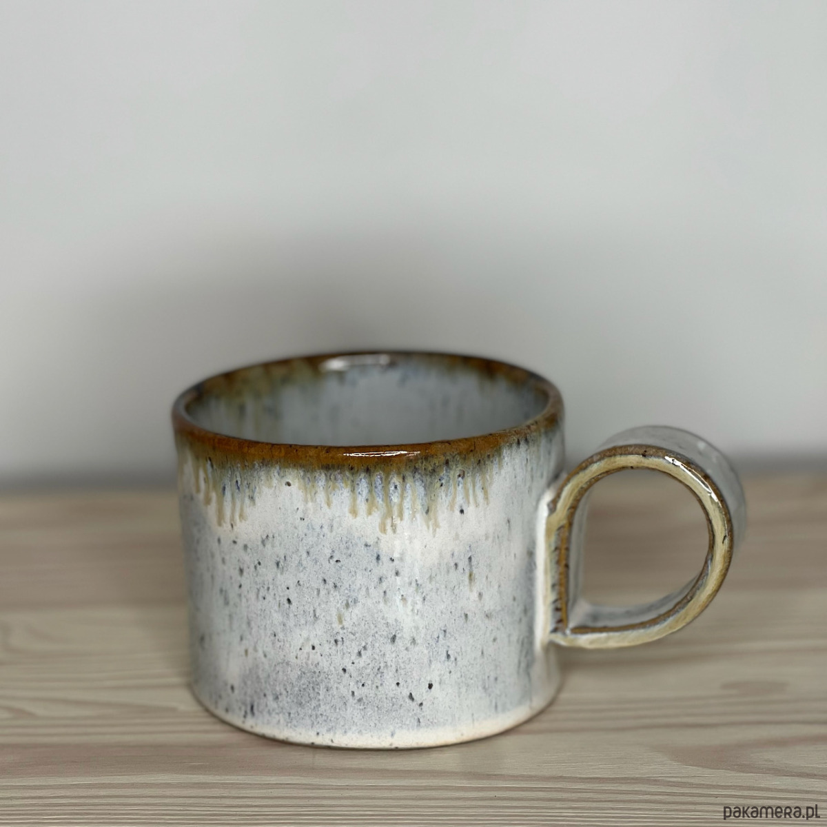 Kubek wykonany z gliny w kropeczki, pokryty wewnątrz i na zewnątrz szkliwem dopuszczonym do kontaktu z żywnością.