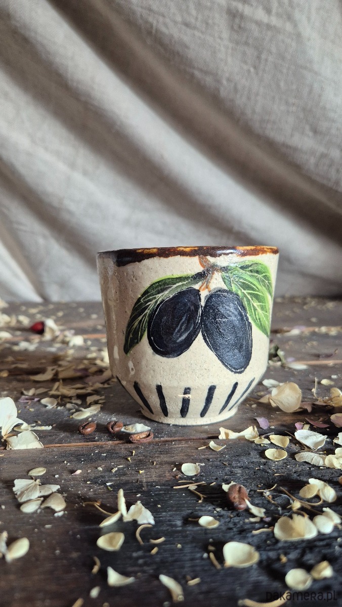 Kubek z ręczną ilustracją oliwek. Soczyste czarne, greckie zamknięte w ilustracji w kubku. Kubek przywołujący w myślach greckie wakacje. Pojemniść 200 ml. Można myć w zmywarce. Wypał 1230 stopni. Idealny preznet. Ilustracja bez użycia kalek, odręczna :) dla wszystkich ceniących unikatowość przedmiotów.