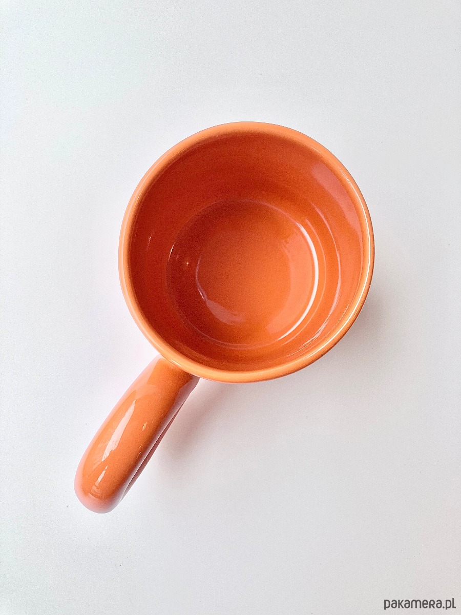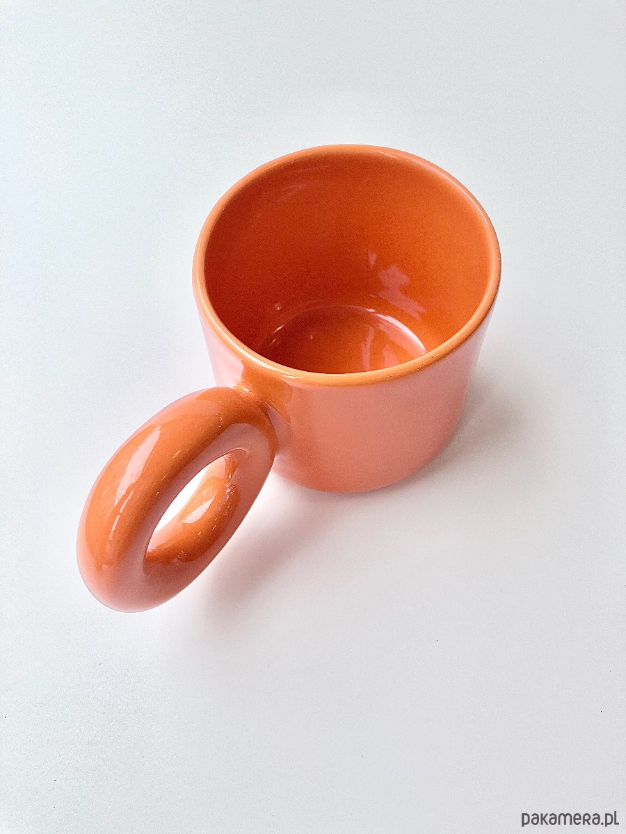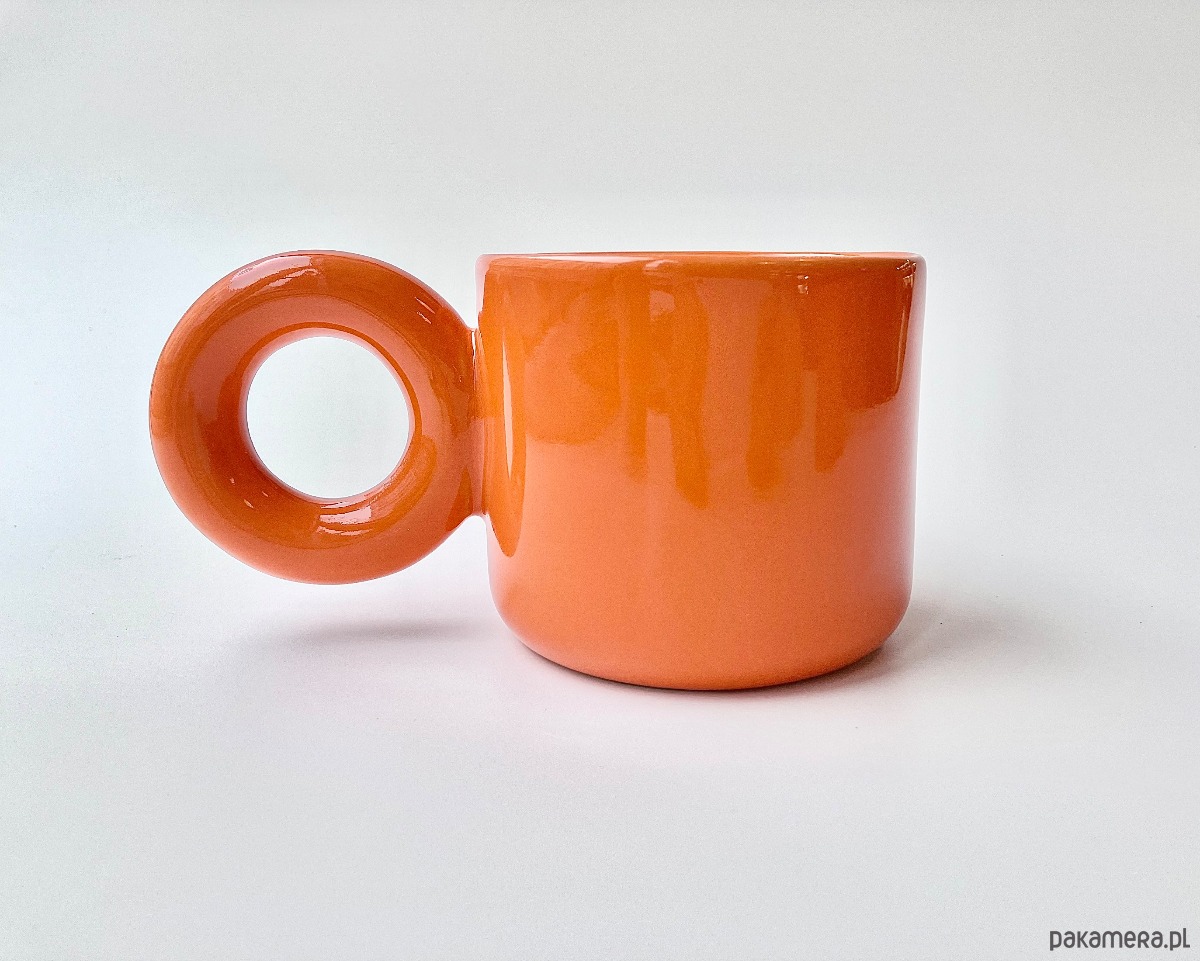 Stylowy kubek o pojemności 300 ml, który przyciąga uwagę nowoczesną formą i ciepłym kolorem. Wykonany z ceramiki, pokryty błyszczącym szkliwem w odcieniu pomarańczu, prezentuje się elegancko i oryginalnie.