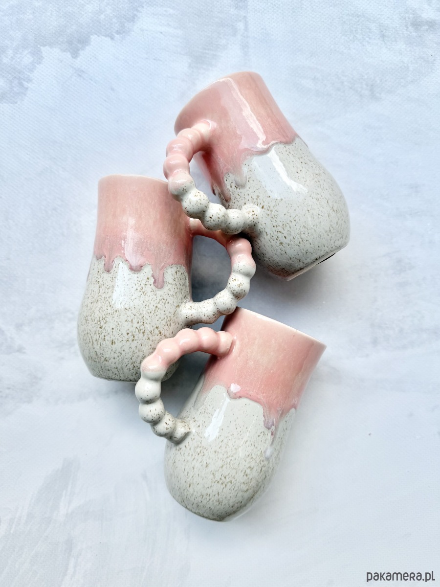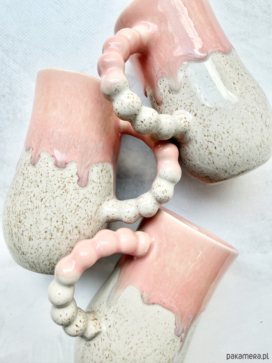 Górną część zdobią szkliwa w odcieniach różu i fioletu, które tworzą naturalne, płynne zacieki przypominające spływającą słodką polewę. Dolna część kubka to delikatnie nakrapiany beż.