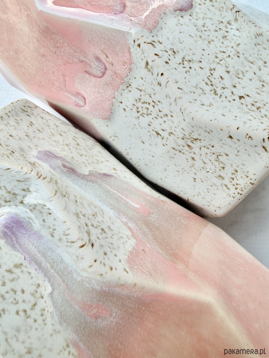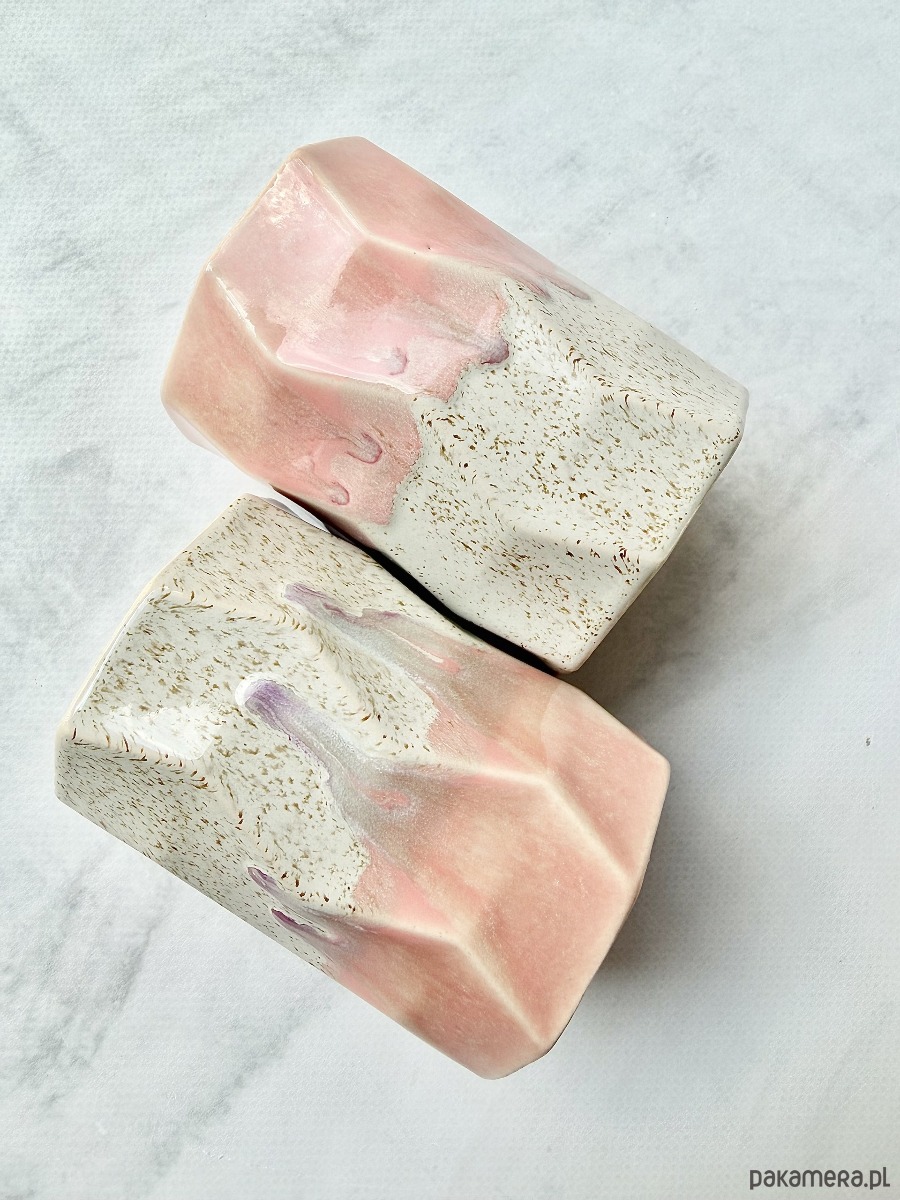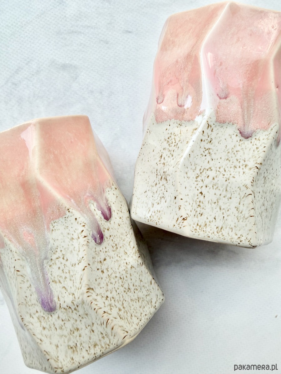 Górną część zdobią szkliwa w odcieniach różu i fioletu, które tworzą naturalne, płynne zacieki przypominające spływającą słodką polewę. Dolna część kubka to delikatnie nakrapiany beż.