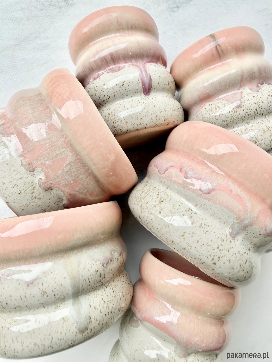 Górną część zdobią szkliwa w odcieniach różu i fioletu, które tworzą naturalne, płynne zacieki przypominające spływającą słodką polewę. Dolna część kubka to delikatnie nakrapiany beż.