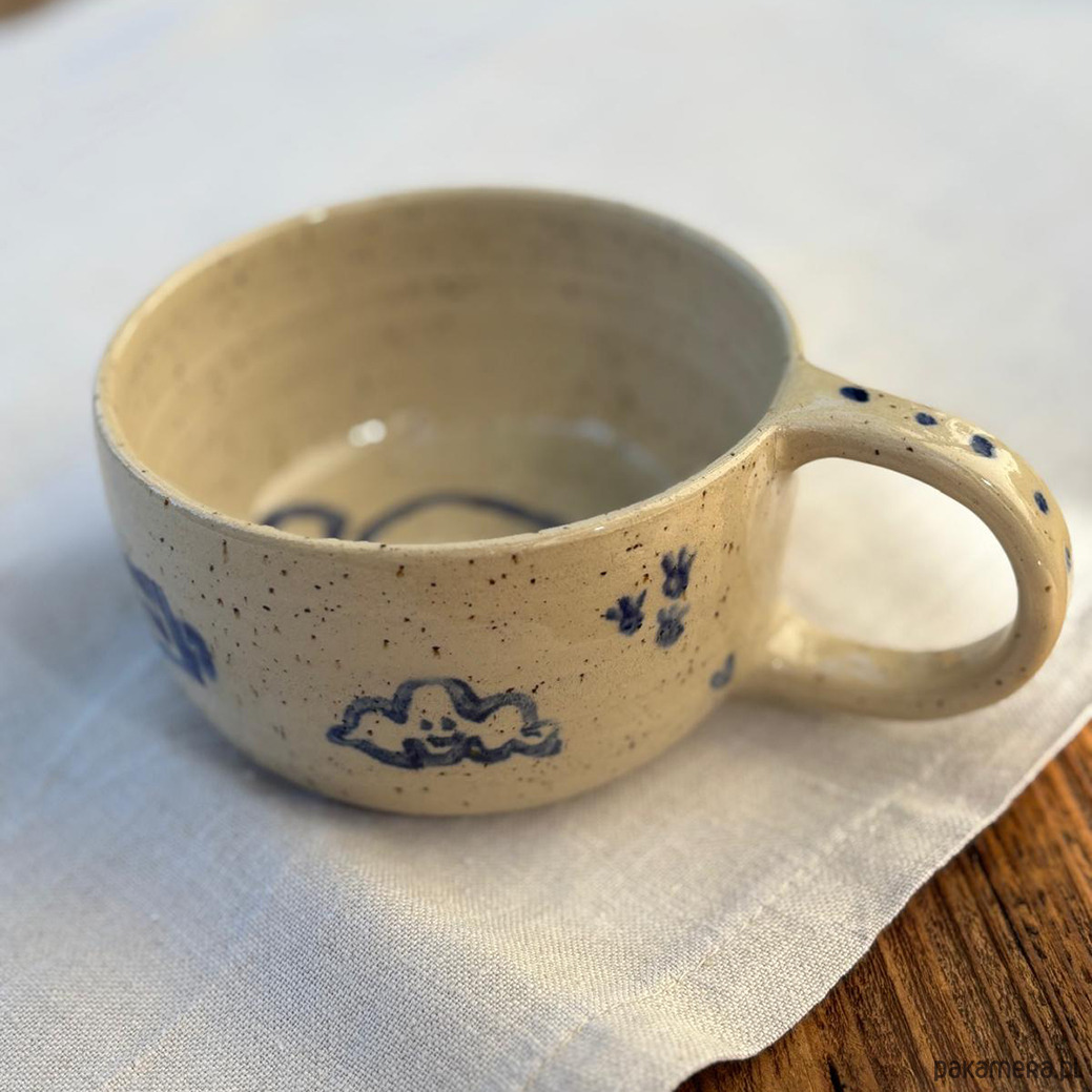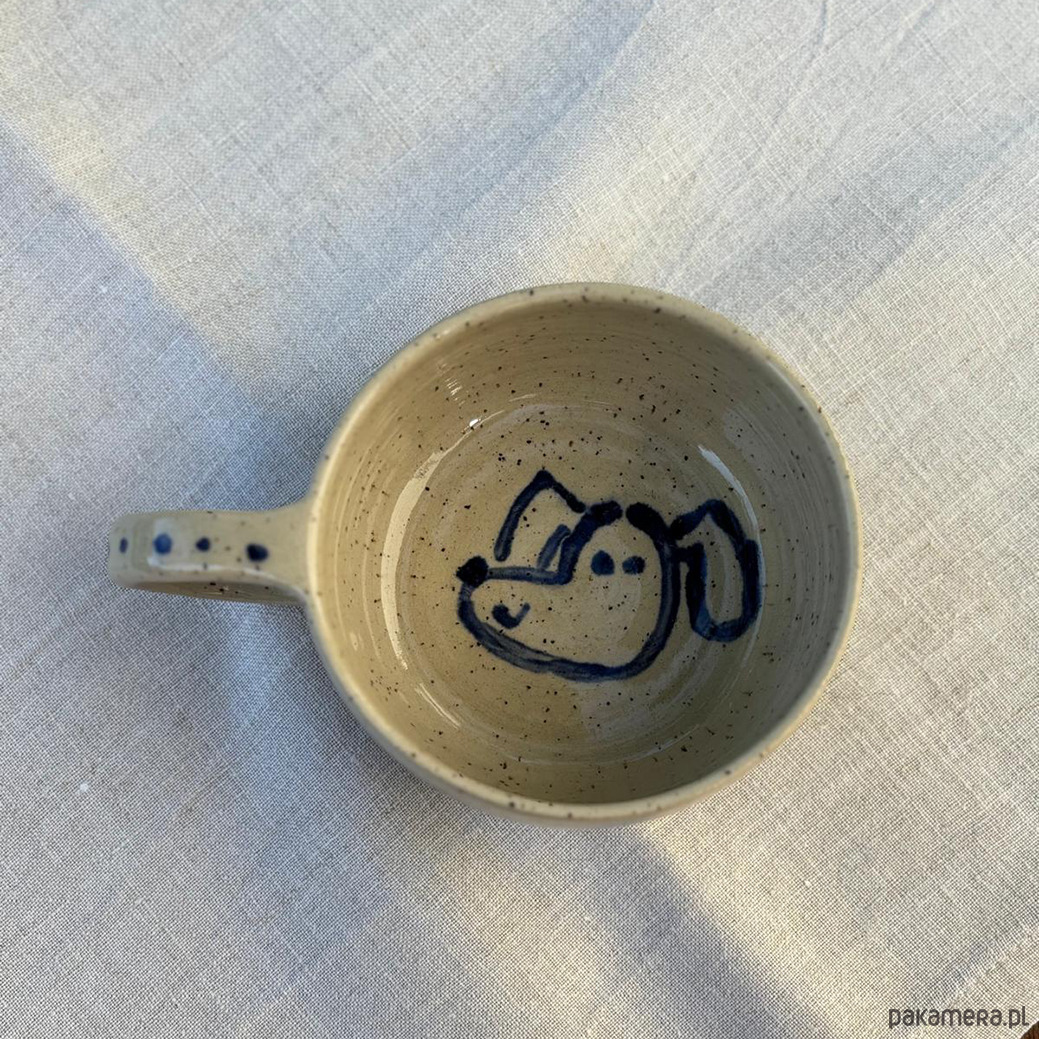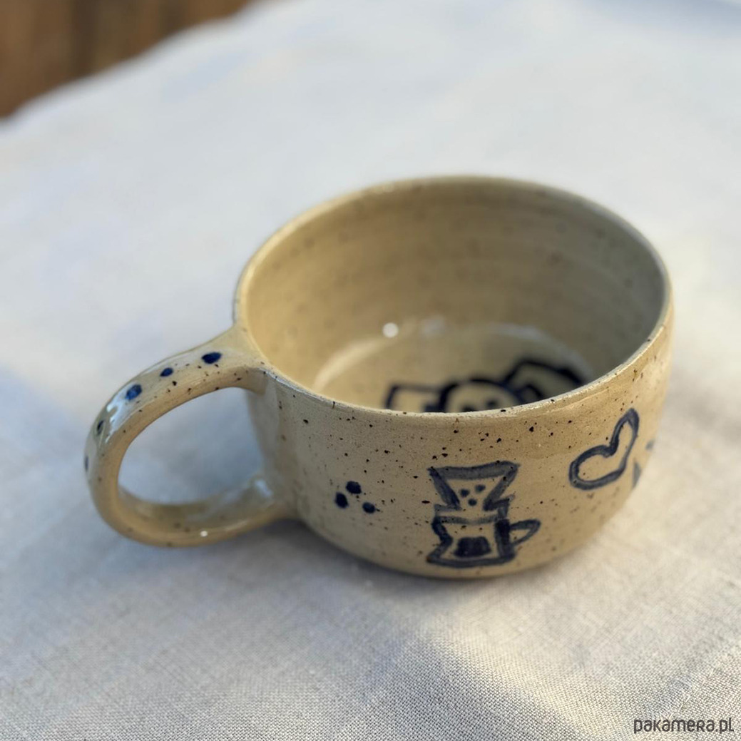 Kubek lepiony ręcznie na kole z jasnokremowej gliny w kropki. Malowany granatową farbką z zewnątrz i wewnątrz.