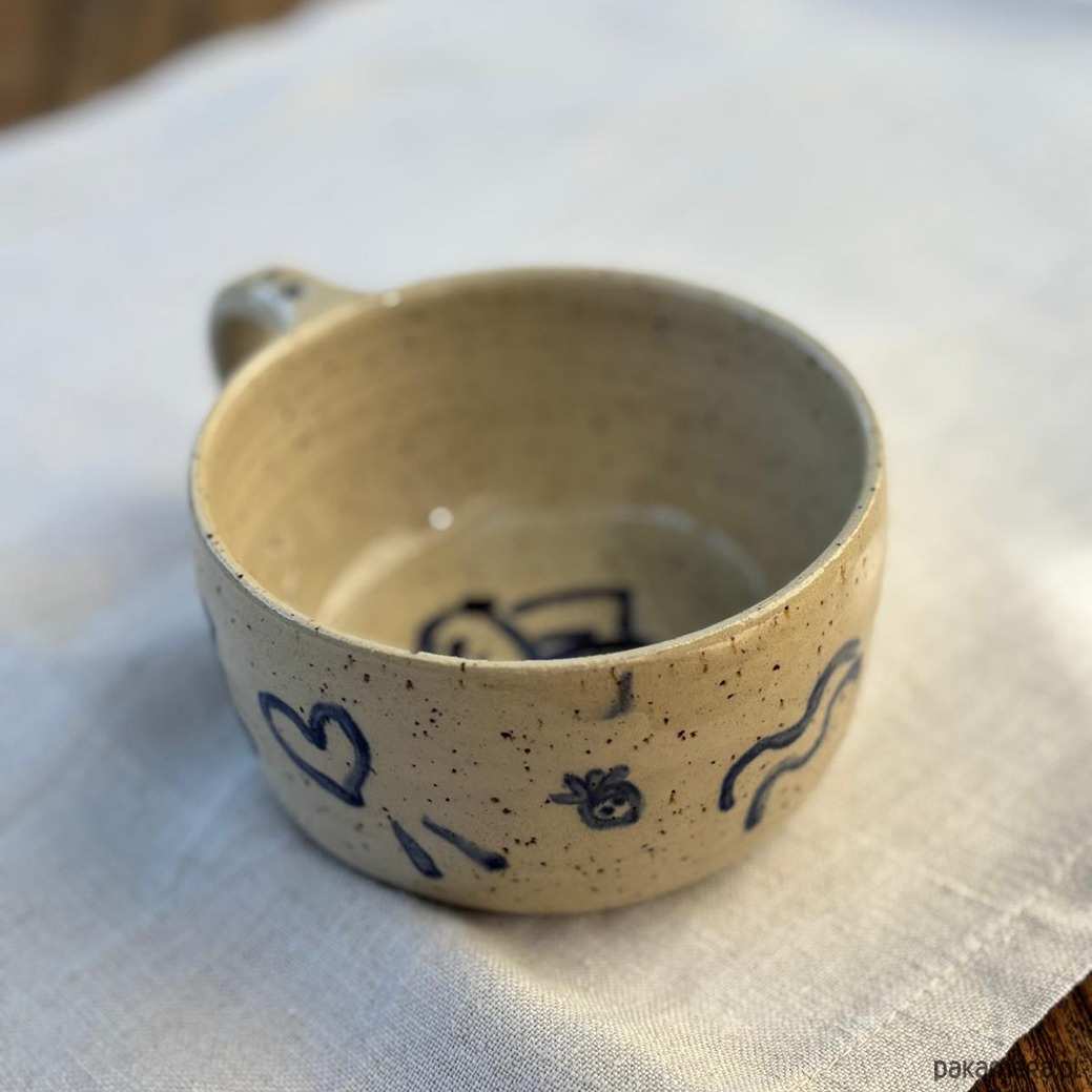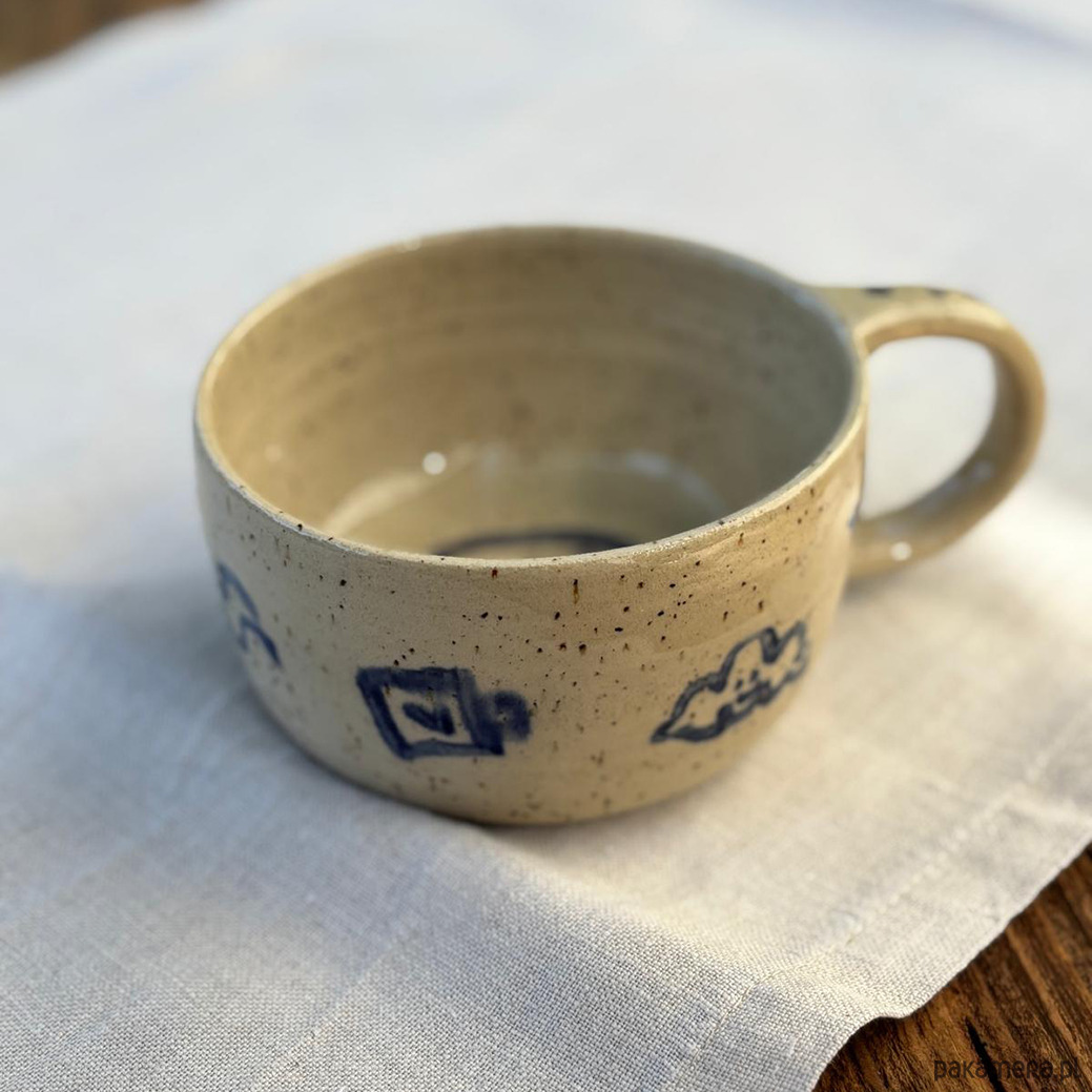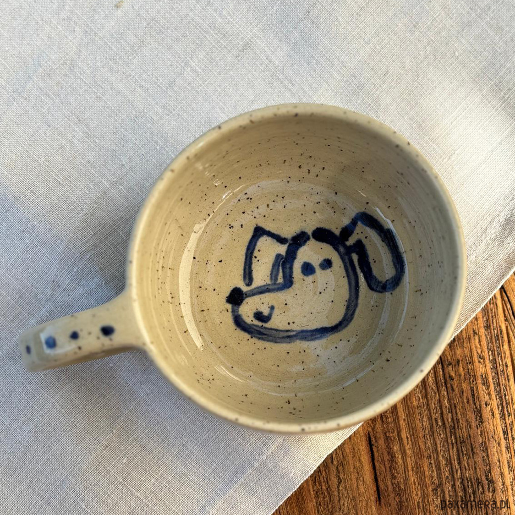 Kubek lepiony ręcznie na kole z jasnokremowej gliny w kropki. Malowany granatową farbką z zewnątrz i wewnątrz.