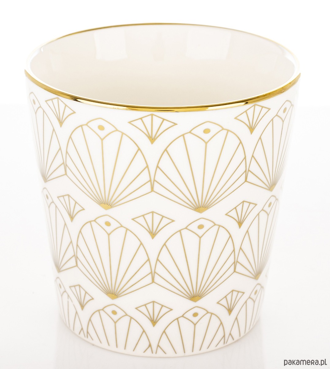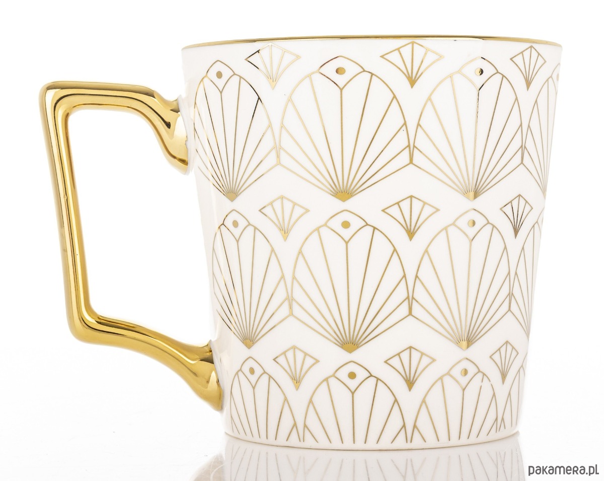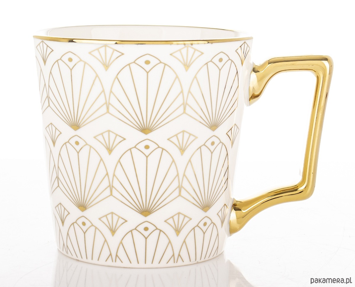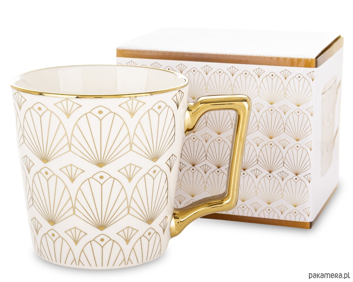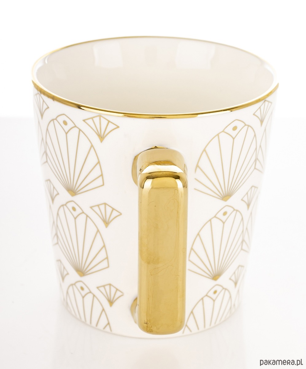 Pojemny kubek wykonany z porcelany dobrze trzymającej ciepło. Biały, ze wzorem złotych wachlarzyków, które pokrywają zewnętrzną powierzchnię kubka. Wyposażony w wygodny, duży złoty uchwyt do przenoszenia.