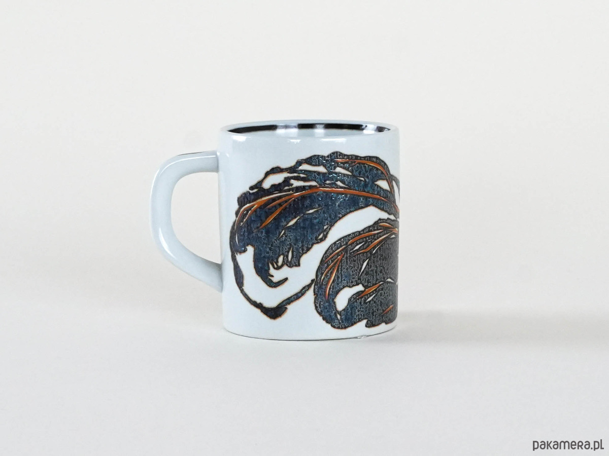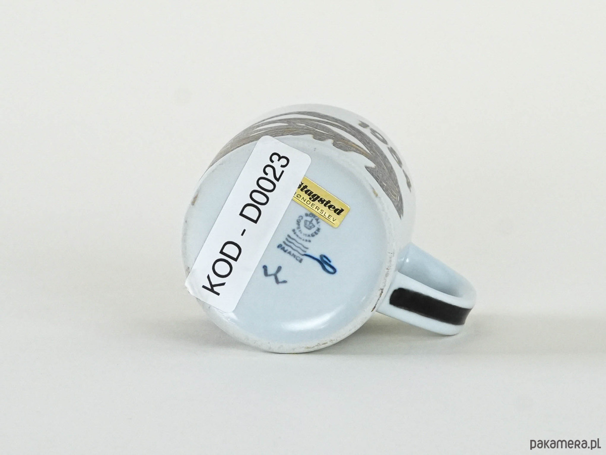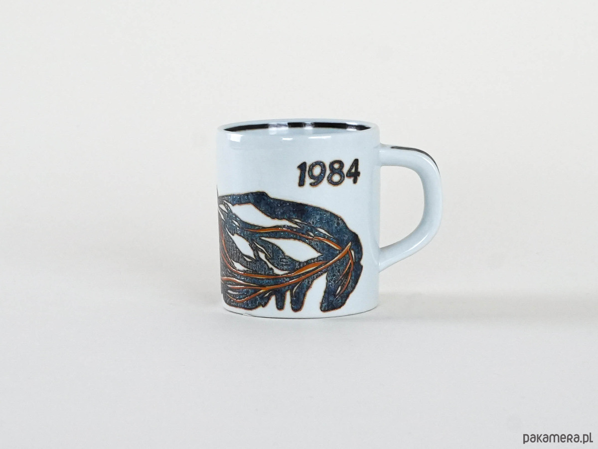 Rzadki kubek rocznicowy Royal Copenhagen z 1984 roku, zaprojektowany przez duńskiego malarza i grafika Mogensa Andersena. Dekoracja utrzymana w czerni i brązie ma wyrazistą fakturę i abstrakcyjny, ekspresyjny charakter, typowy dla twórczości artysty. Egzemplarz pochodzi z prestiżowej serii limitowanych kubków rocznicowych, które Royal Copenhagen wydawał każdego roku, czyniąc z nich dziś poszukiwane kolekcjonerskie przedmioty.