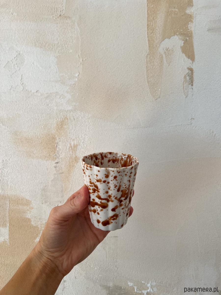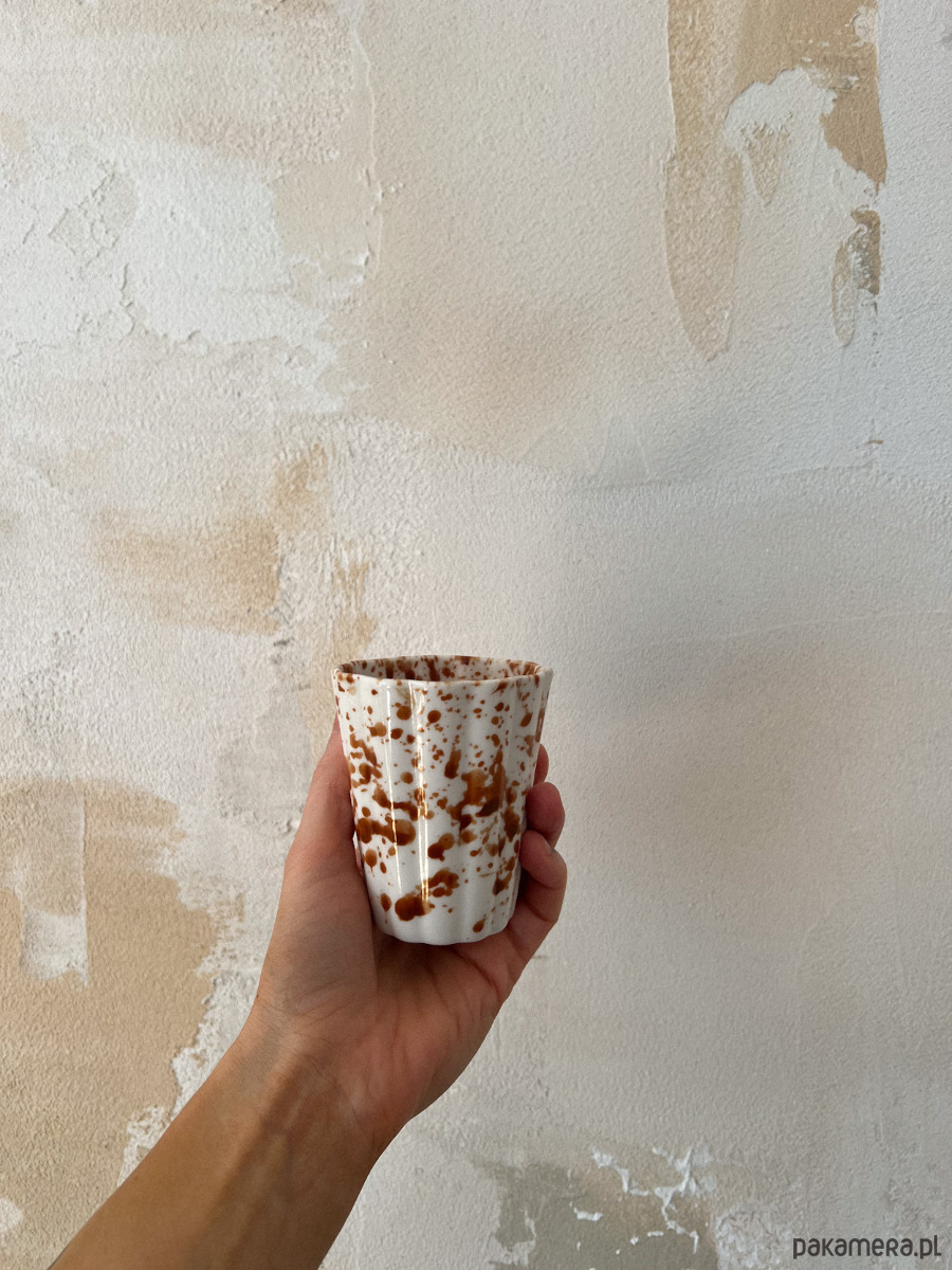 Porcelanowy kubek nakrapiany czekoladowymi o pojemności 180 ml.