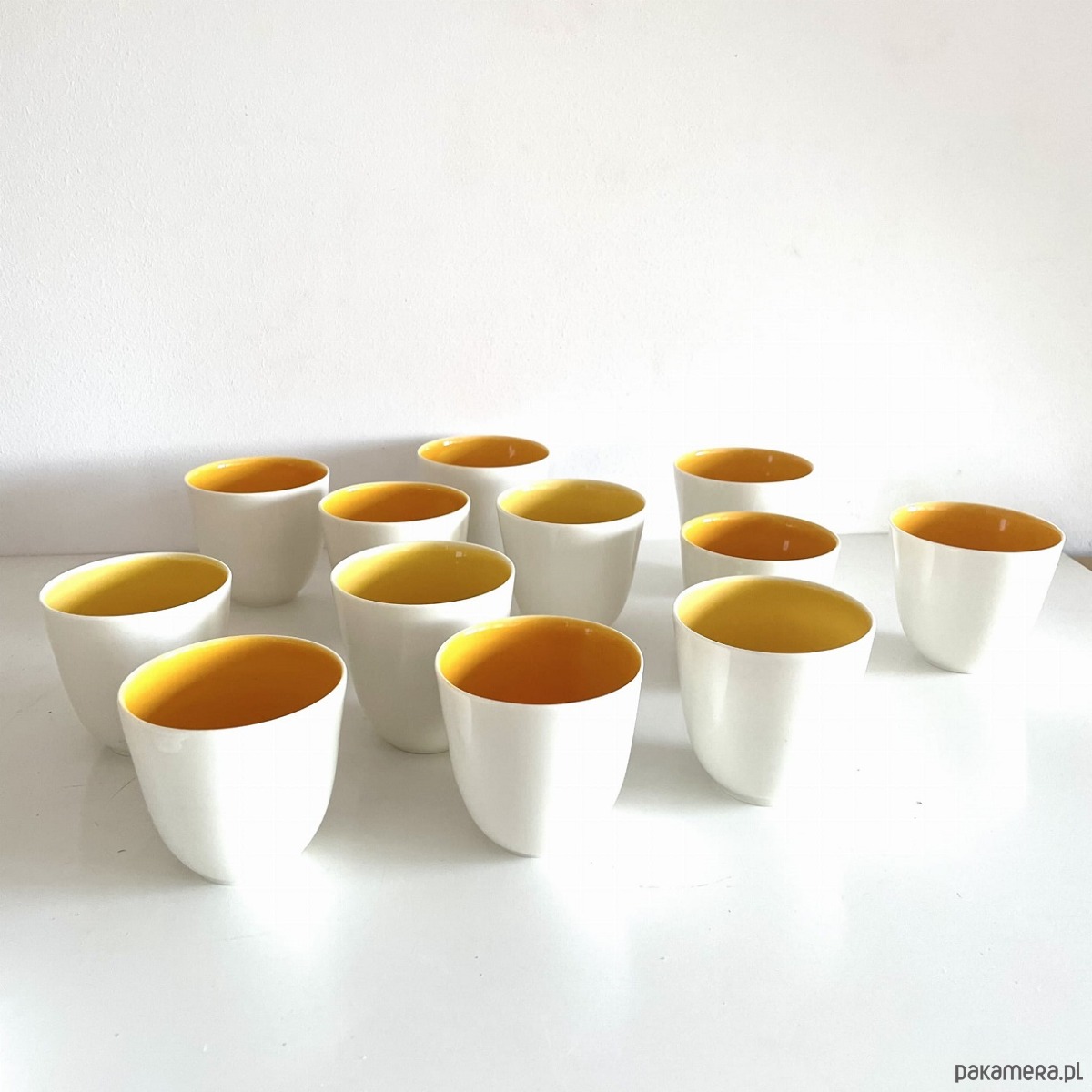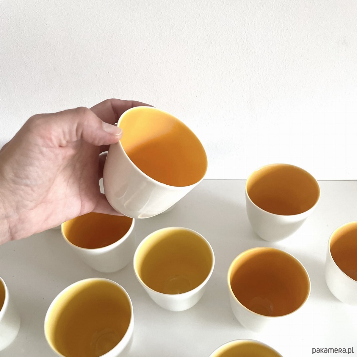 Kubek porcelanowy toczony na kole garncarskim. Na zewnątrz biały, w środku ciemno-żółty. Błyszczący.