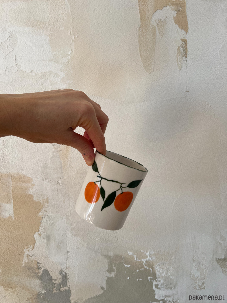 Porcelanowy kubek z pomarańczami z zielonym rantem o pojemności 300 ml.