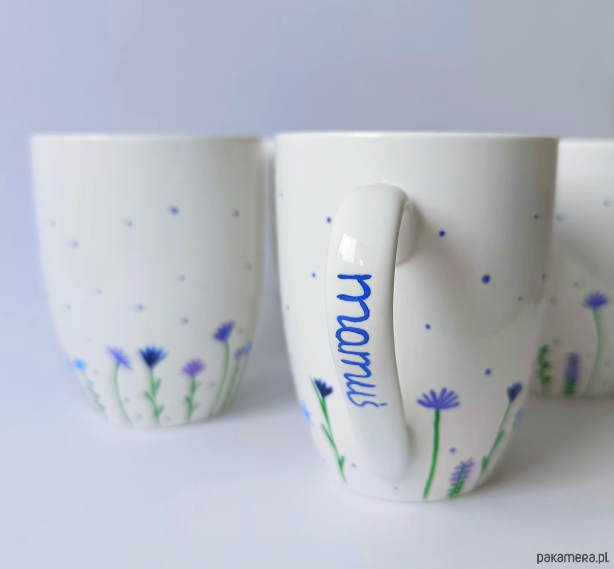 Biały kubek o pojemności 230ml z ręcznie malowanymi kwiatami i delikatnym napisem MAMUŚ na uchu.