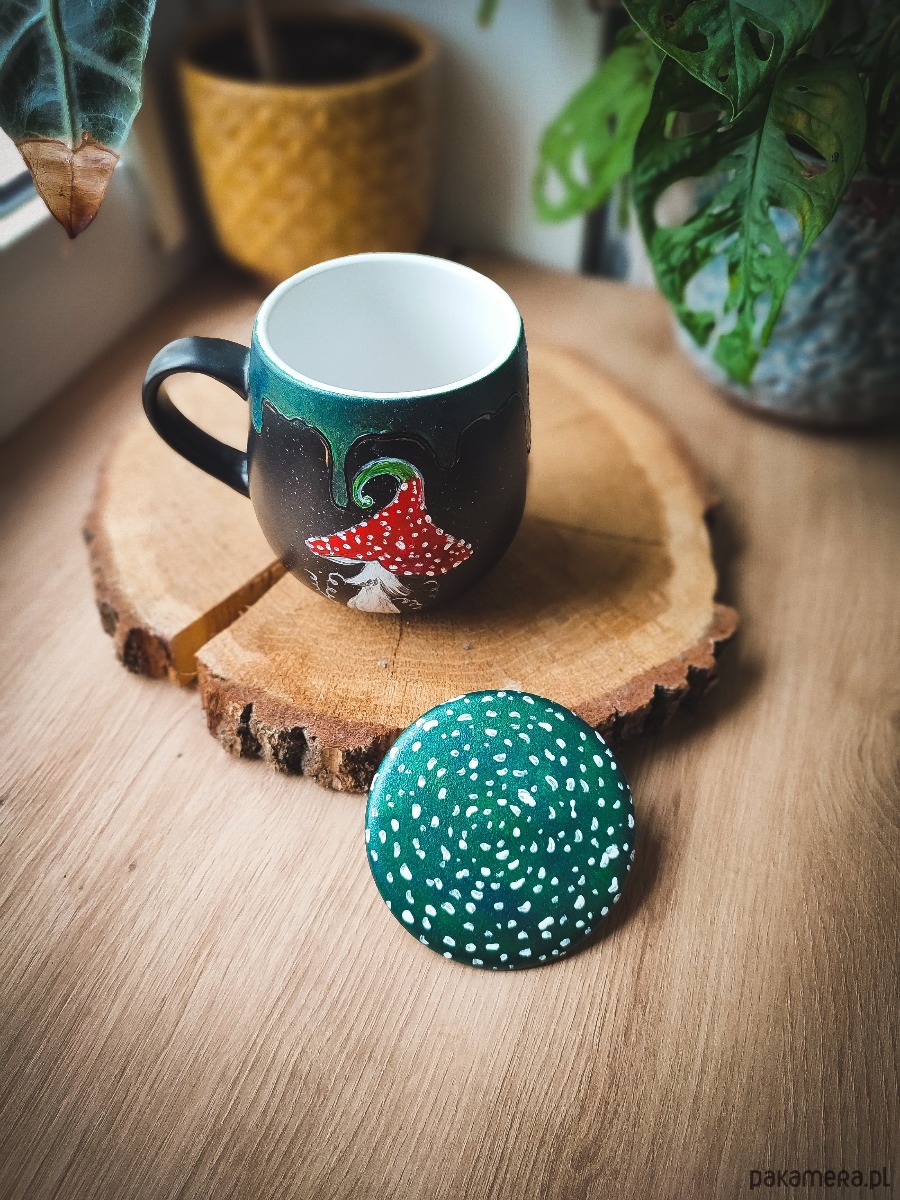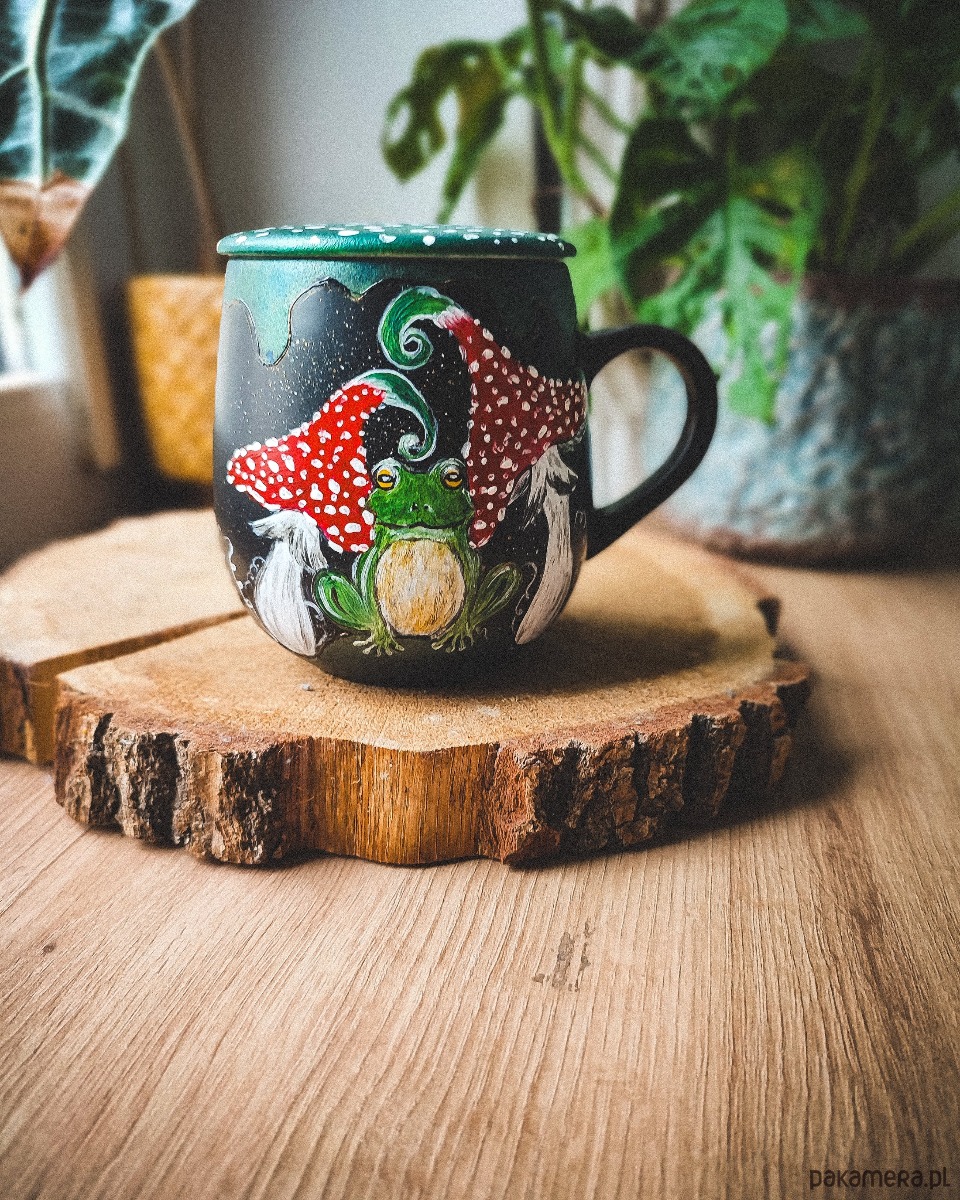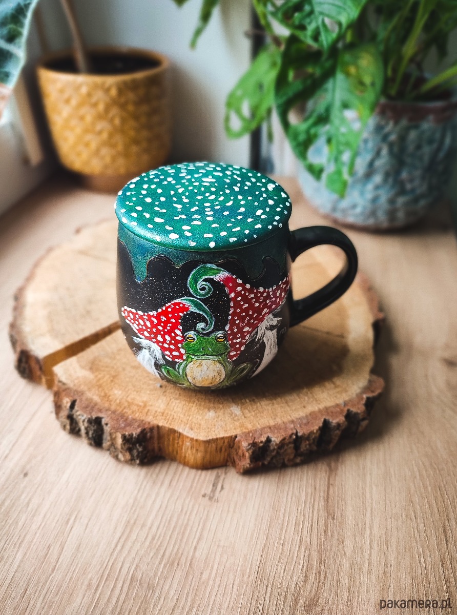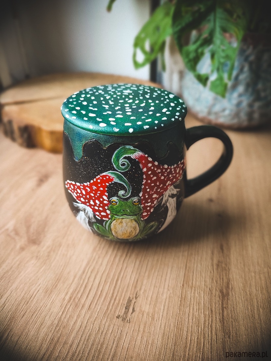 Duży kubek z pokrywką z ręcznie malowanym motywem żaby i muchomorów