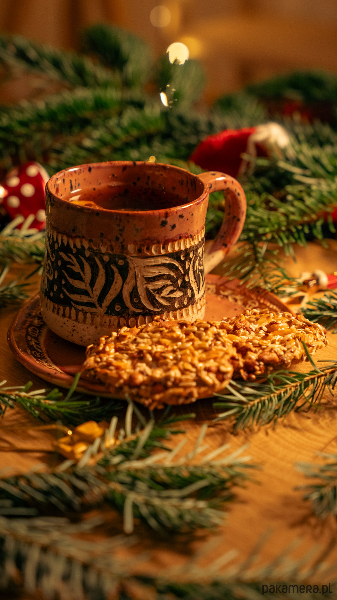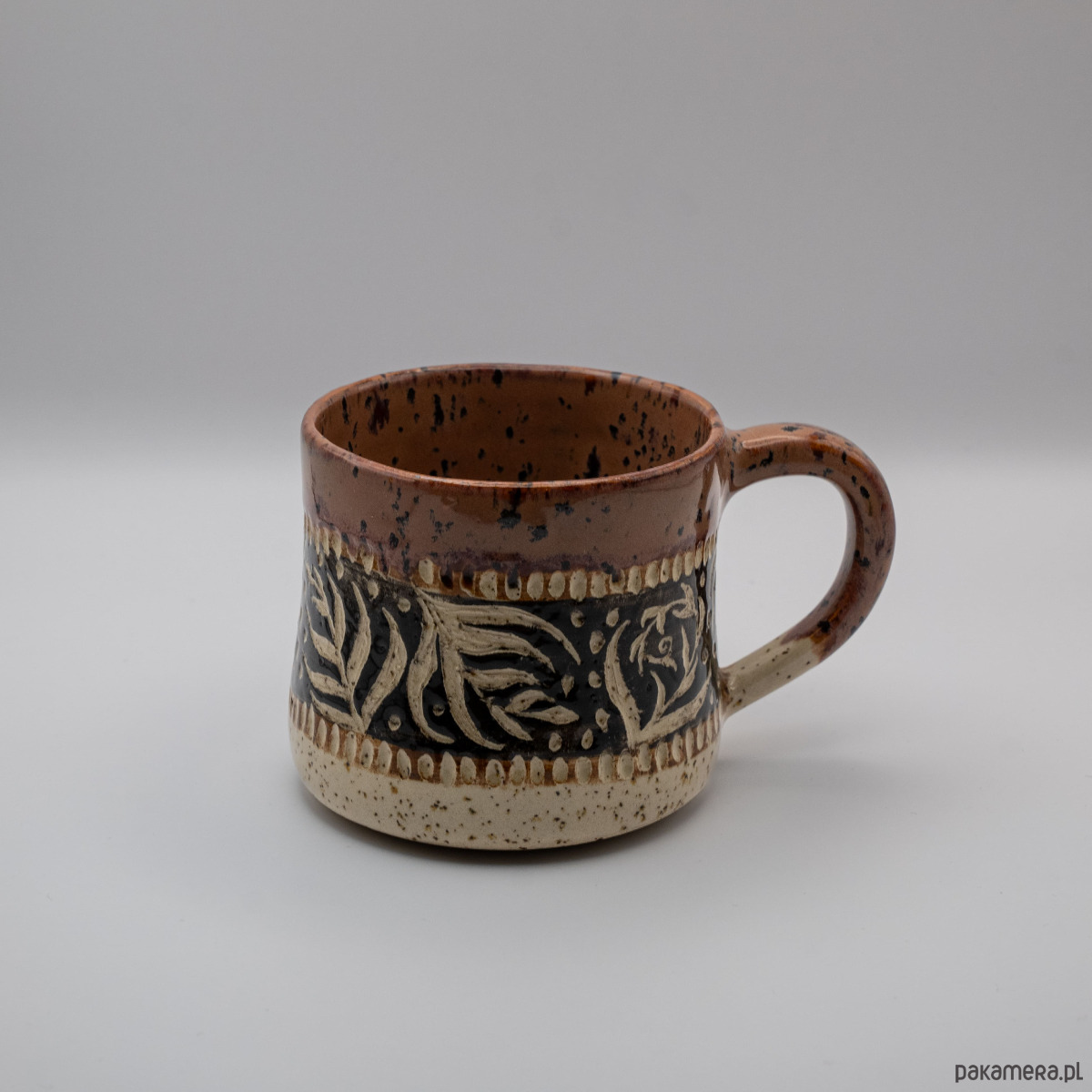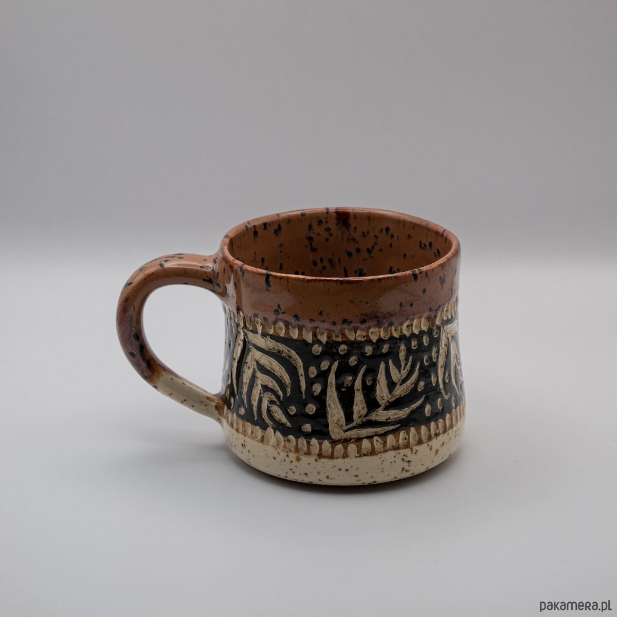 Kubek wykonany na kole garncarskim z beżowej gliny w kropki, pokryty brązowym szkliwem w czarne kropki. Zdobiony metodą sgraffito, ze wzorem paproci na czarnym tle. Pamiętaj, że kupujesz produkt wykonywany ręcznie. Drobne nieregularności są naturalną cechą ręcznej produkcji i dodają charakteru każdemu przedmiotowi.