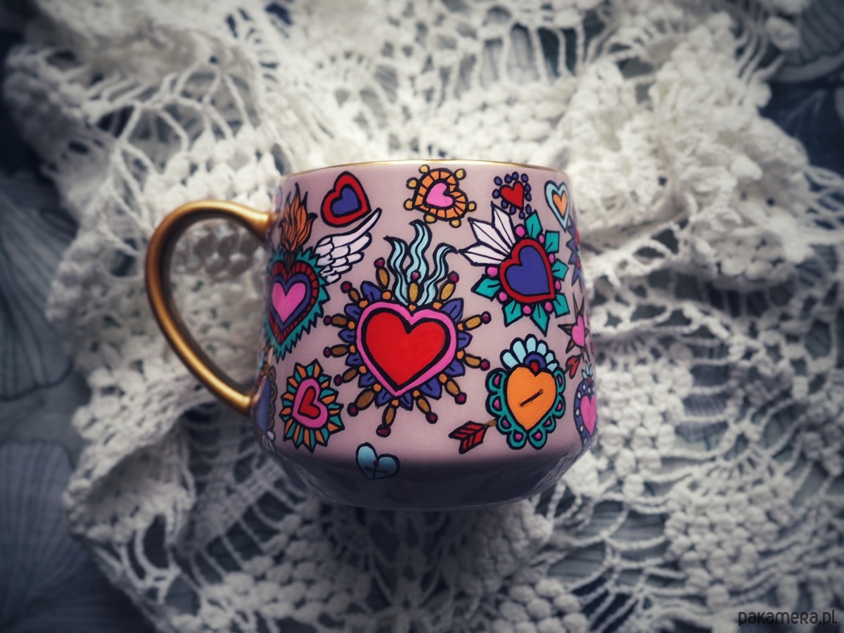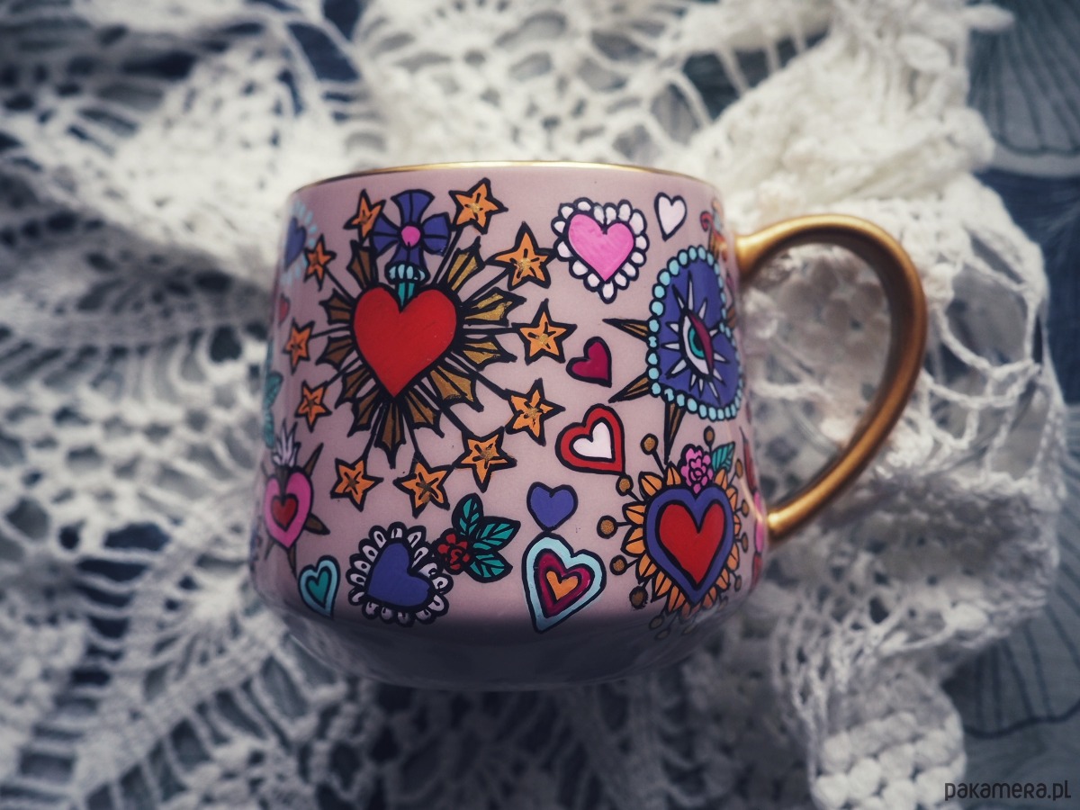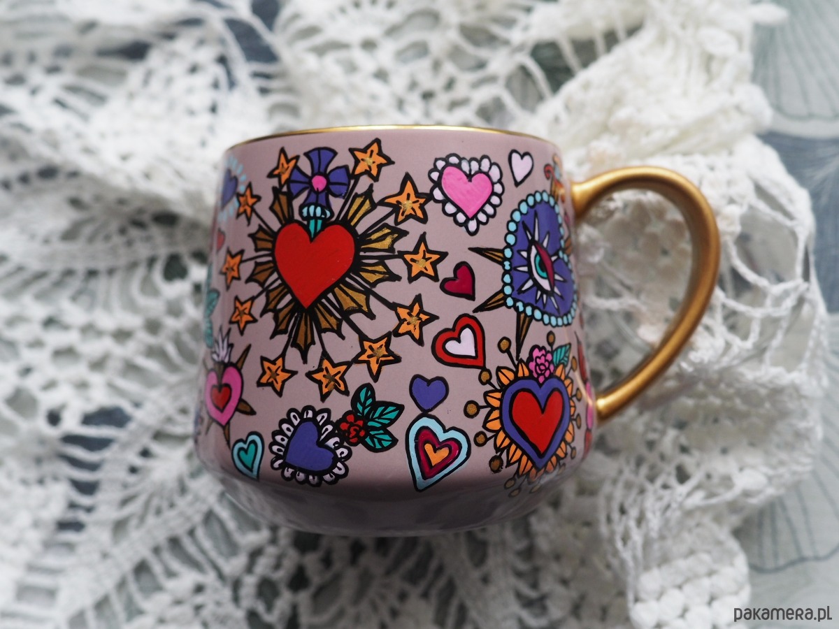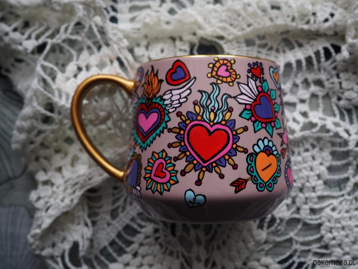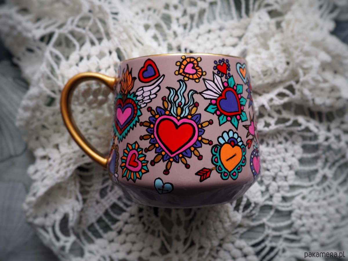Ręcznie malowany kubek w żywych kolorach, z oryginalnym wzorem będzie doskonałym podarunkiem dla osoby kochającej oryginalne przedmioty.